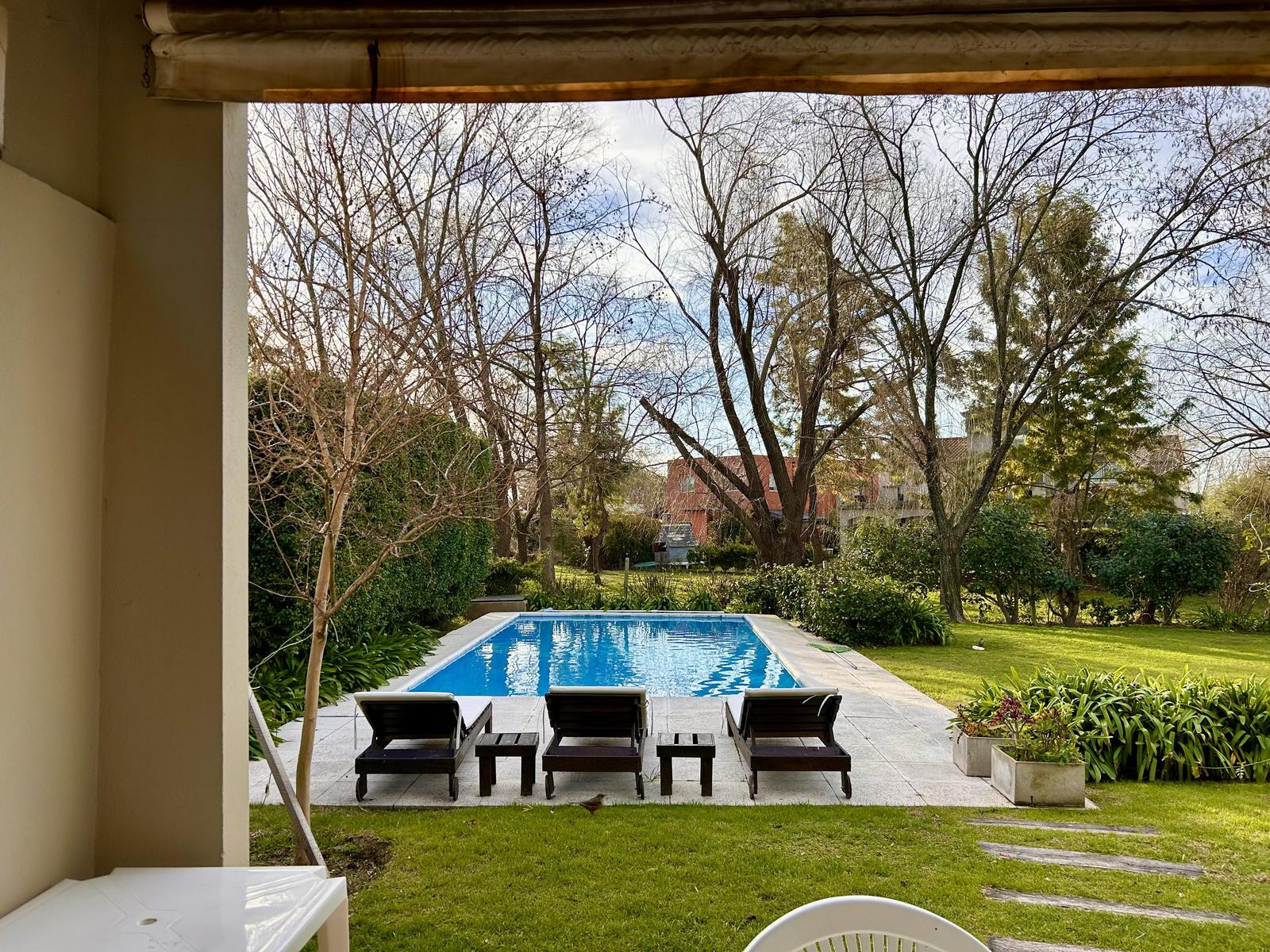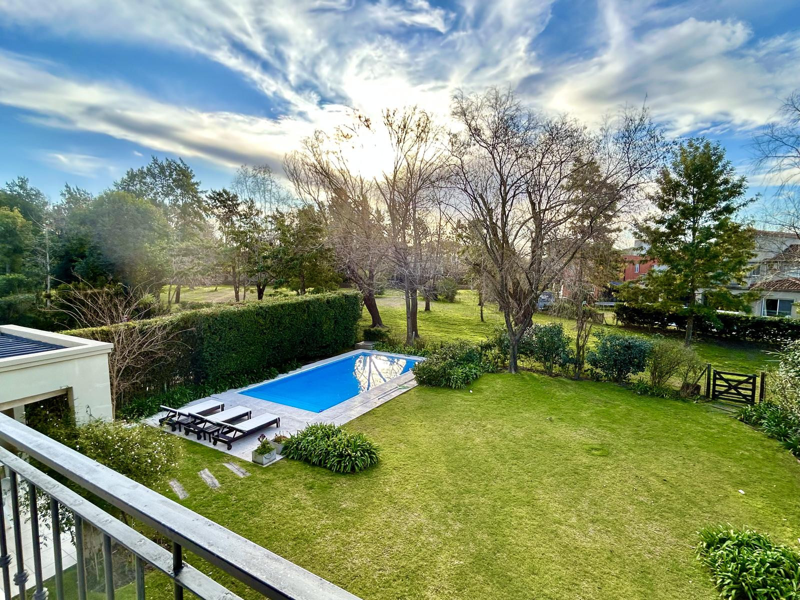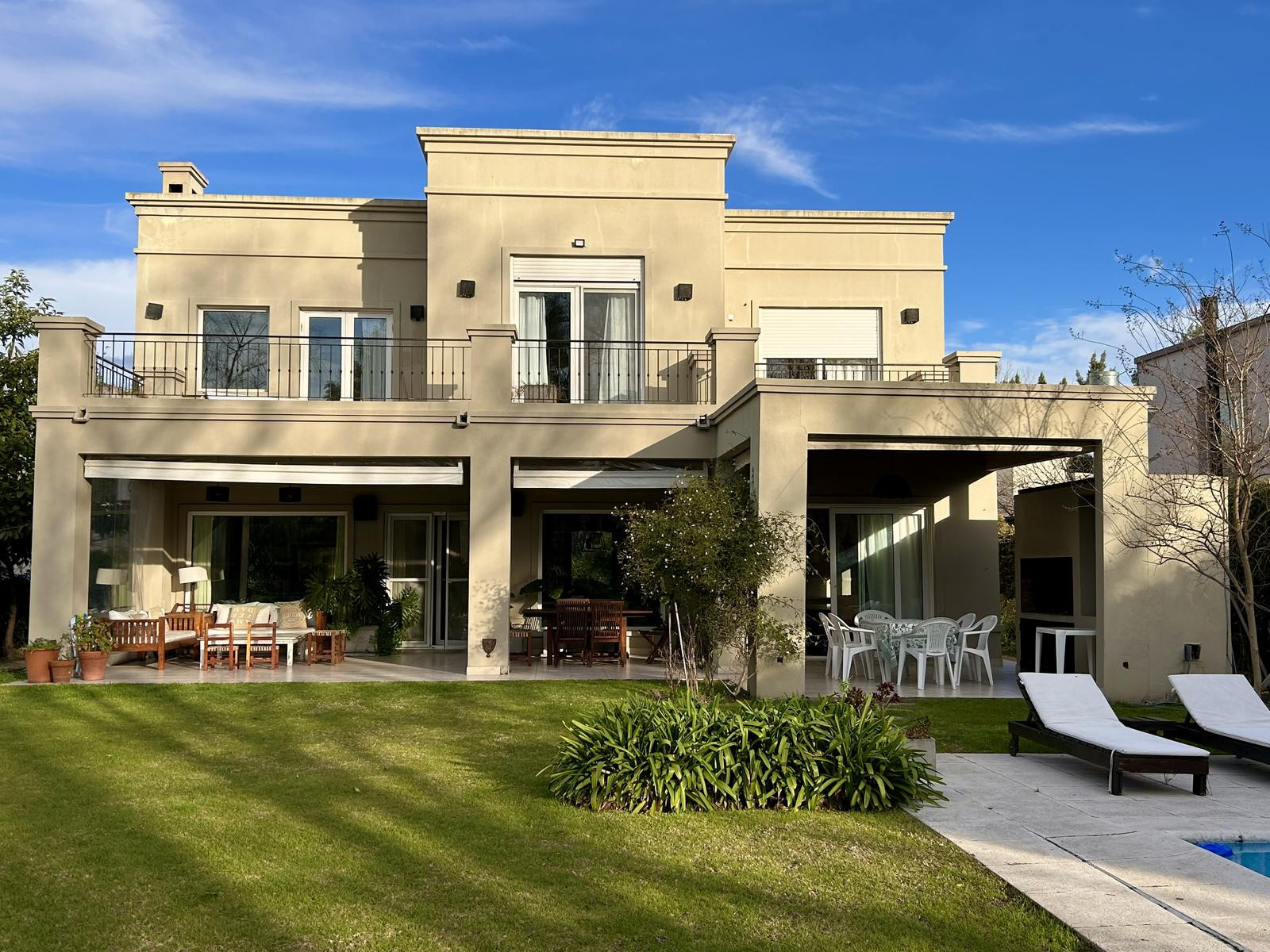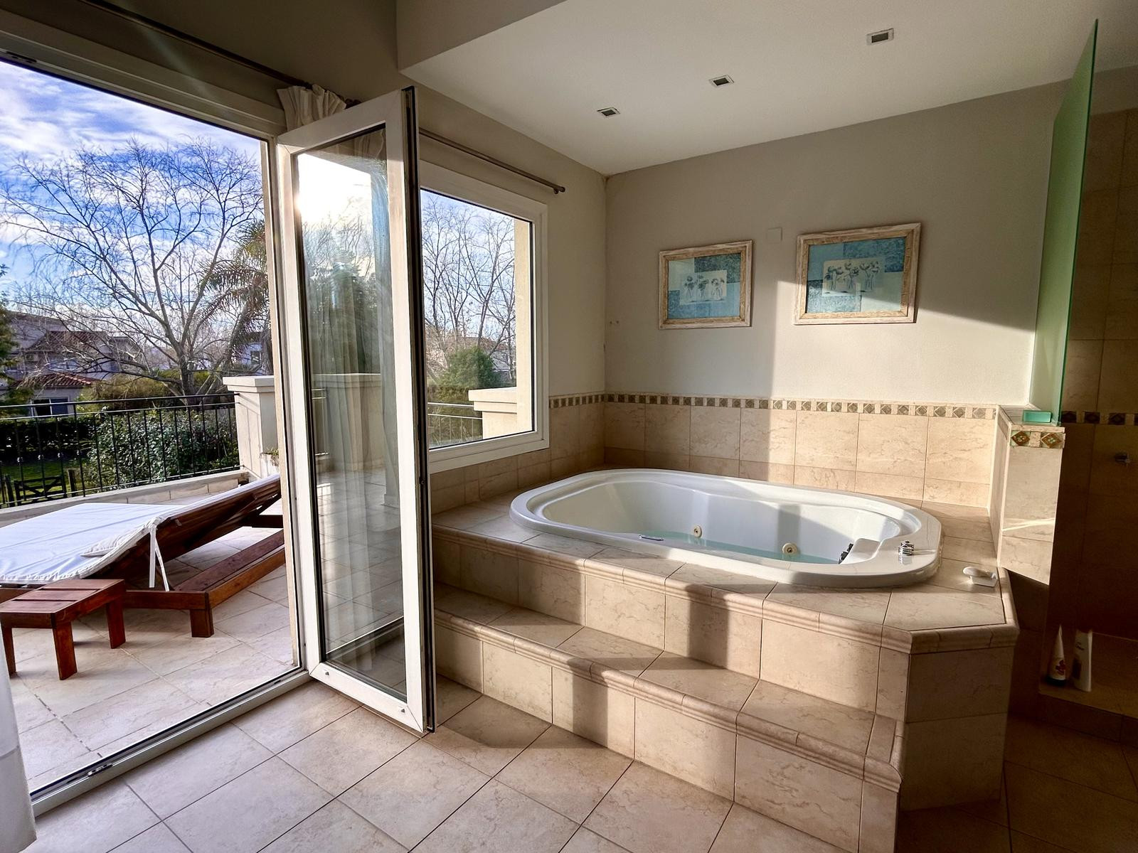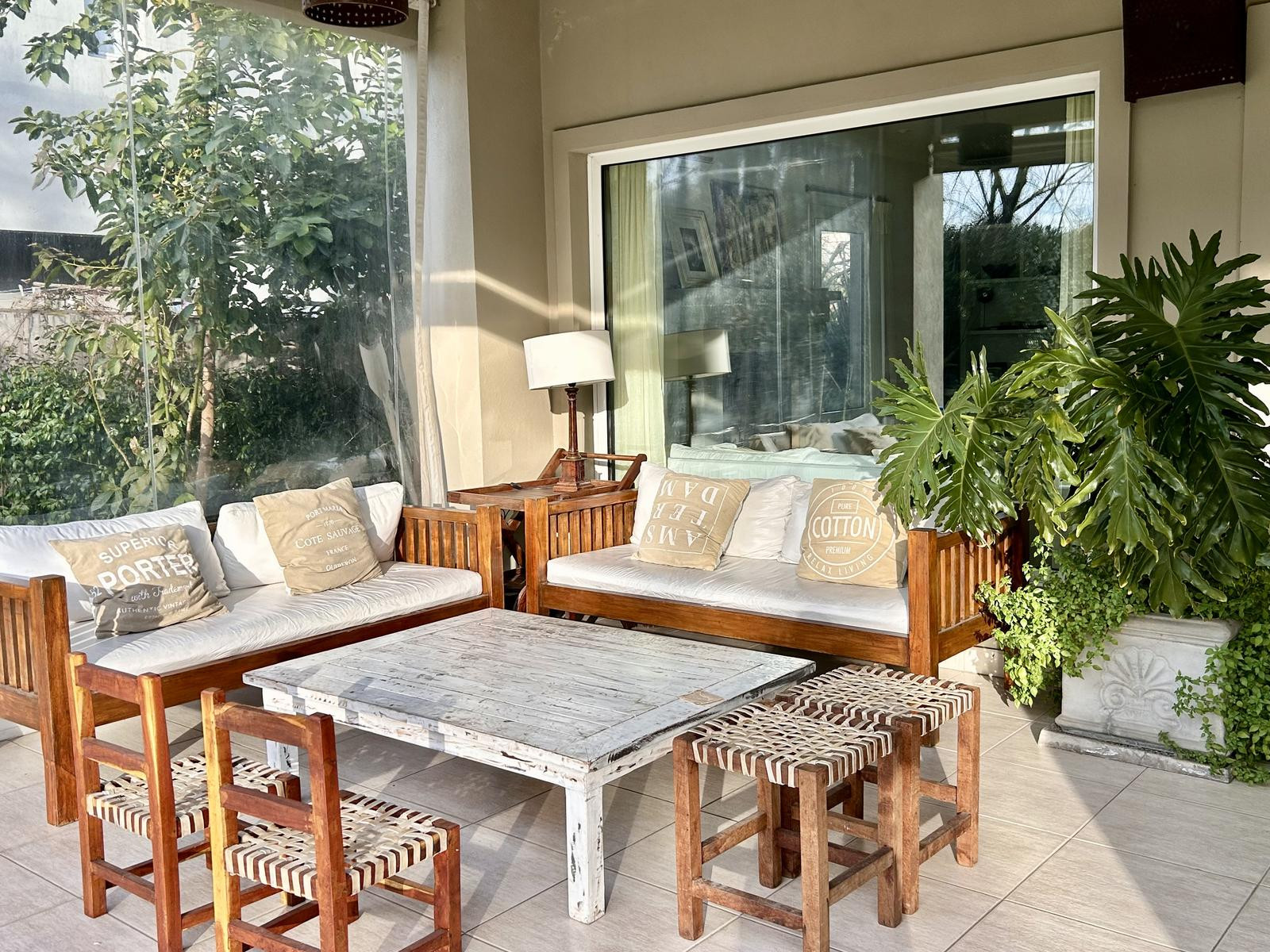 Furnished and equipped four-bedroom house in the gated community Santa Bárbara in Tigre, on a lot with a garden at the back and access to green common space. It has 3 full bathrooms and 1 guest toilet; 2 bedrooms are double en suite and 2 have either a terrace or a balcony. The bathrooms include a jacuzzi; PVC double-glazed windows are installed. The property has a spacious covered gallery with a grill, living and dining areas, plus a service room and an ample garden with direct access to the co