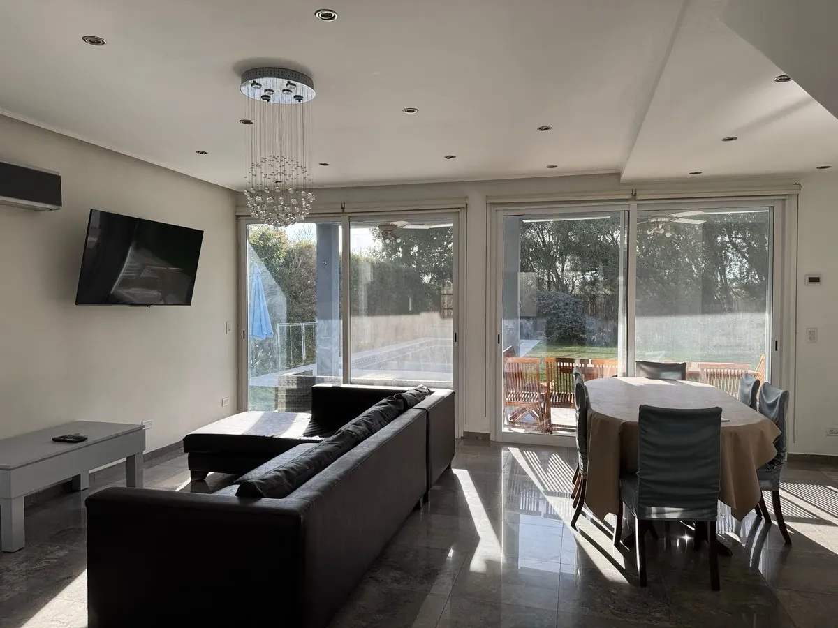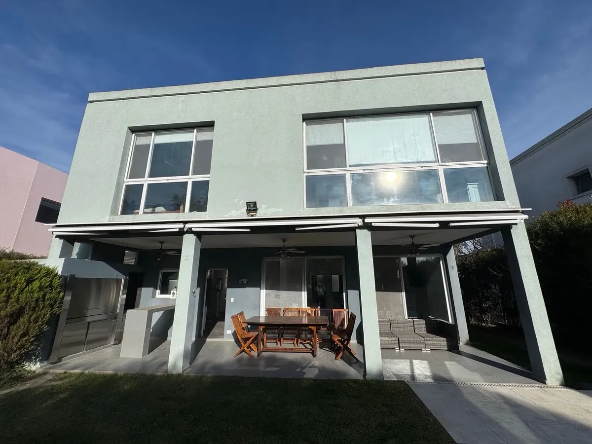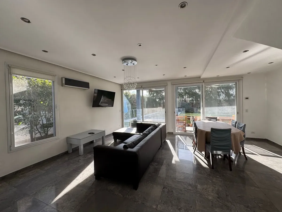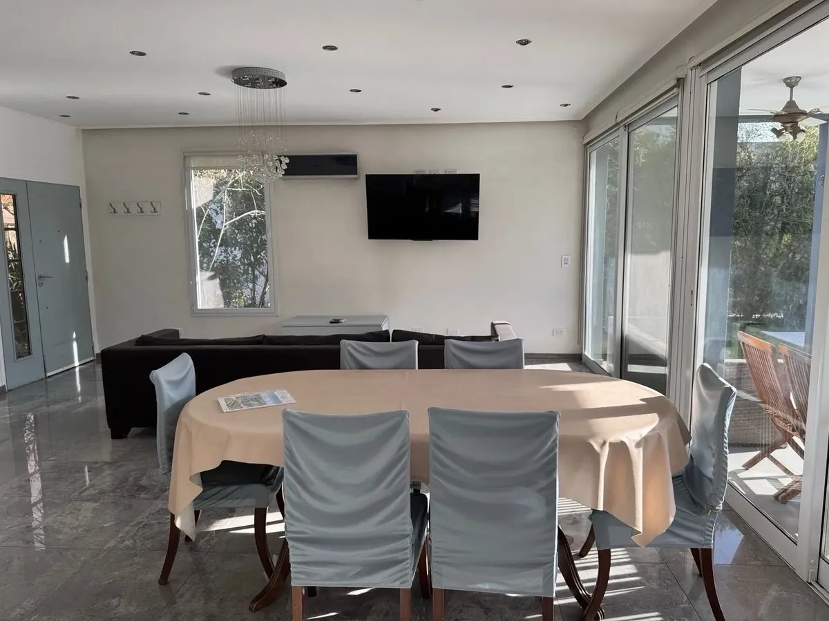 Rationalist-style house fully furnished in the Los Lagos neighbourhood of Tigre. Ground floor has a living room with a 55-inch LED TV, an integrated and partitionable kitchen, a service room with a wardrobe and TV, independent laundry, and 2 bathrooms, plus a steel-grill gallery with a bar and 3 motorised awnings controlled by remote. Heated pool 3.5 x 10 m with a wet solarium and security fence, side parking, dishwasher for 12 place settings, washing machine, refrigerator with freezer and an ad