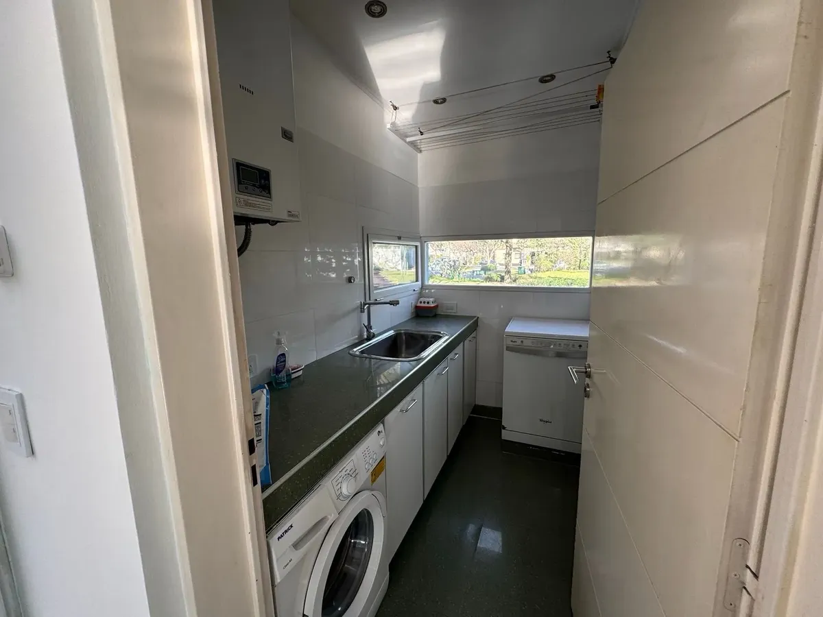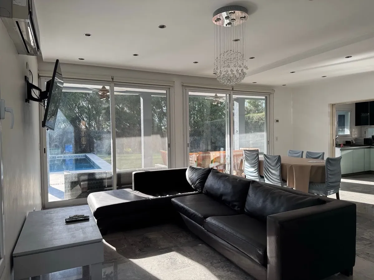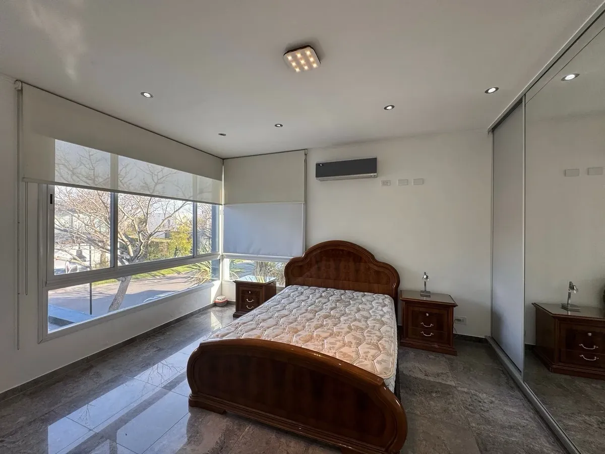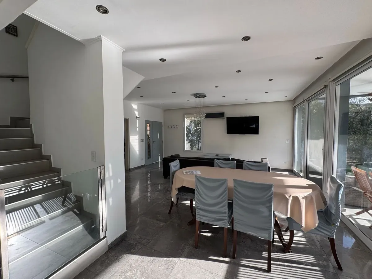 Rationalist-style house fully furnished in the Los Lagos neighbourhood of Tigre. Ground floor has a living room with a 55-inch LED TV, an integrated and partitionable kitchen, a service room with a wardrobe and TV, independent laundry, and 2 bathrooms, plus a steel-grill gallery with a bar and 3 motorised awnings controlled by remote. Heated pool 3.5 x 10 m with a wet solarium and security fence, side parking, dishwasher for 12 place settings, washing machine, refrigerator with freezer and an ad
