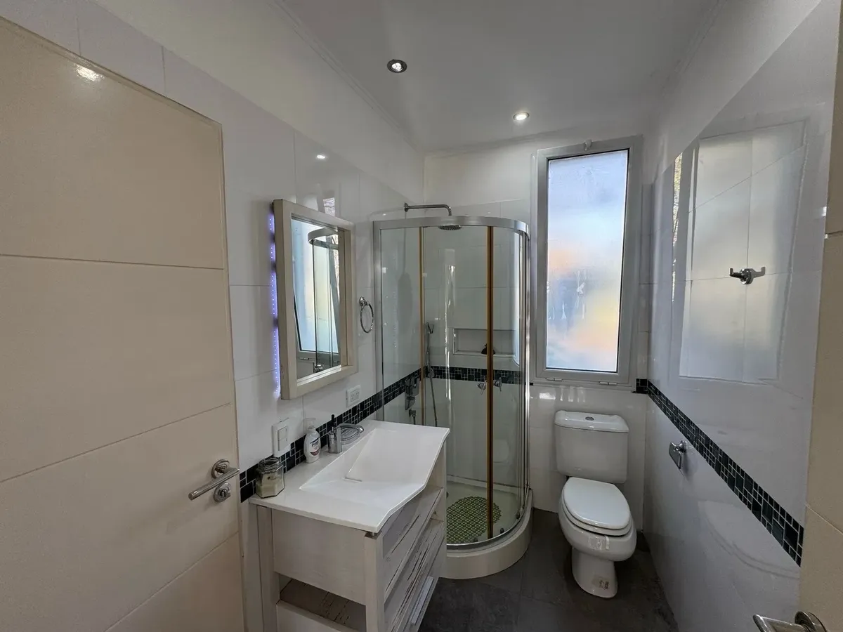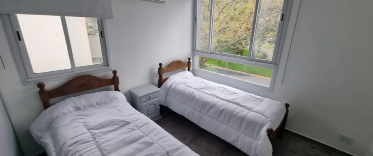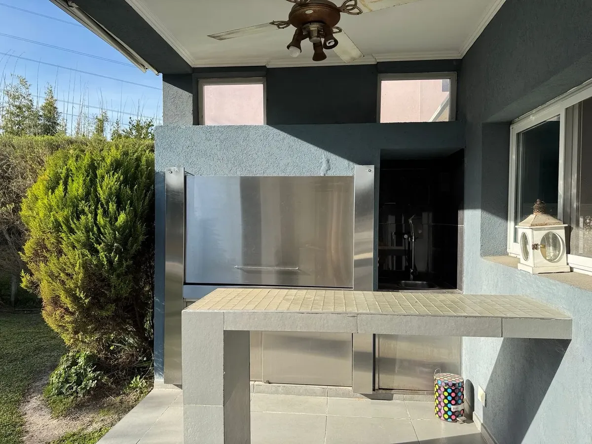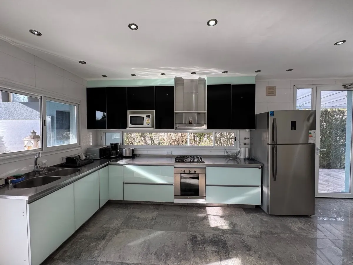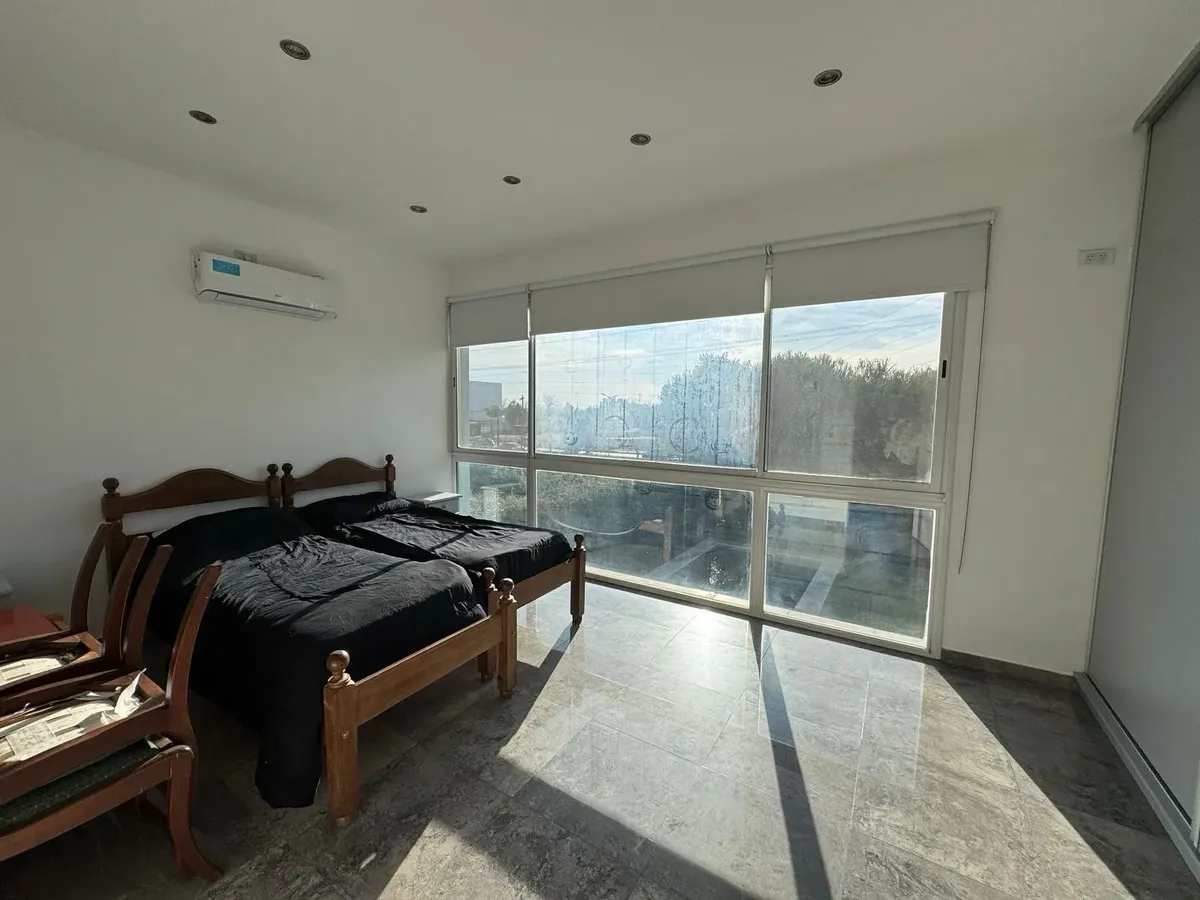 Rationalist-style house fully furnished in the Los Lagos neighbourhood of Tigre. Ground floor has a living room with a 55-inch LED TV, an integrated and partitionable kitchen, a service room with a wardrobe and TV, independent laundry, and 2 bathrooms, plus a steel-grill gallery with a bar and 3 motorised awnings controlled by remote. Heated pool 3.5 x 10 m with a wet solarium and security fence, side parking, dishwasher for 12 place settings, washing machine, refrigerator with freezer and an ad