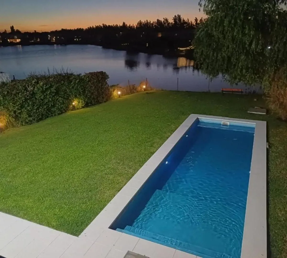 House in Tigre with approximately 300 m² on a plot with direct lake access and views. Ground floor includes a large living-dining room with double-glazed floor-to-ceiling windows, separate dining kitchen, guest toilet, office or family room, and a service dependency with shower bathroom, plus a laundry area, storage room, and covered parking for 3 cars with space for 2 more. Outdoor features include a covered gallery with seating area, a covered grill, and a 4 x 10 metre pool, with Bahia grass a