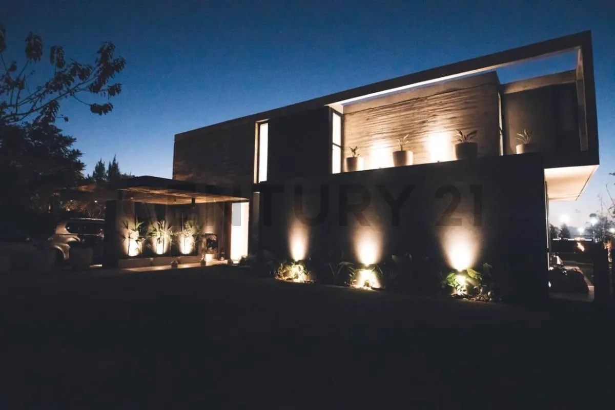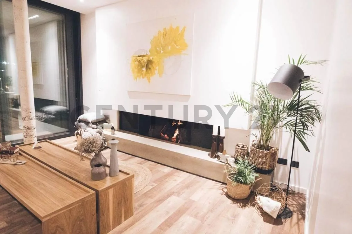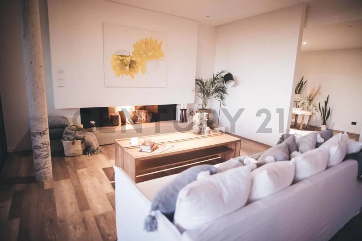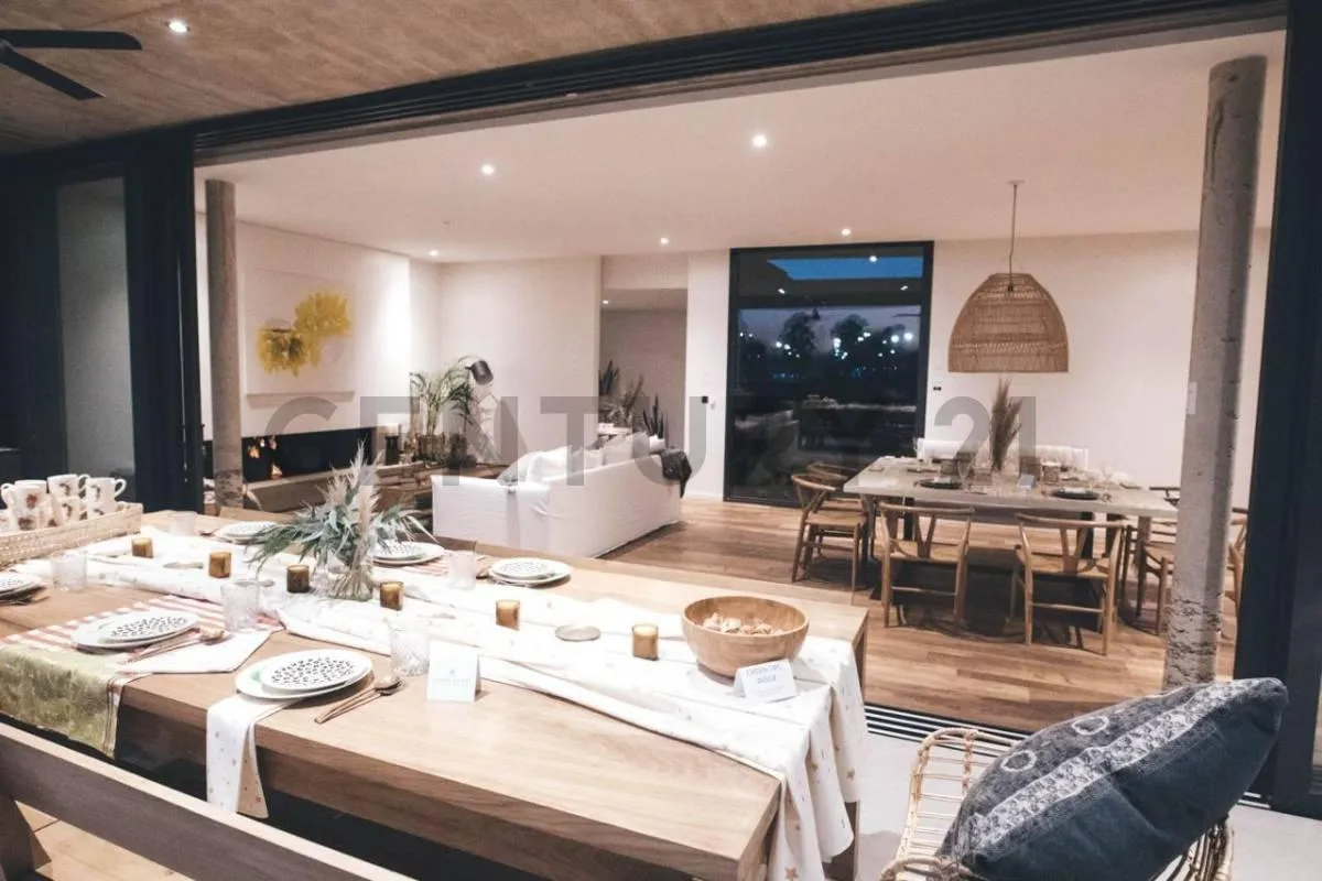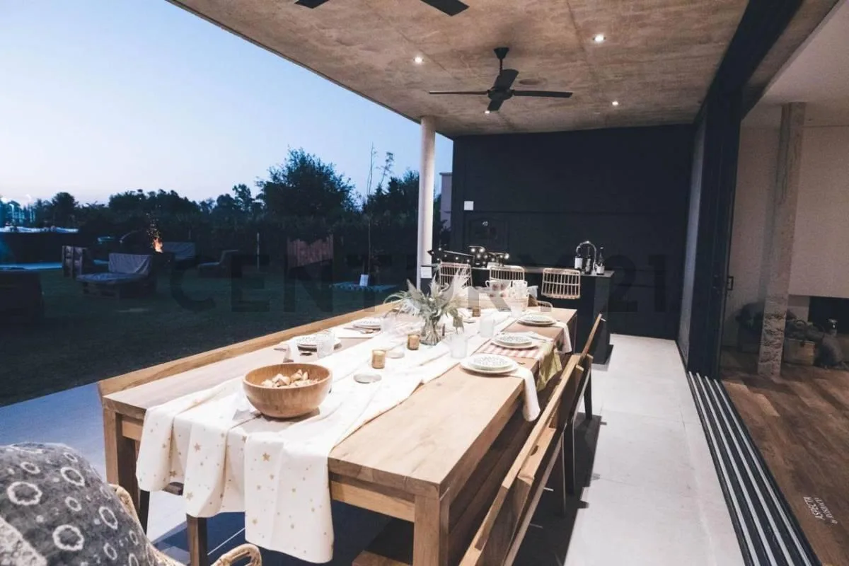 Contemporary four-bedroom house in Windbells (Buenvista), on a closed residential complex in Victoria, semi-furnished. Built in 2019, it features a living-dining room with a wood-burning fireplace, a kitchen with a central island, and a covered gallery with a grill. The layout includes a primary suite with dressing room, a second en-suite bedroom, two additional bedrooms with an en-suite bathroom shared between them, plus a multifunction room that can be used as an office or playroom, a laundry