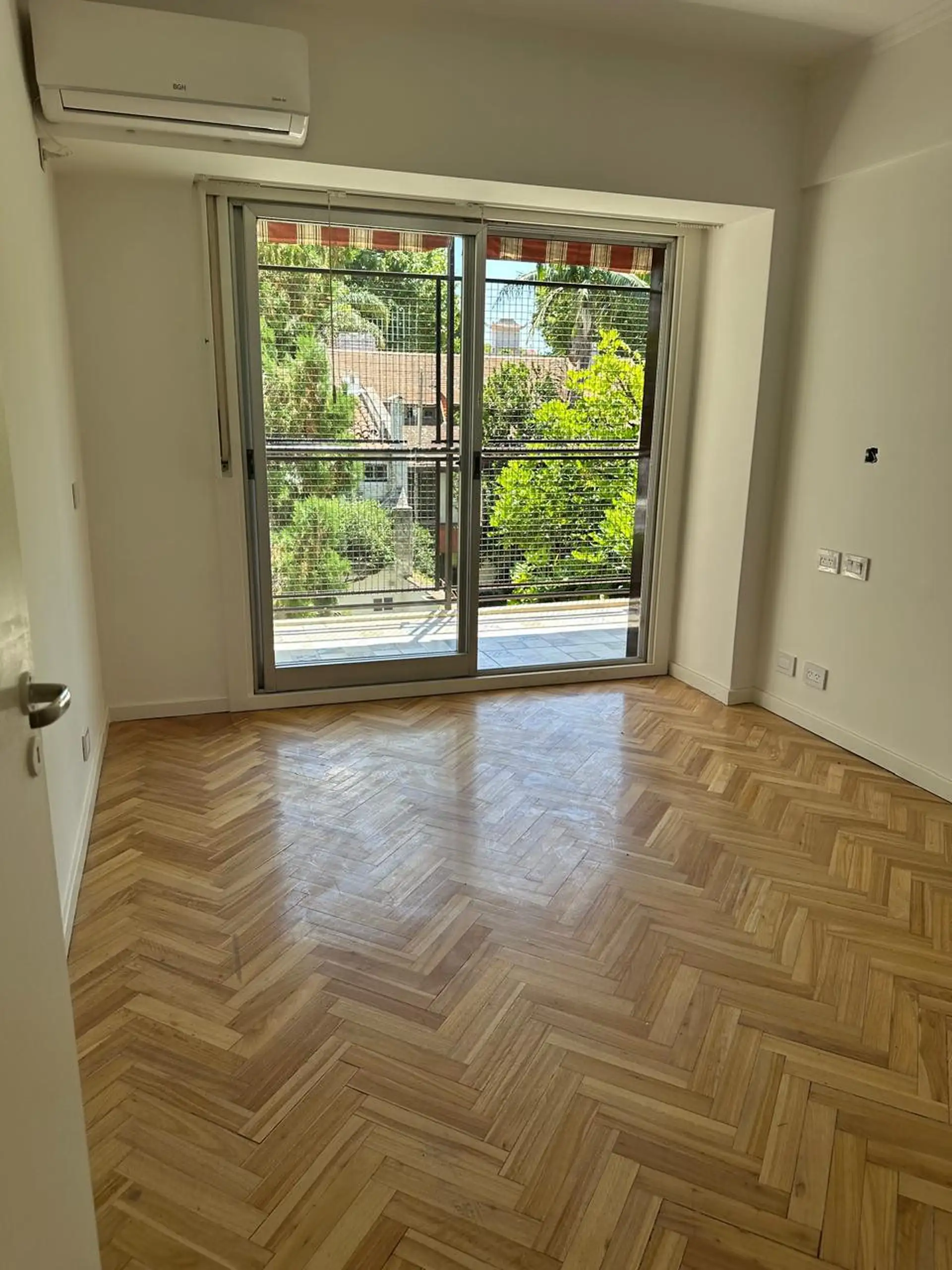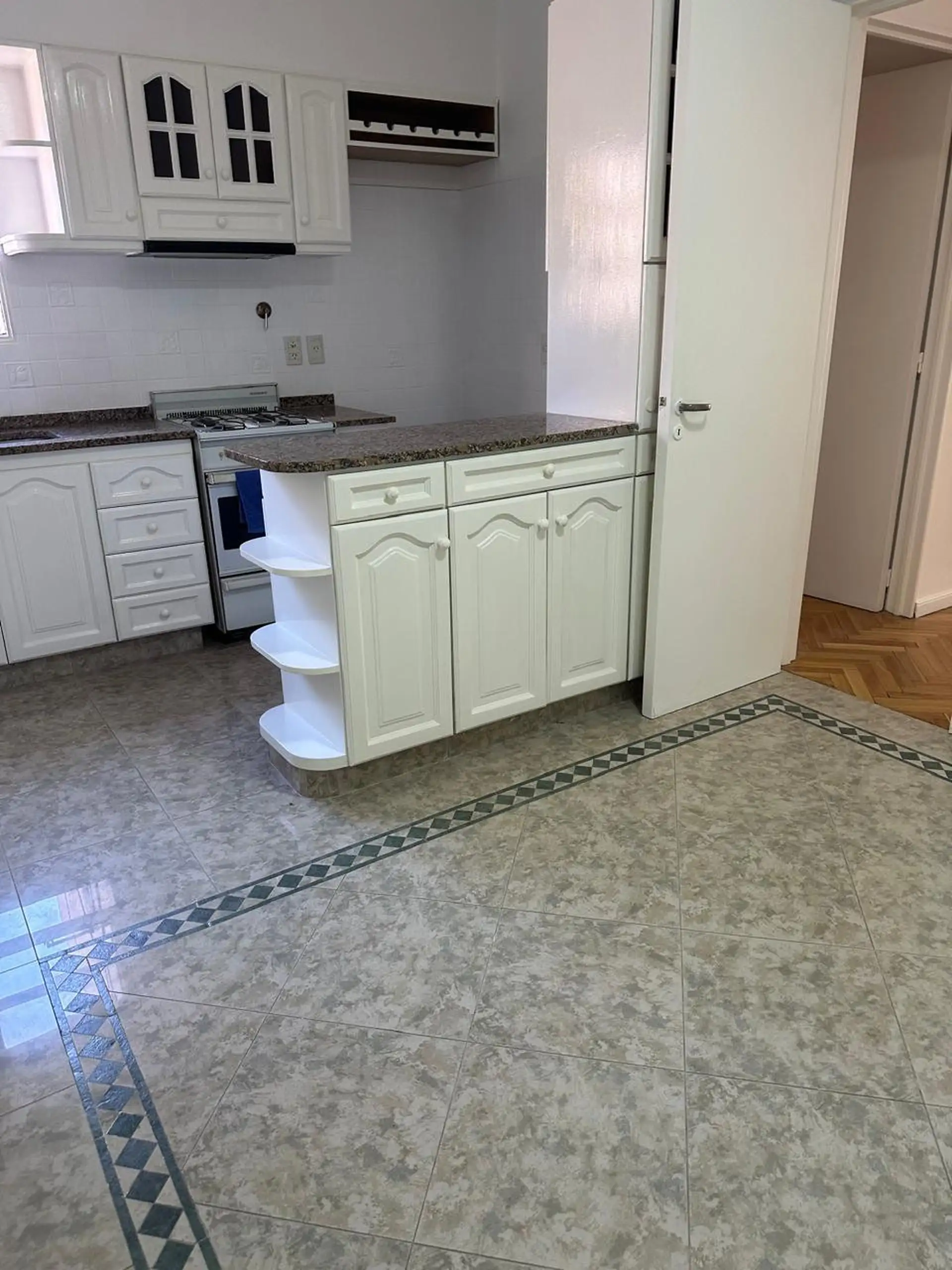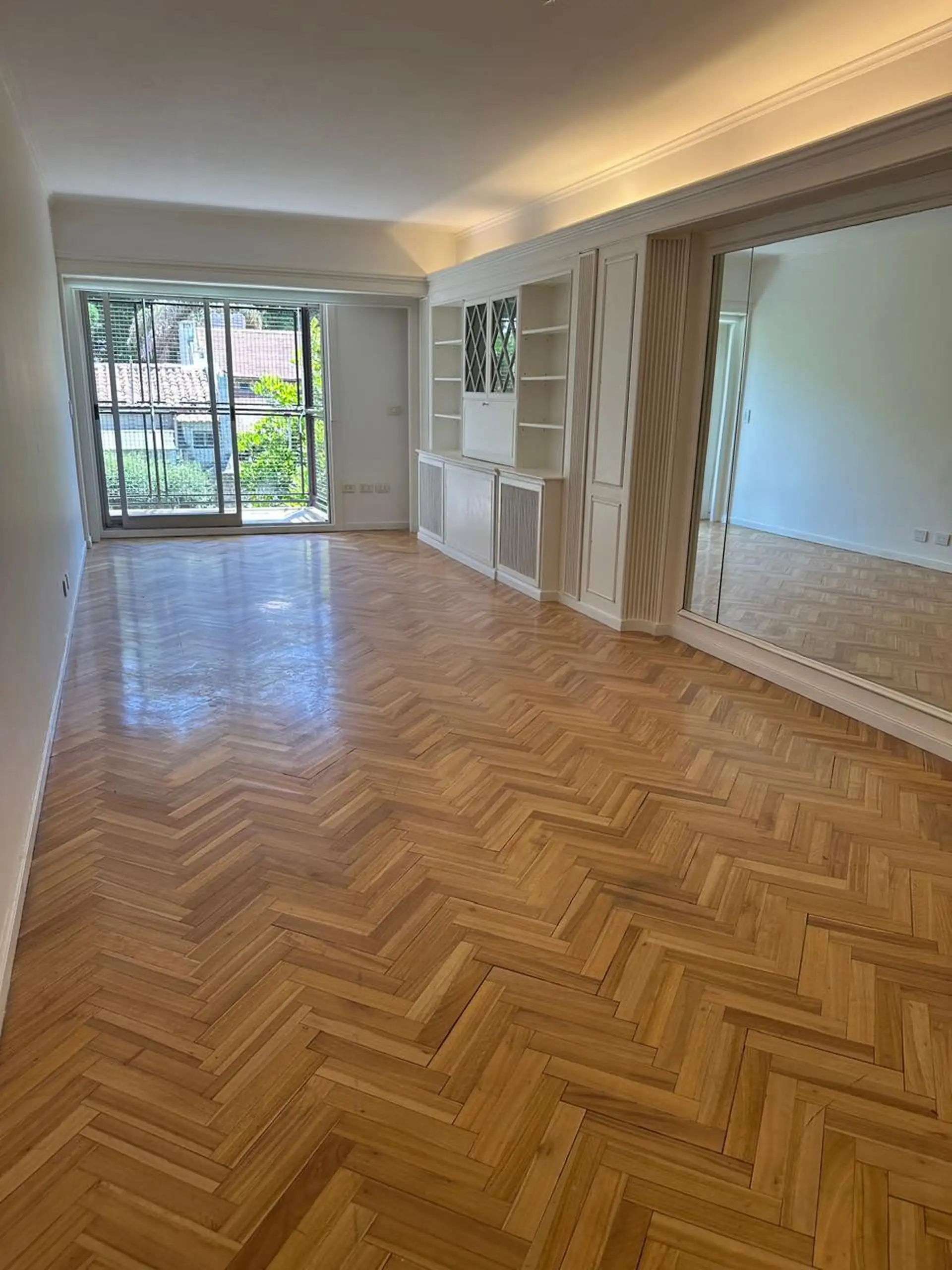 Five-room apartment of 110 m², street-facing to Plaza Devoto with an open view and green surroundings. It has 4 bedrooms, including a primary suite with dressing room, a bright living room, and a dining kitchen. Features include a separate laundry room, service entrance, a spacious balcony, storage room (baulera) and parking (cochera), with low building fees (expensas).