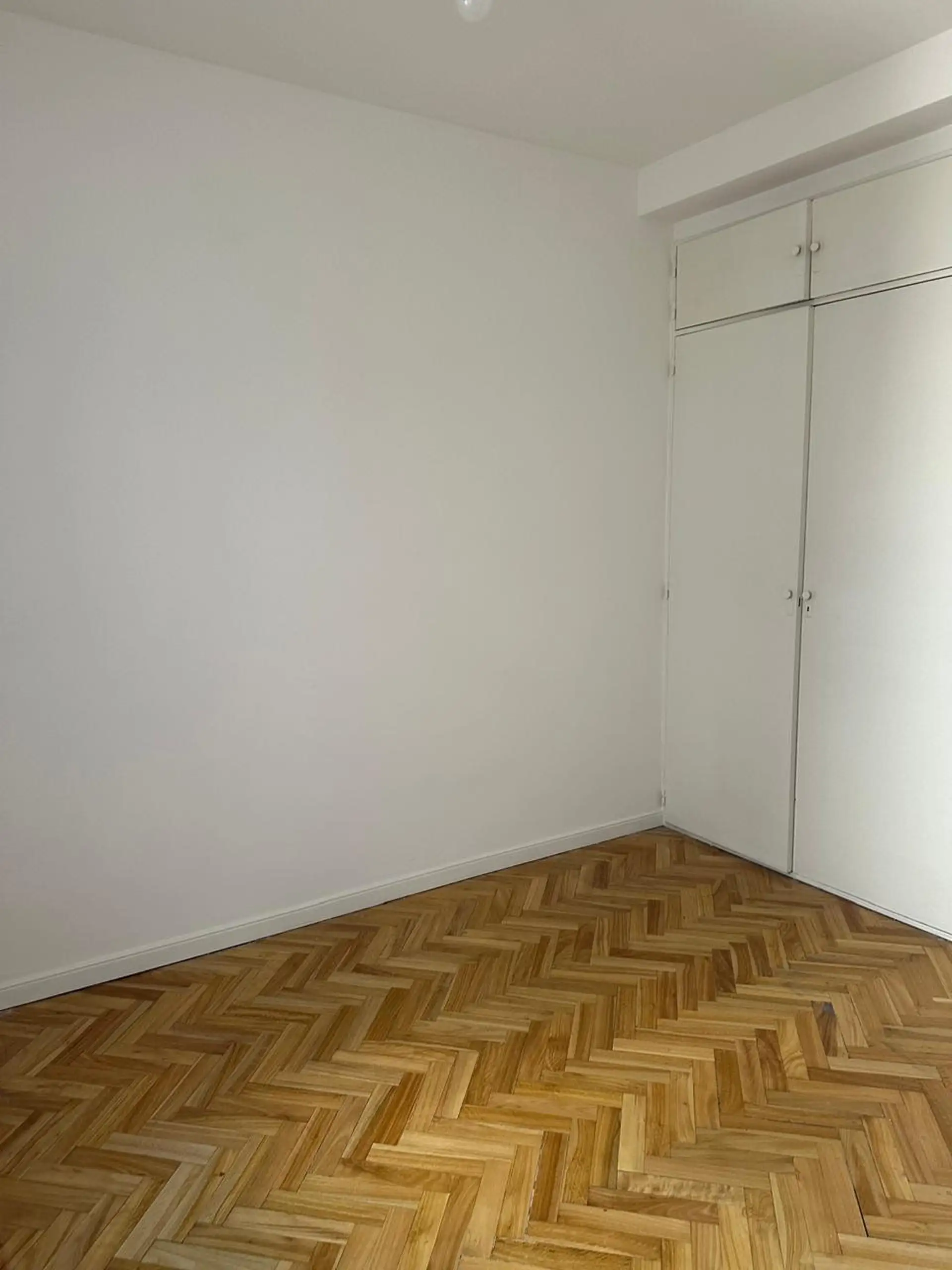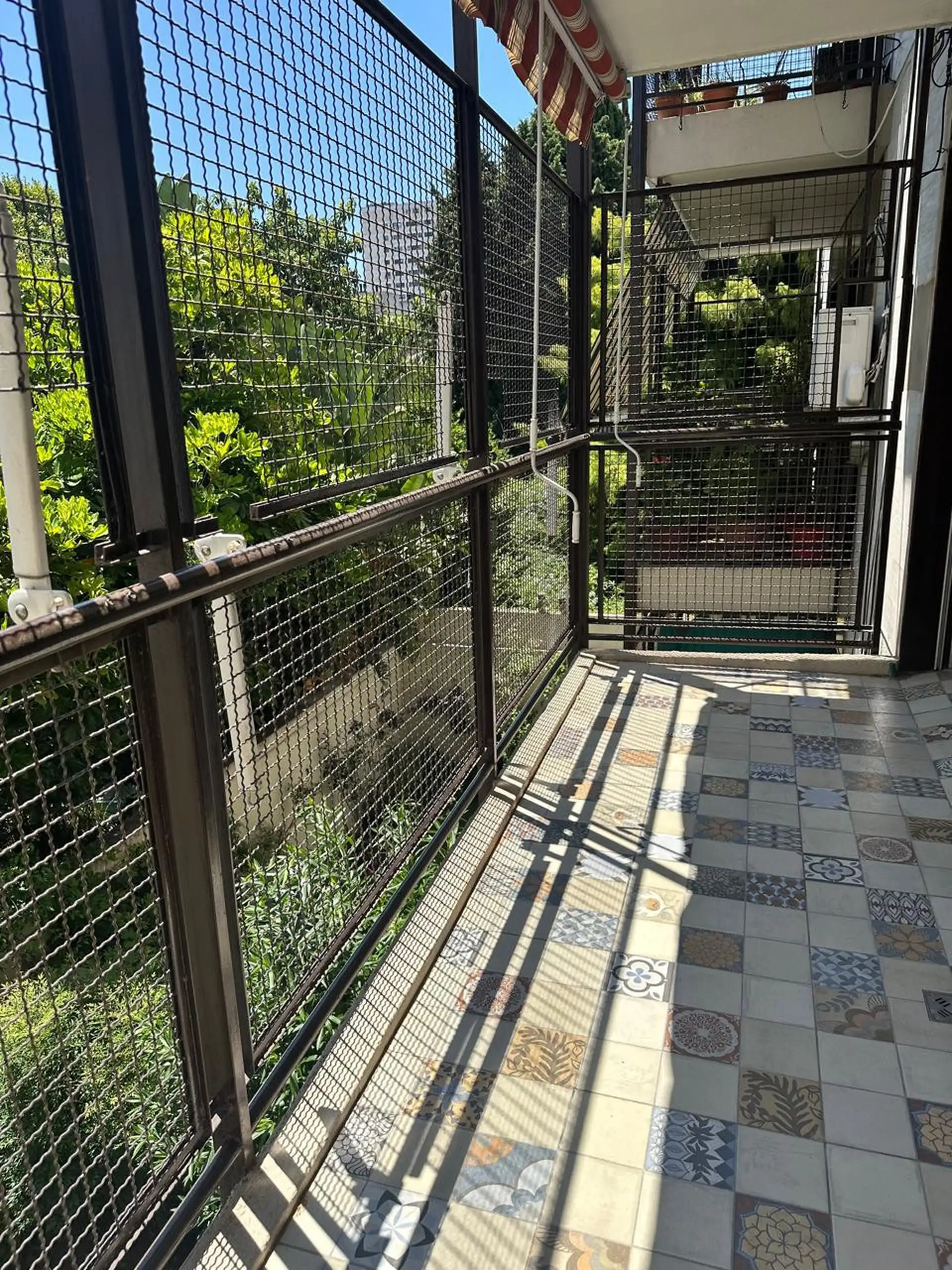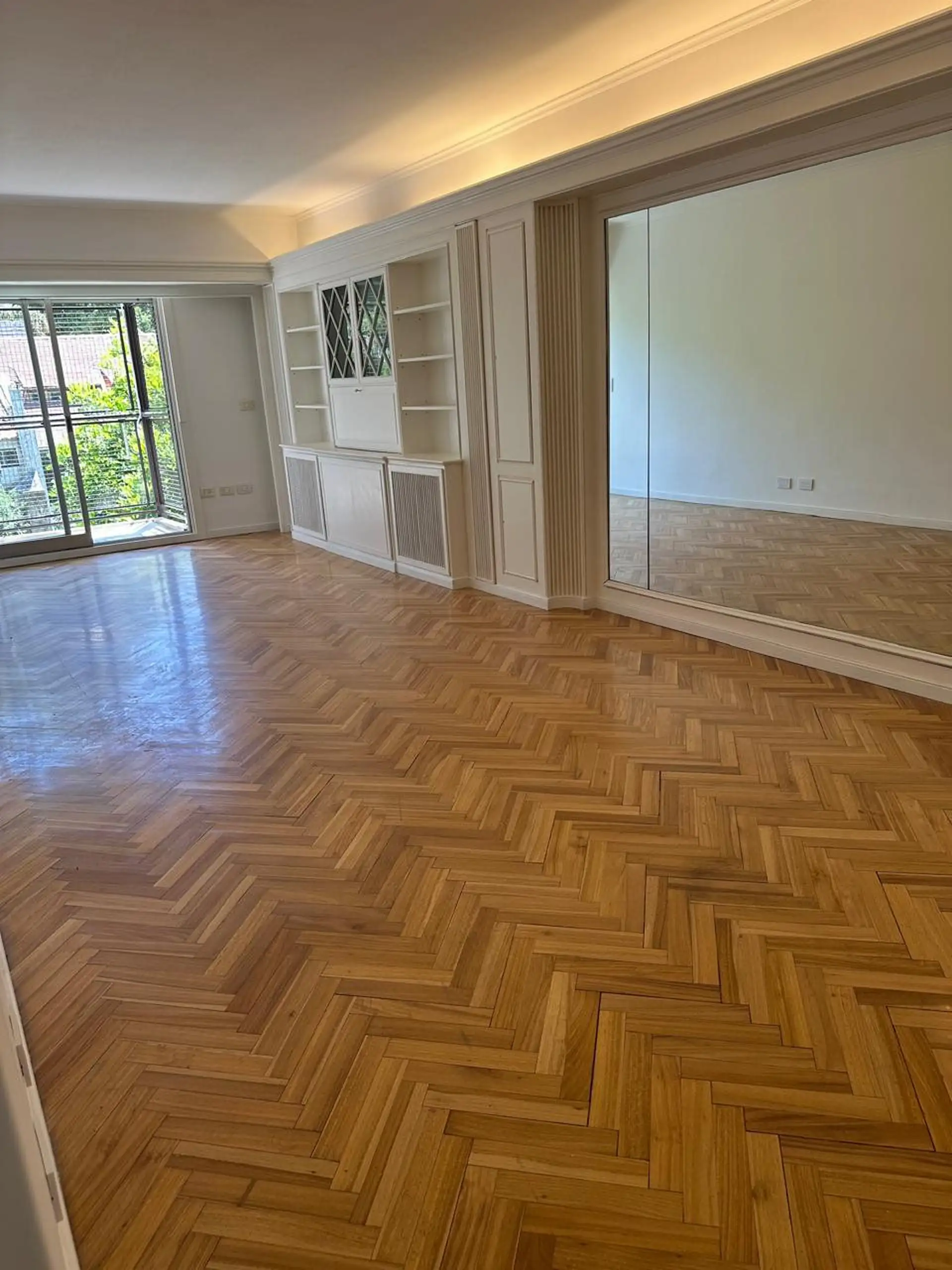 Five-room apartment of 110 m², street-facing to Plaza Devoto with an open view and green surroundings. It has 4 bedrooms, including a primary suite with dressing room, a bright living room, and a dining kitchen. Features include a separate laundry room, service entrance, a spacious balcony, storage room (baulera) and parking (cochera), with low building fees (expensas).