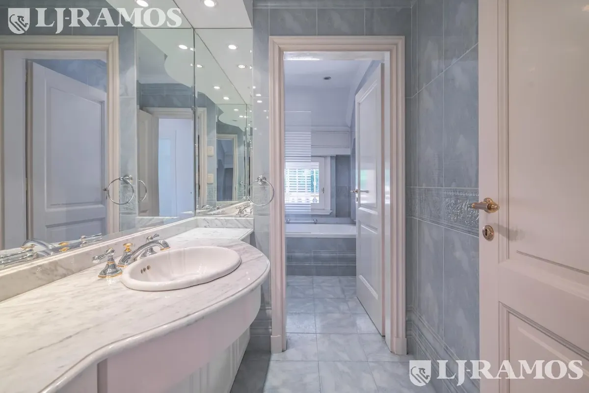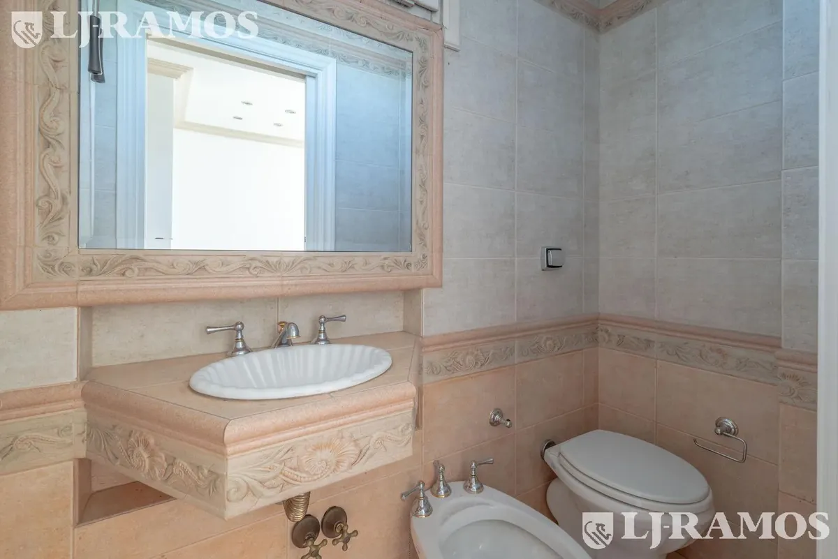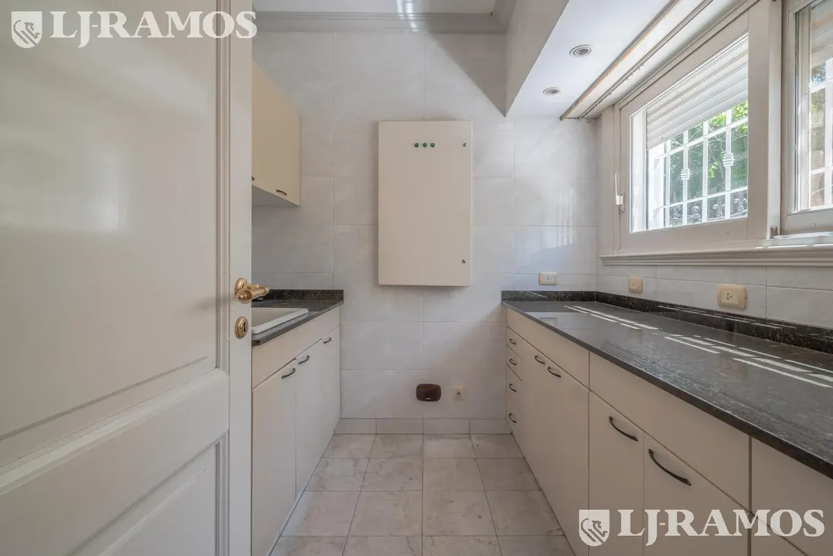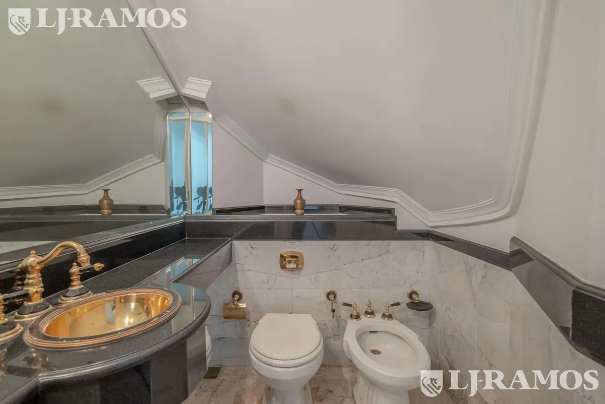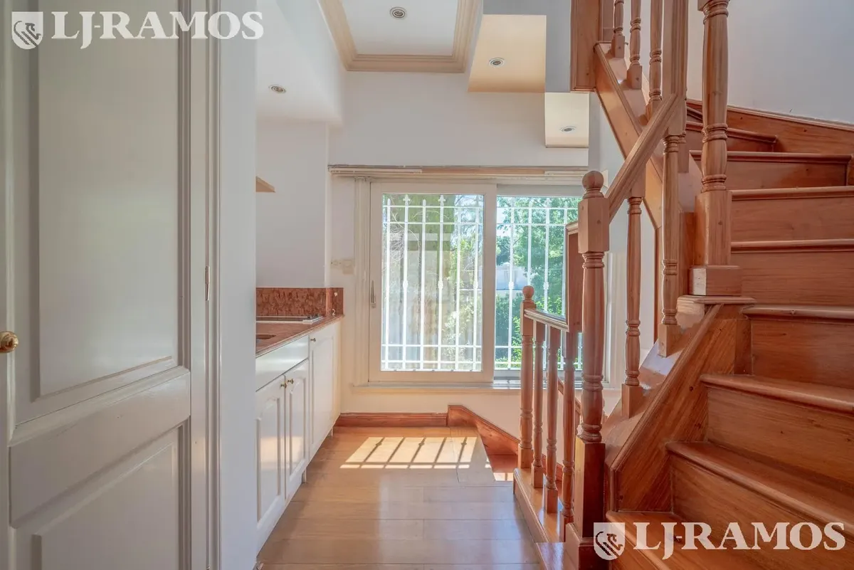 House for rent in Beccar, arranged over three storeys and built 25 years ago with maintenance described as very good. Ground floor has an entrance hall, large living room with fireplace and large windows opening to the external covered gallery, a separate dining room, a large office facing the street, a guest toilet with marble vanity, a kitchen with a black marble worktop, white cabinetry and a central island, plus a laundry area with a chute for dirty laundry and a wine storage space. Upper fl
