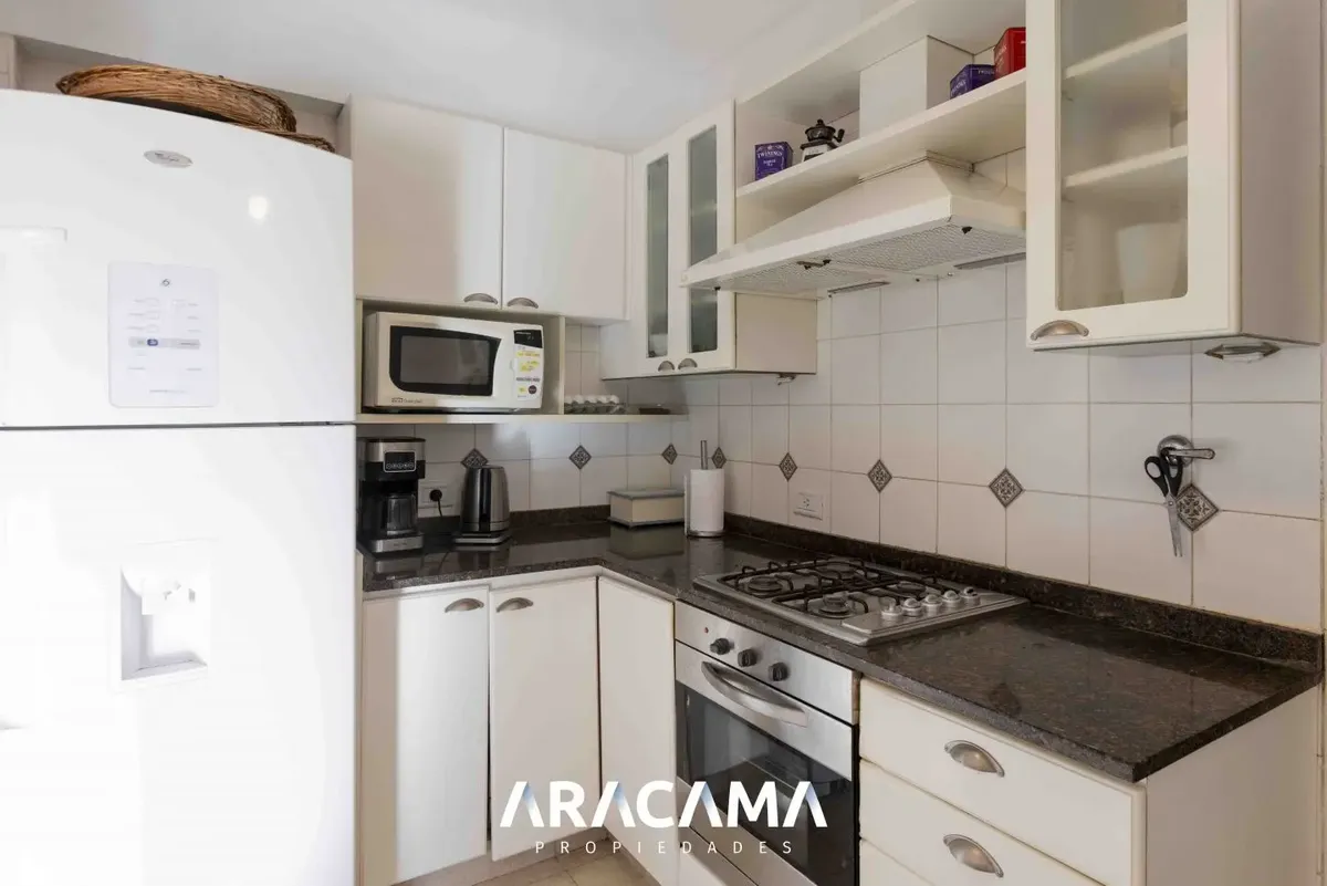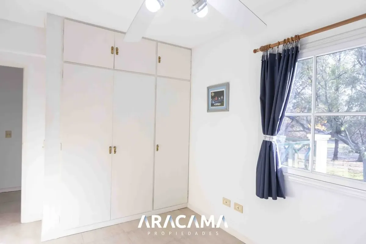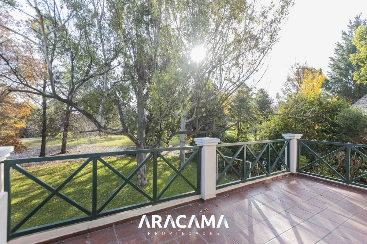 House for rent in Saint Thomas Norte, Esteban Echeverría. Set on an 800 m² lot (20 x 40) with a garden facing the golf course; 205 m² covered across 2 floors. Ground floor includes a reception toilet, open-plan living-dining area with integrated kitchen, wood-burning fireplace, laundry with independent access from the covered garage, staff quarters with private bathroom, and a study or bedroom with a fitted wardrobe, plus storage under the stairs and a covered gallery with a grill. Upper floor h