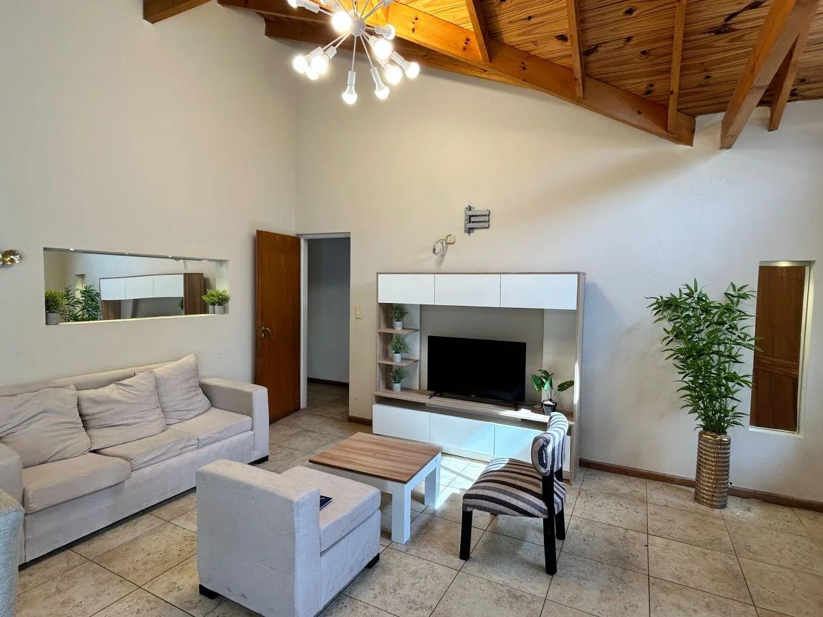 Single-storey house in Brickland, a closed neighbourhood in Esteban Echeverría. The property has 5 bedrooms and 3 bathrooms on an 800 m² lot. It is furnished and includes a covered gallery with a grill, a fenced in-ground concrete pool, a covered carport for 2 cars, and a free landscaped garden area. Interior features include a living-dining and kitchen with a cooker, air extractor, wall cabinets and under-counter units; 4 bedrooms with built-in wardrobes; 2 bathrooms with a separate antechamber