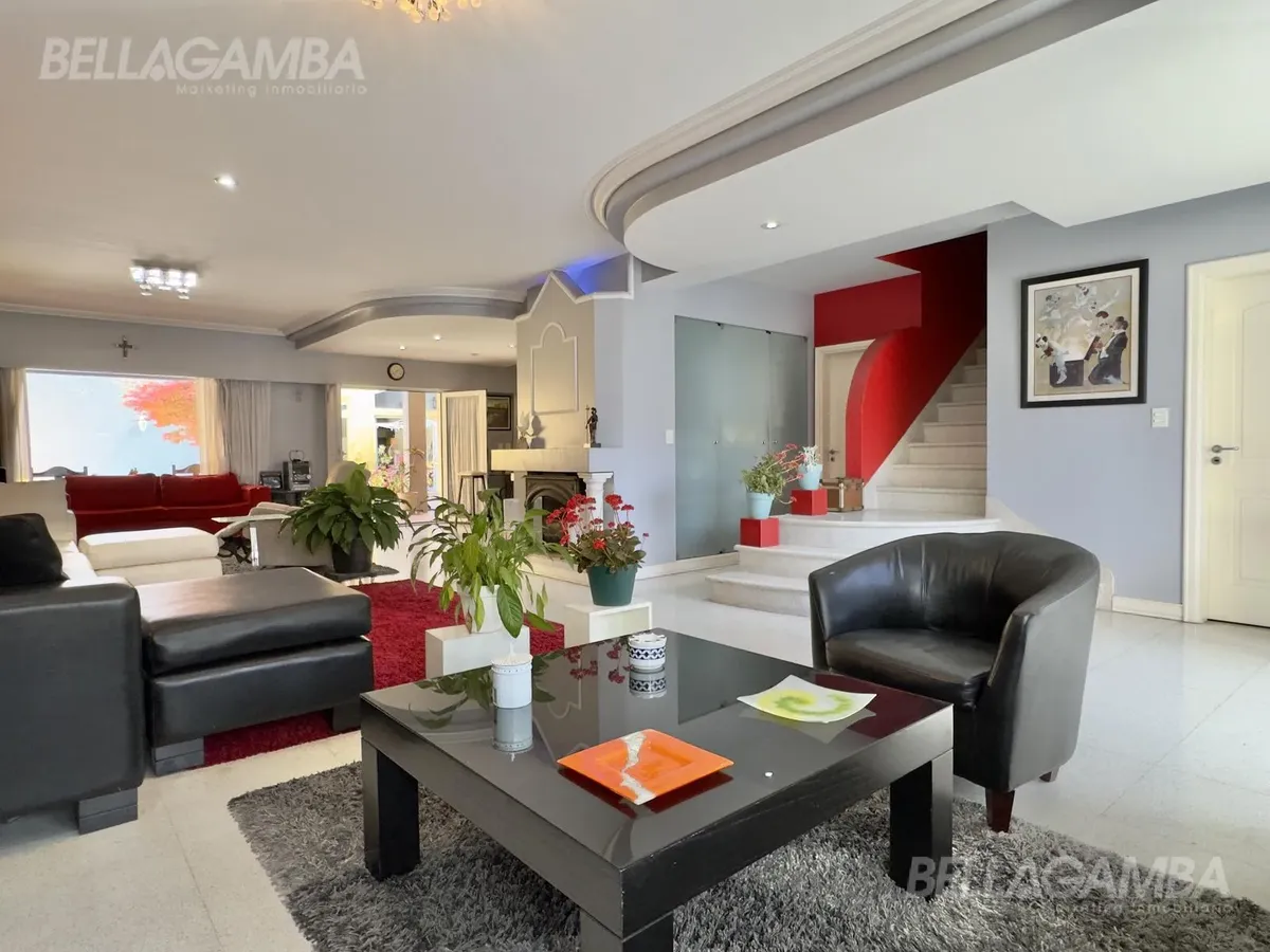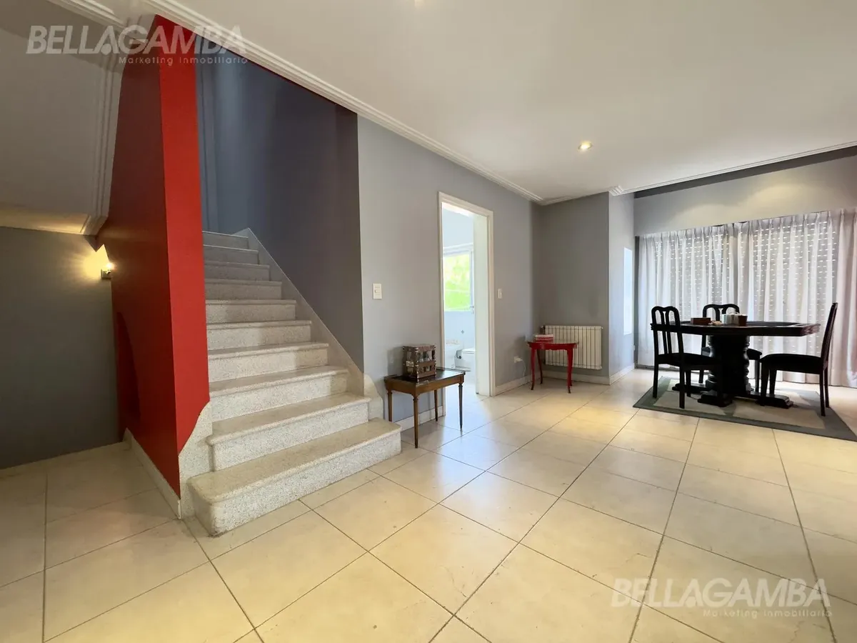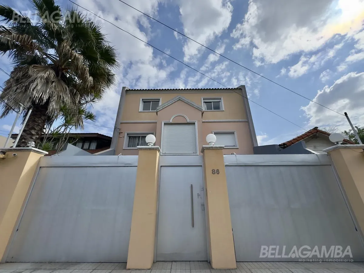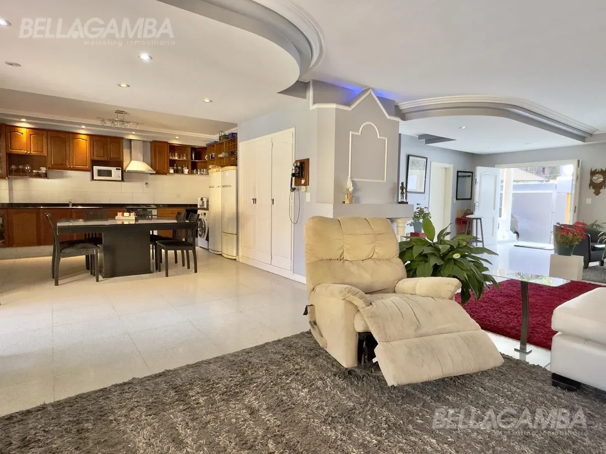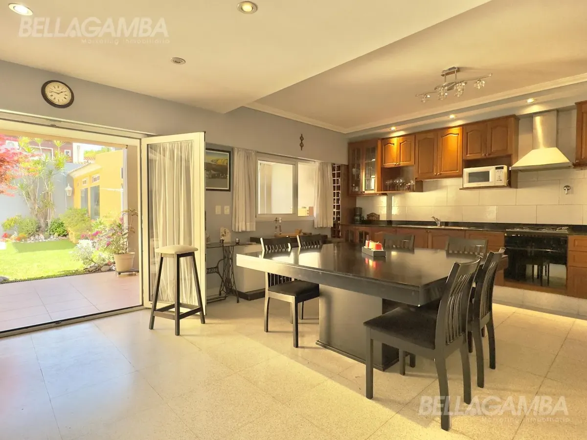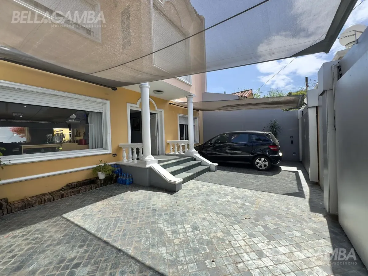 Six-room apartment-style house for rent in Florida, arranged over 3 floors with a semi-covered garage for 2 cars. The property has 300 m² of land and 341 m² of covered area, with street frontage and a semi-covered front parking/driveway area, plus a pedestrian entrance. Ground floor includes a large living-dining area and open-plan family room with garden views, a full bathroom, a front bedroom or office with built-in closet, a large kitchen with pantry, an enclosed gallery with security metal r