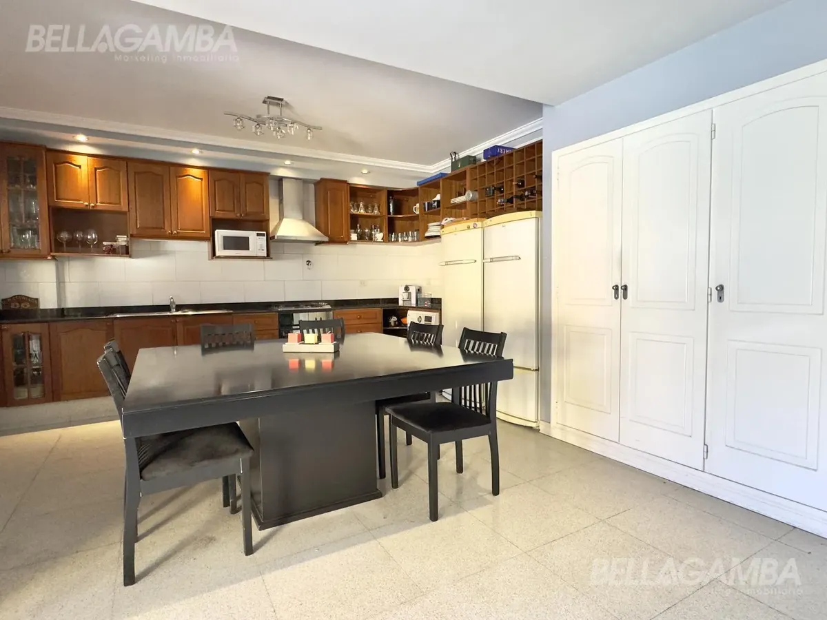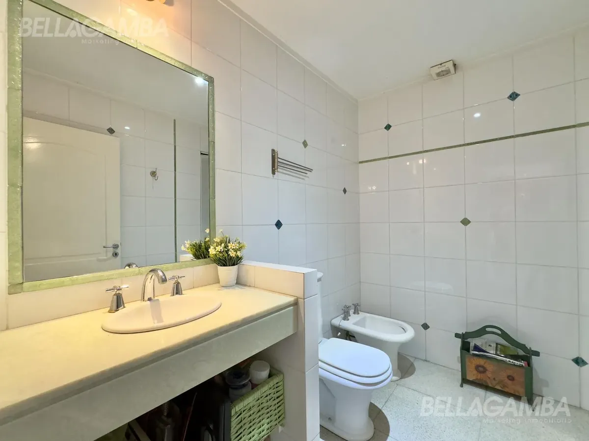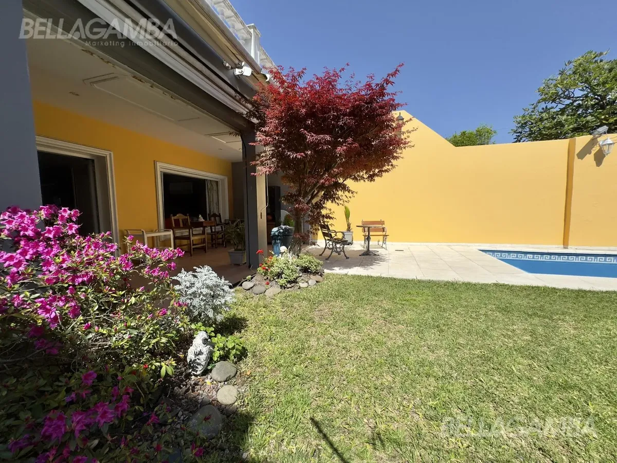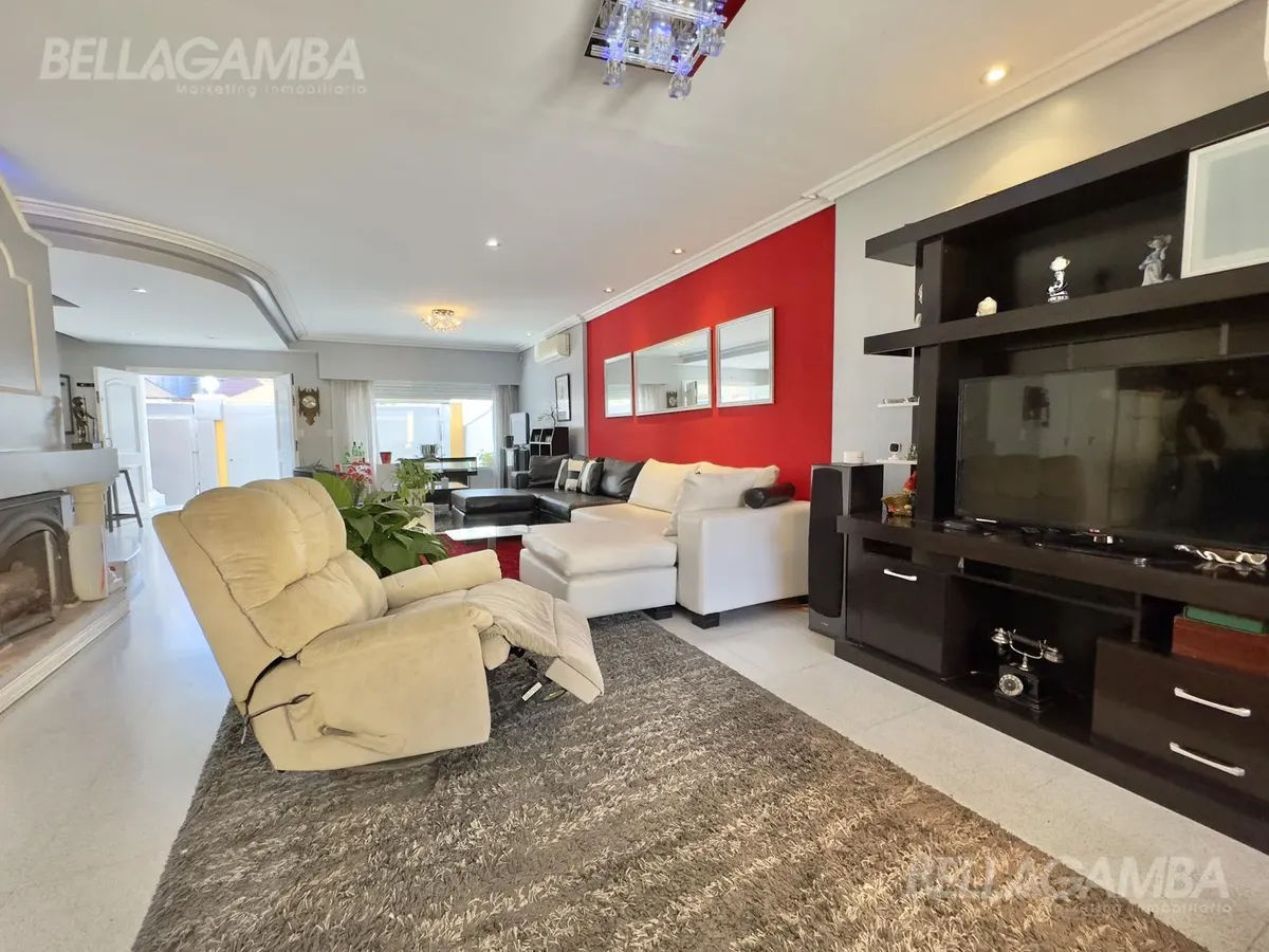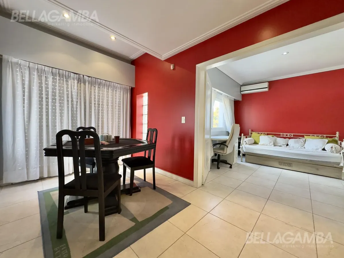 Six-room apartment-style house for rent in Florida, arranged over 3 floors with a semi-covered garage for 2 cars. The property has 300 m² of land and 341 m² of covered area, with street frontage and a semi-covered front parking/driveway area, plus a pedestrian entrance. Ground floor includes a large living-dining area and open-plan family room with garden views, a full bathroom, a front bedroom or office with built-in closet, a large kitchen with pantry, an enclosed gallery with security metal r