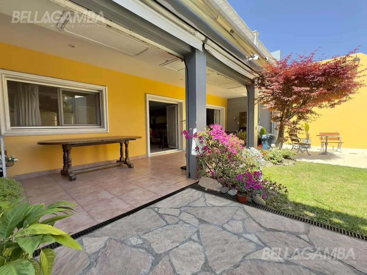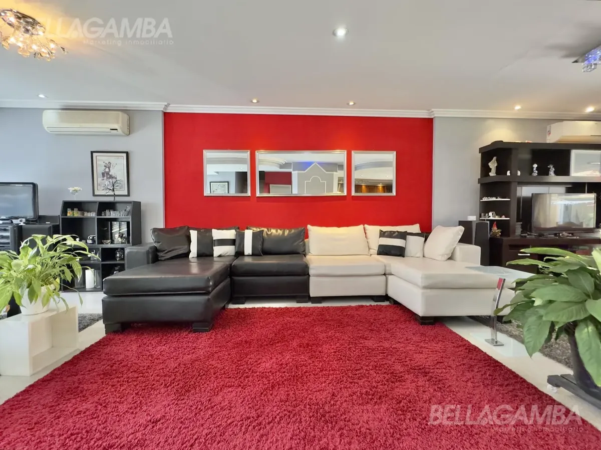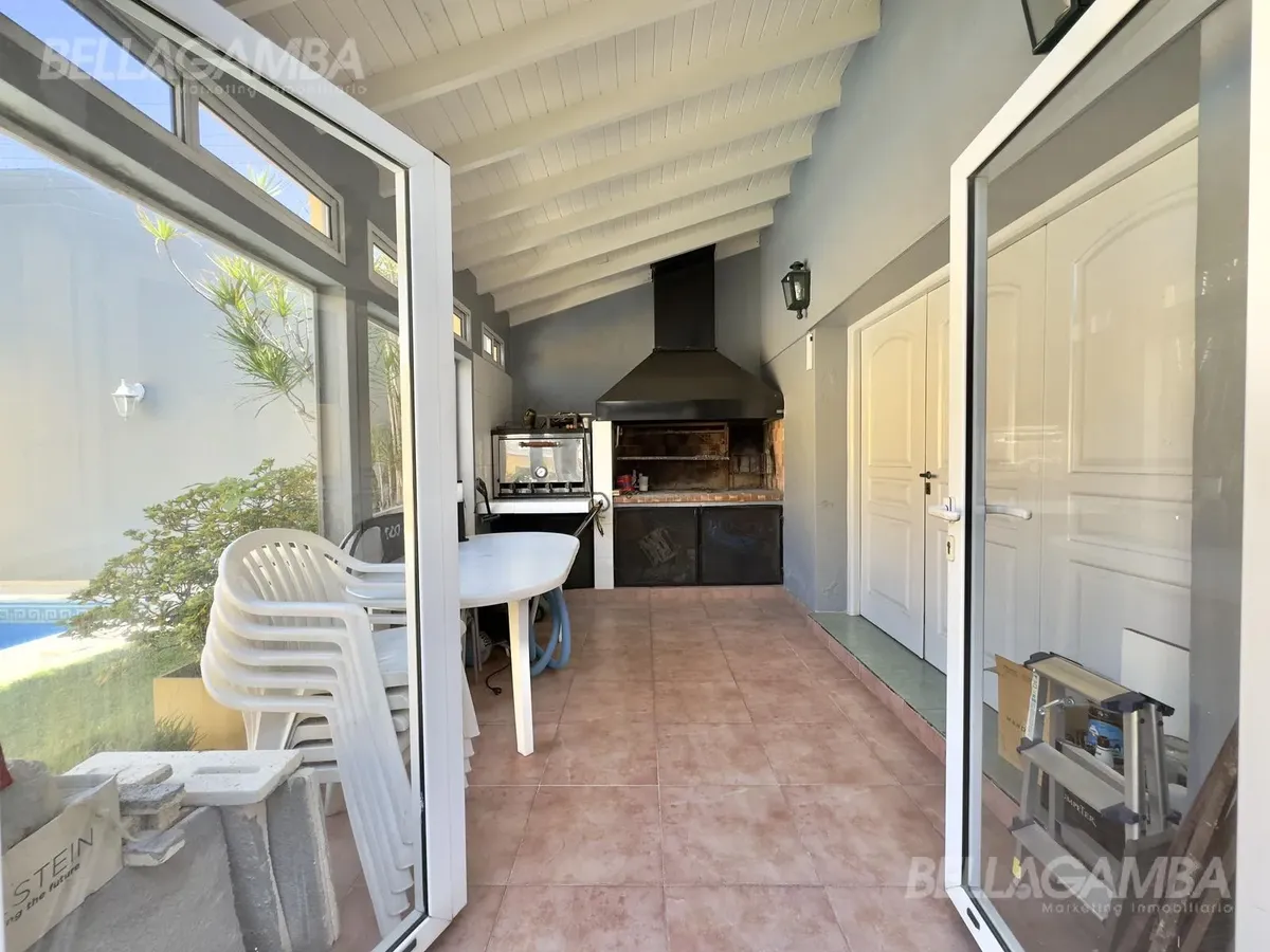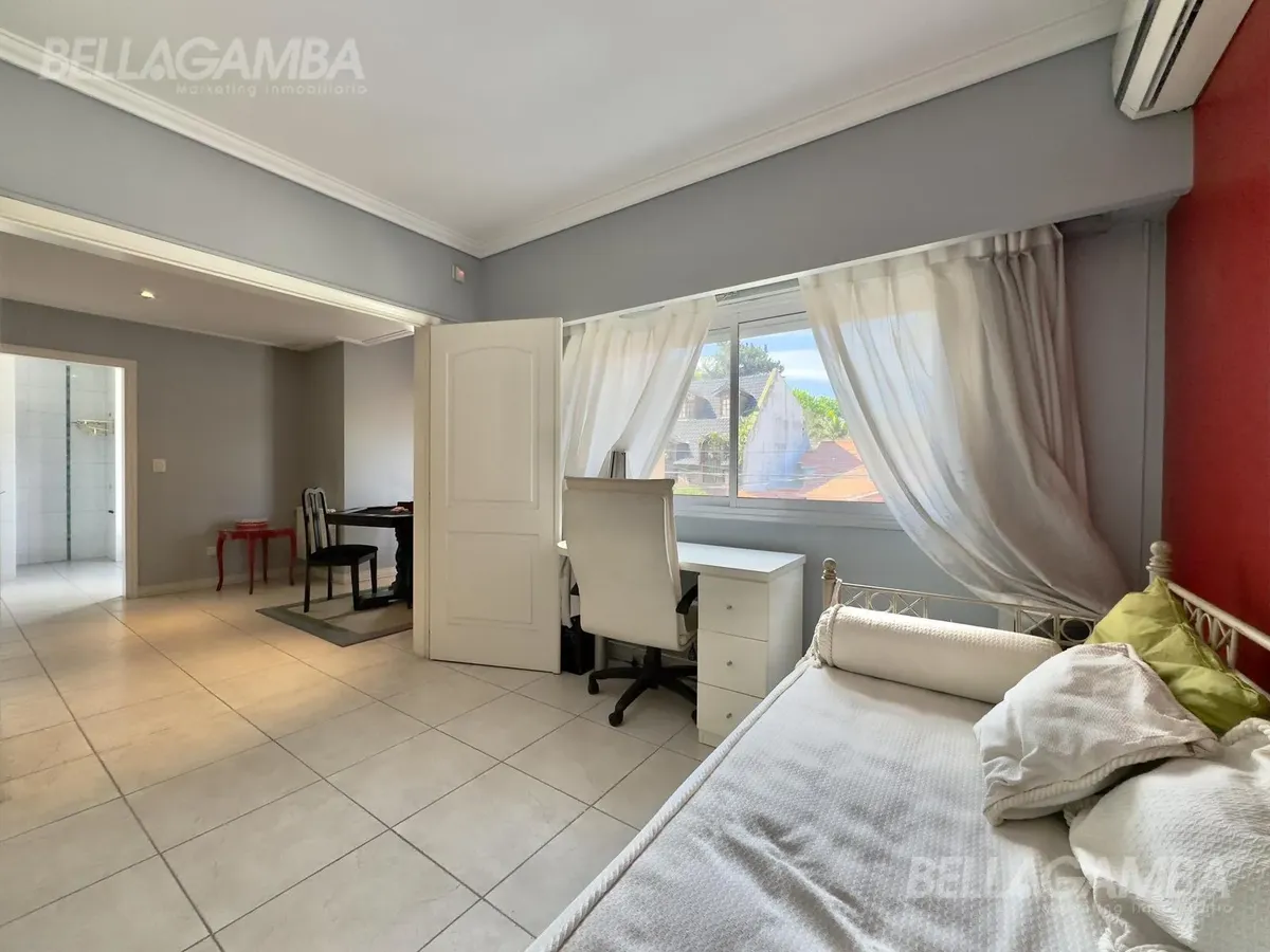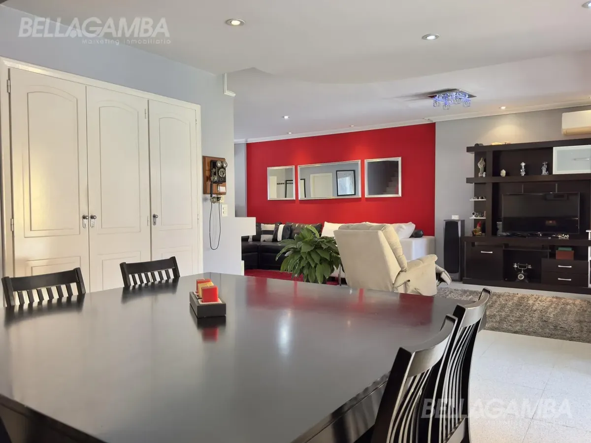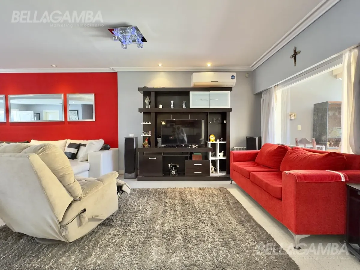 Six-room apartment-style house for rent in Florida, arranged over 3 floors with a semi-covered garage for 2 cars. The property has 300 m² of land and 341 m² of covered area, with street frontage and a semi-covered front parking/driveway area, plus a pedestrian entrance. Ground floor includes a large living-dining area and open-plan family room with garden views, a full bathroom, a front bedroom or office with built-in closet, a large kitchen with pantry, an enclosed gallery with security metal r