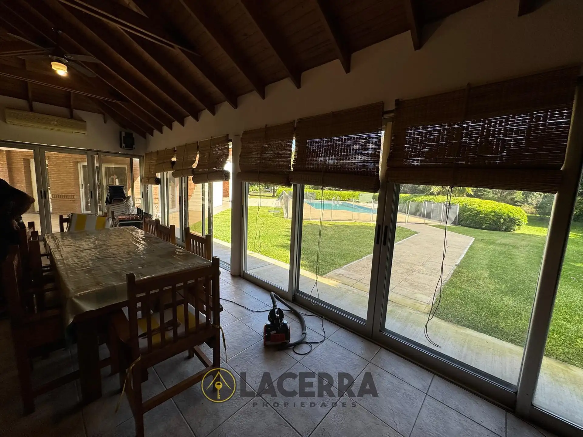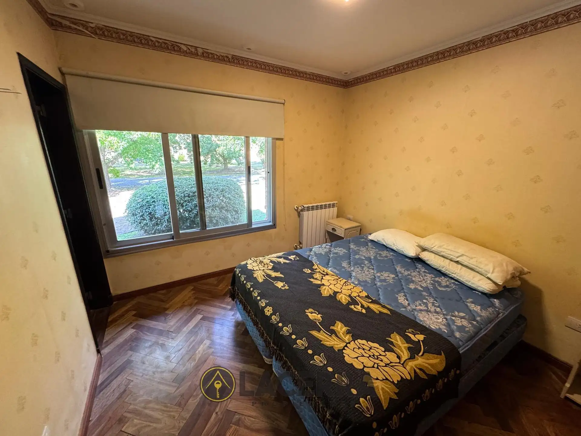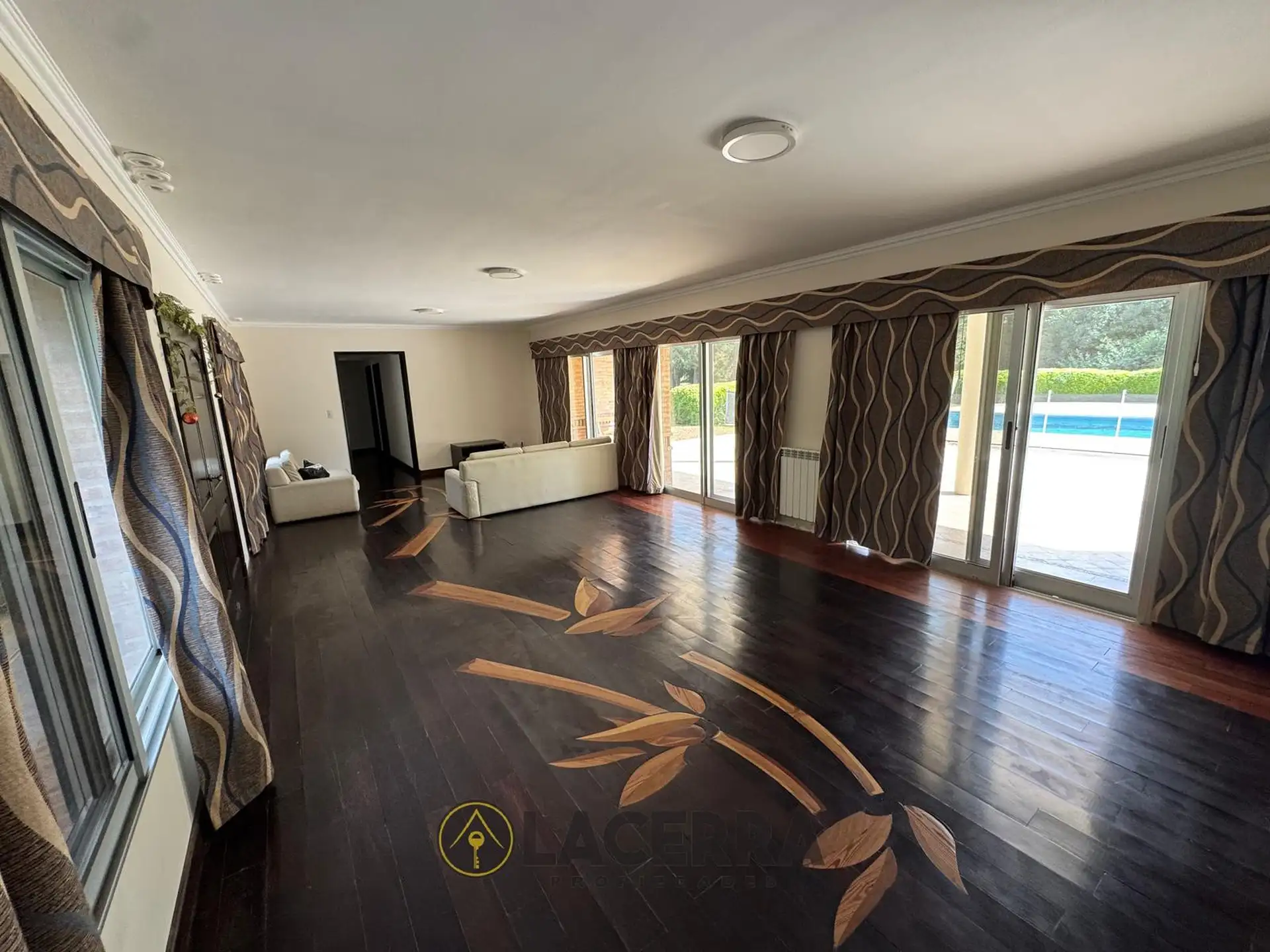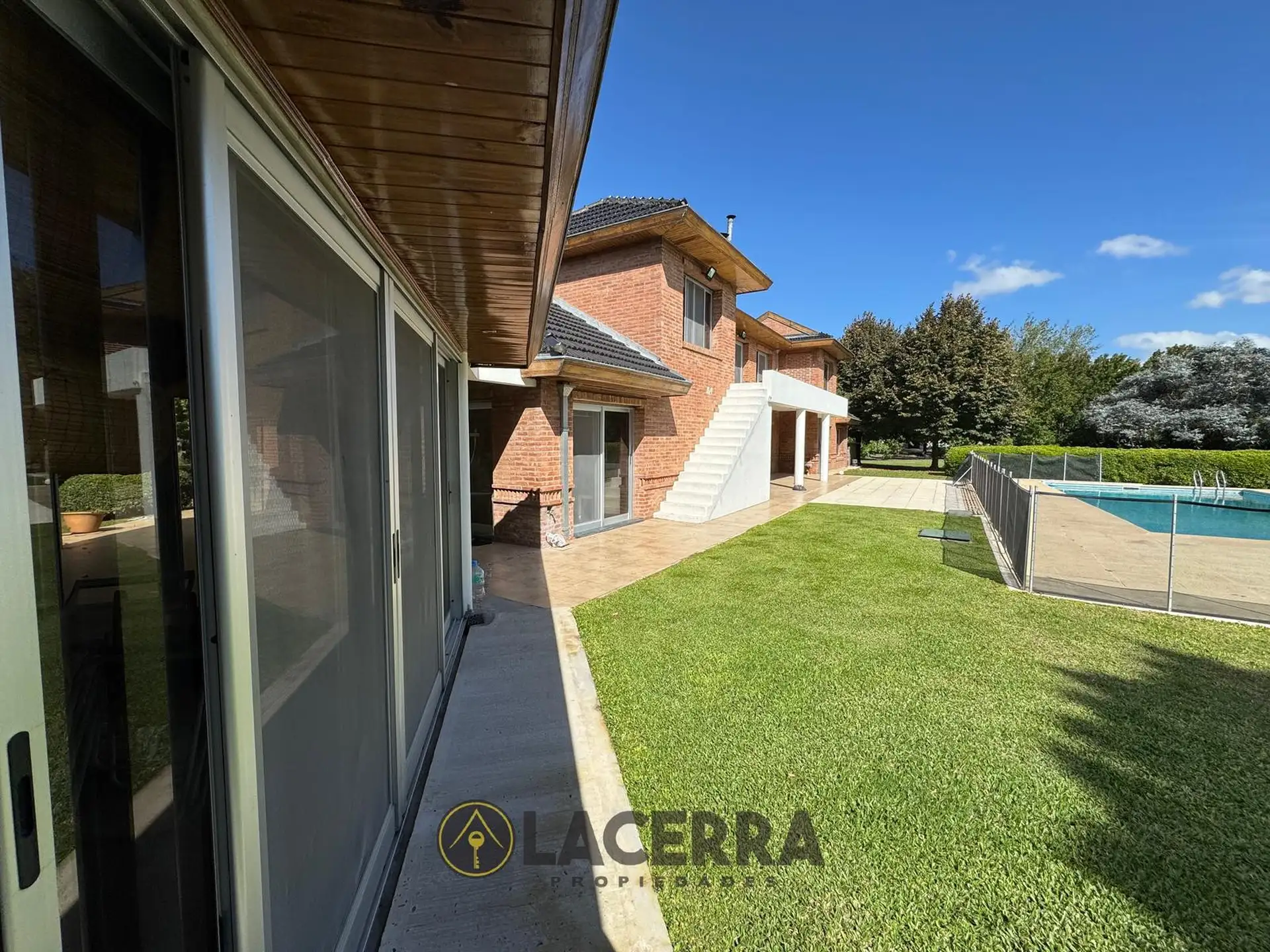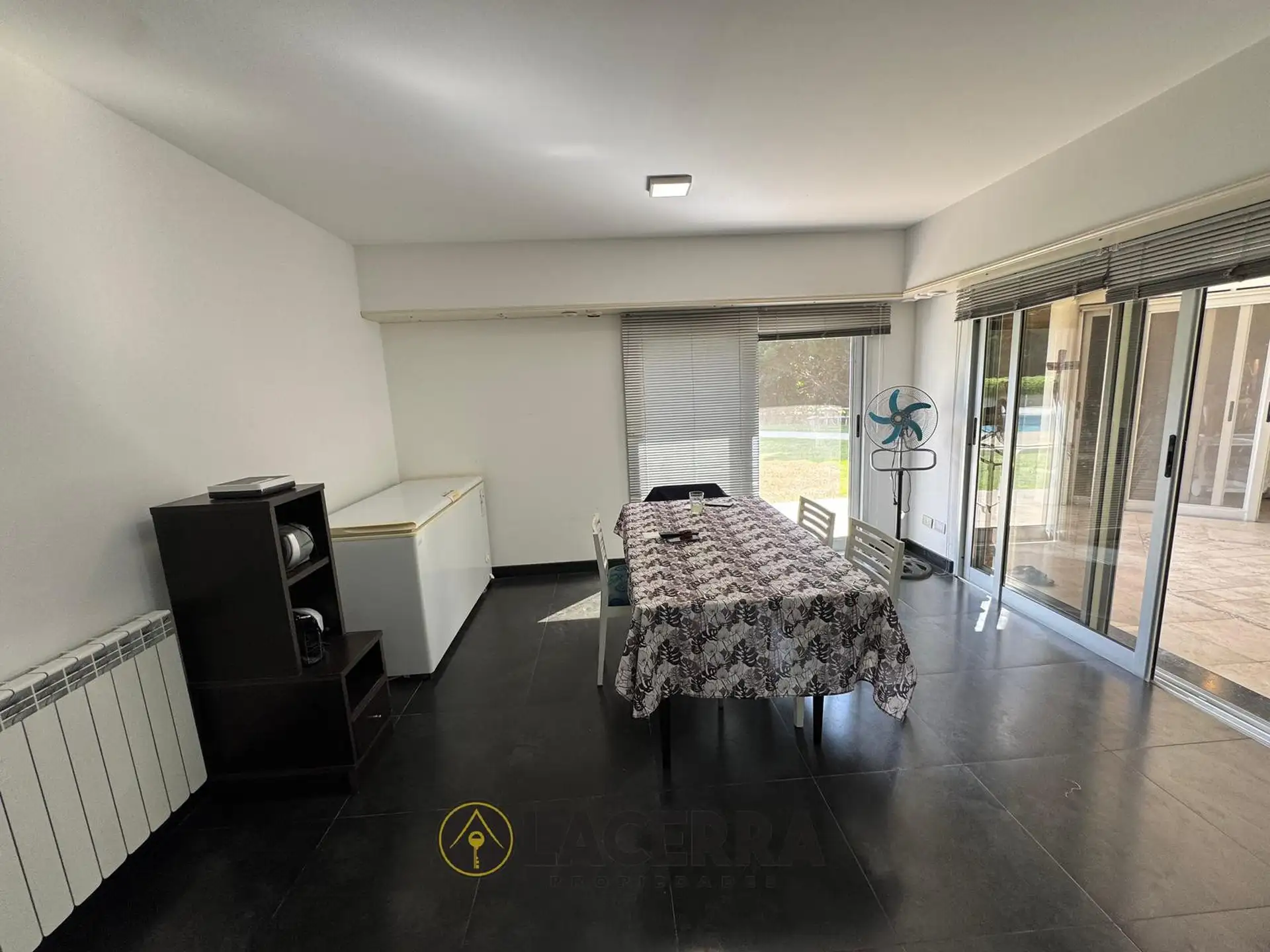 House for temporary rent in Las Chacras de Open Door, Luján, on a plot of over 3,700 m². The property includes an American-style kitchen with an island and access via windows to the pool and the quincho, plus 3 bedrooms on the ground floor (1 with an en-suite bathroom) and 2 additional bedrooms on the upper floor. There is a living-dining room with access to a gallery and the pool, a second living space on the upper floor with large windows and a large balcony, a full bathroom and a separate toi