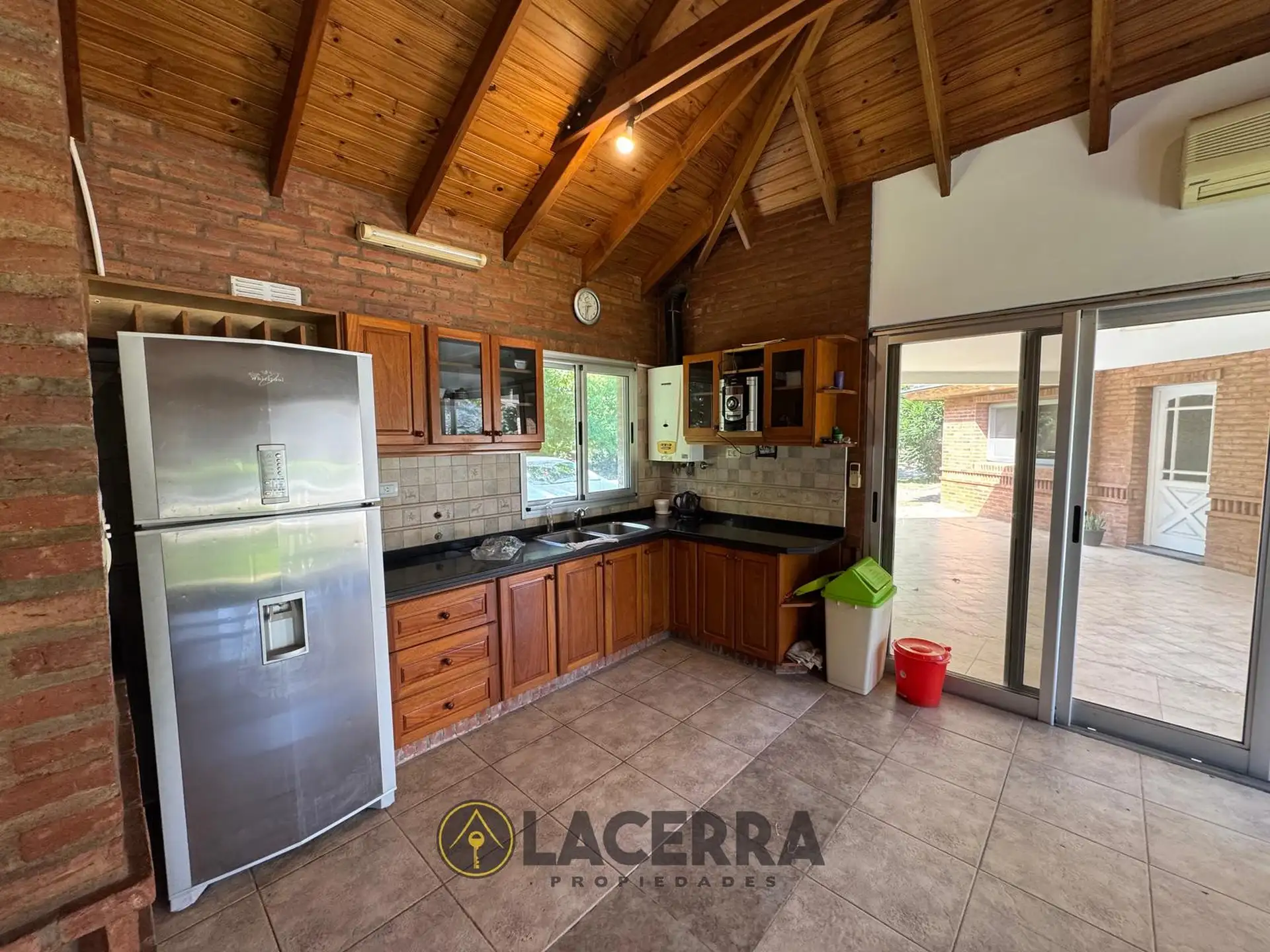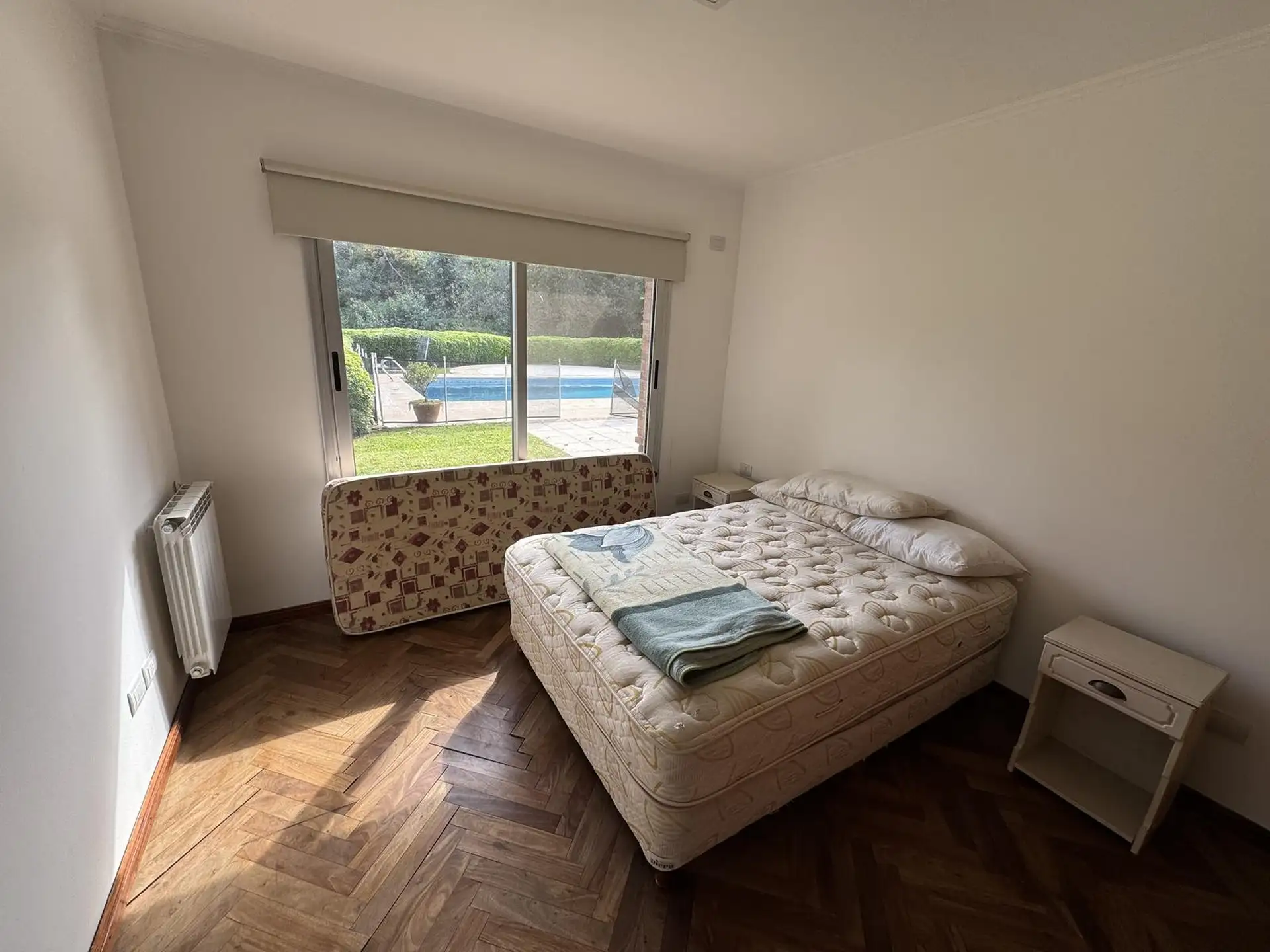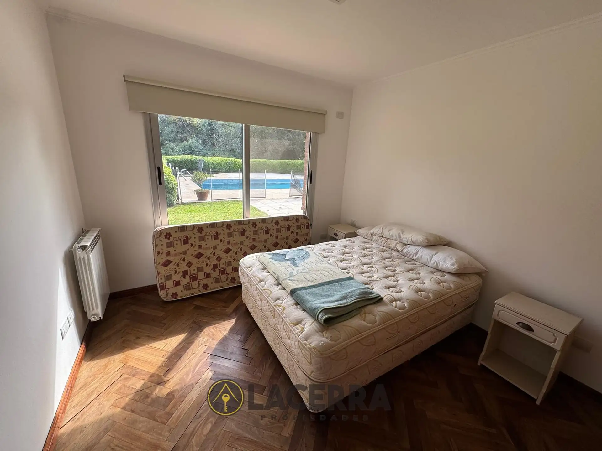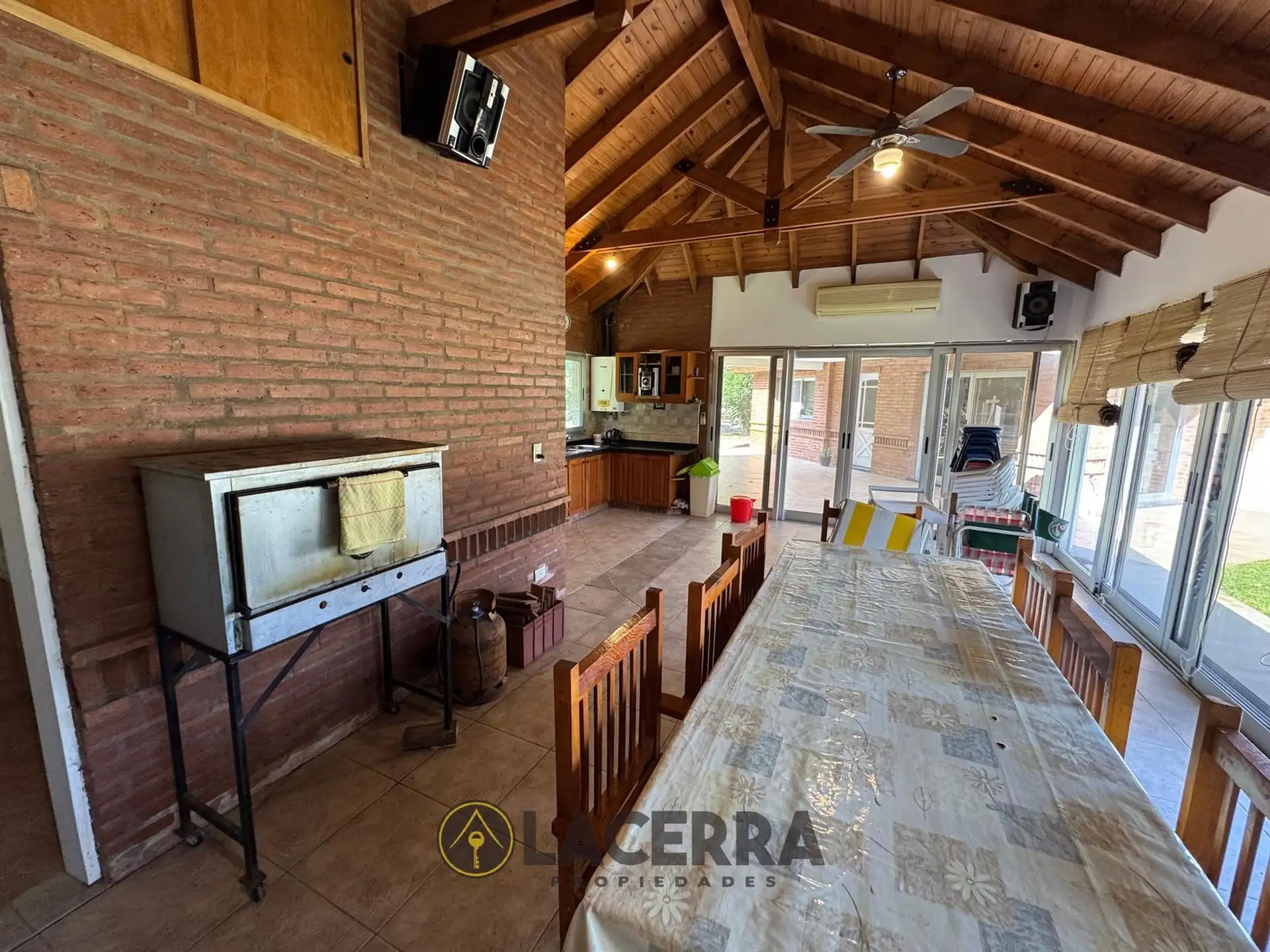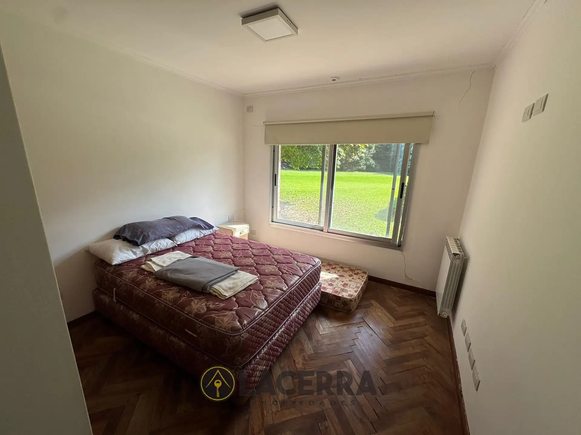 House for temporary rent in Las Chacras de Open Door, Luján, on a plot of over 3,700 m². The property includes an American-style kitchen with an island and access via windows to the pool and the quincho, plus 3 bedrooms on the ground floor (1 with an en-suite bathroom) and 2 additional bedrooms on the upper floor. There is a living-dining room with access to a gallery and the pool, a second living space on the upper floor with large windows and a large balcony, a full bathroom and a separate toi