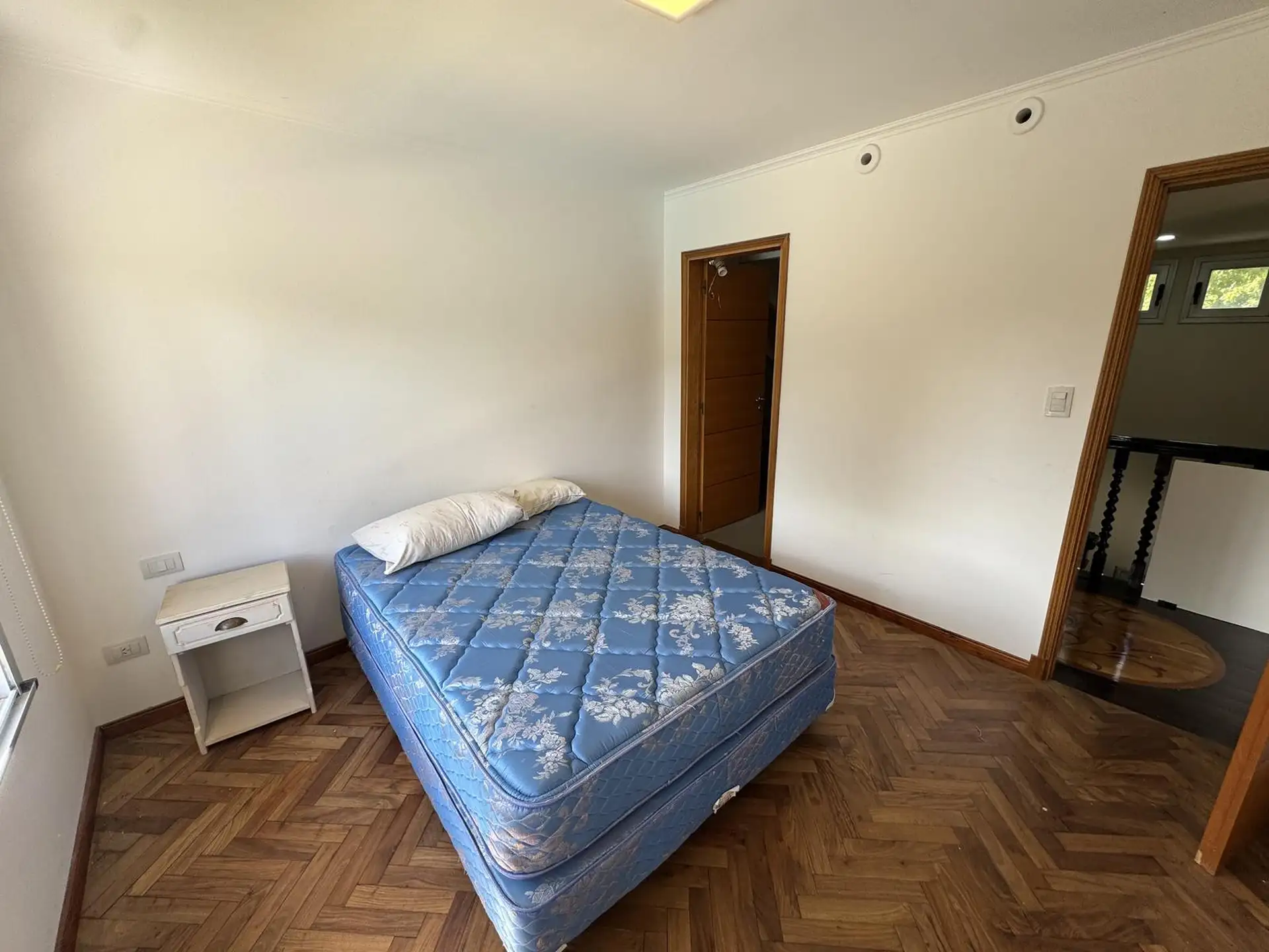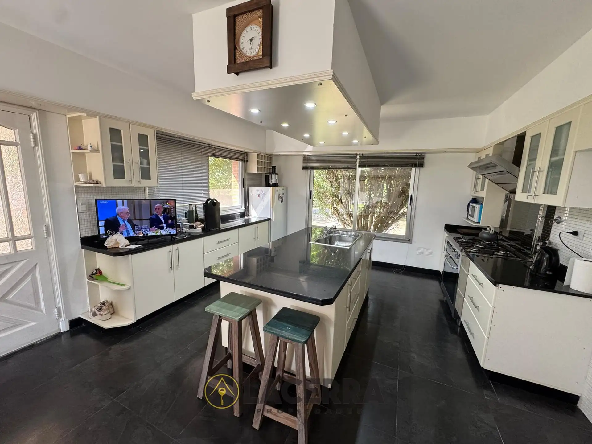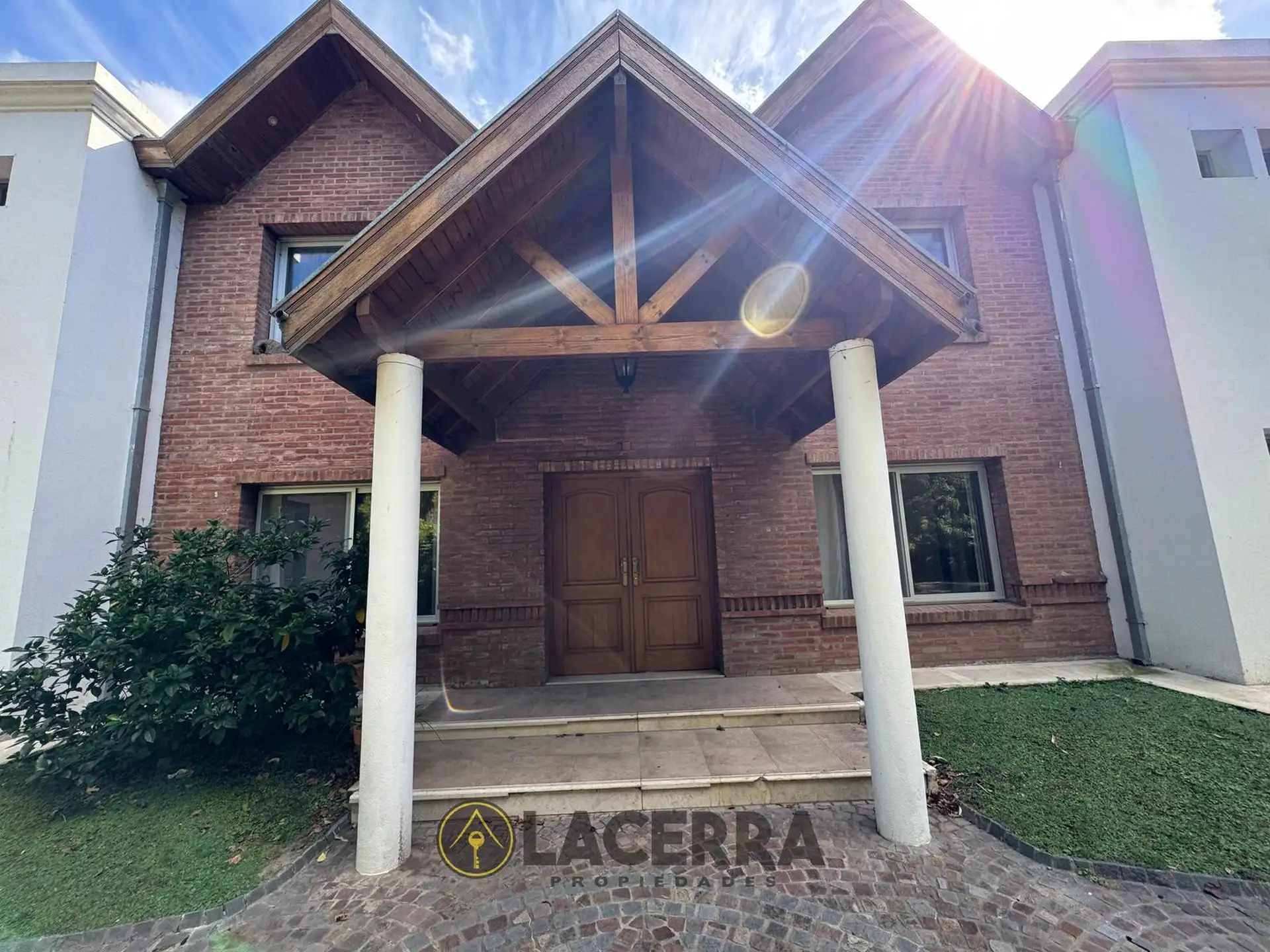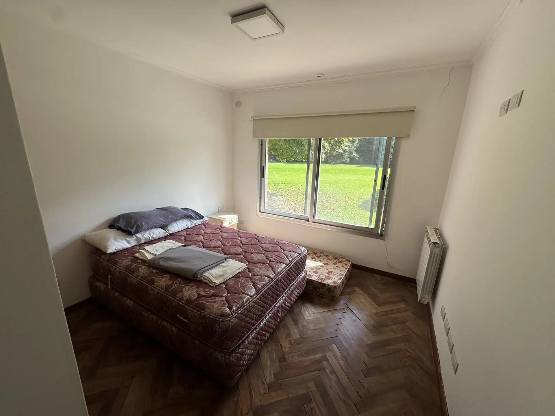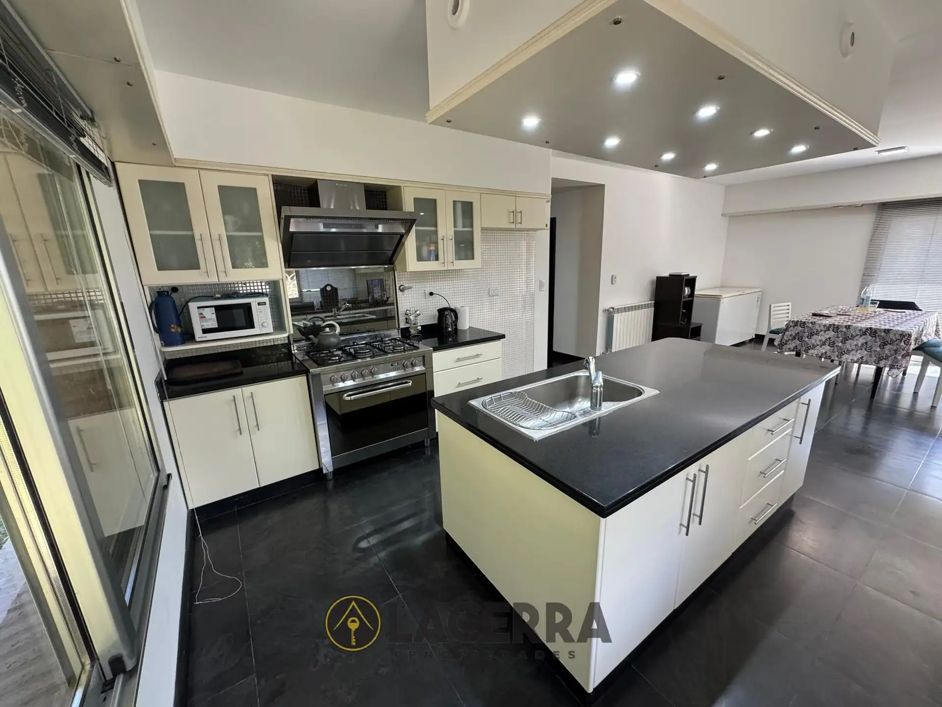 House for temporary rent in Las Chacras de Open Door, Luján, on a plot of over 3,700 m². The property includes an American-style kitchen with an island and access via windows to the pool and the quincho, plus 3 bedrooms on the ground floor (1 with an en-suite bathroom) and 2 additional bedrooms on the upper floor. There is a living-dining room with access to a gallery and the pool, a second living space on the upper floor with large windows and a large balcony, a full bathroom and a separate toi