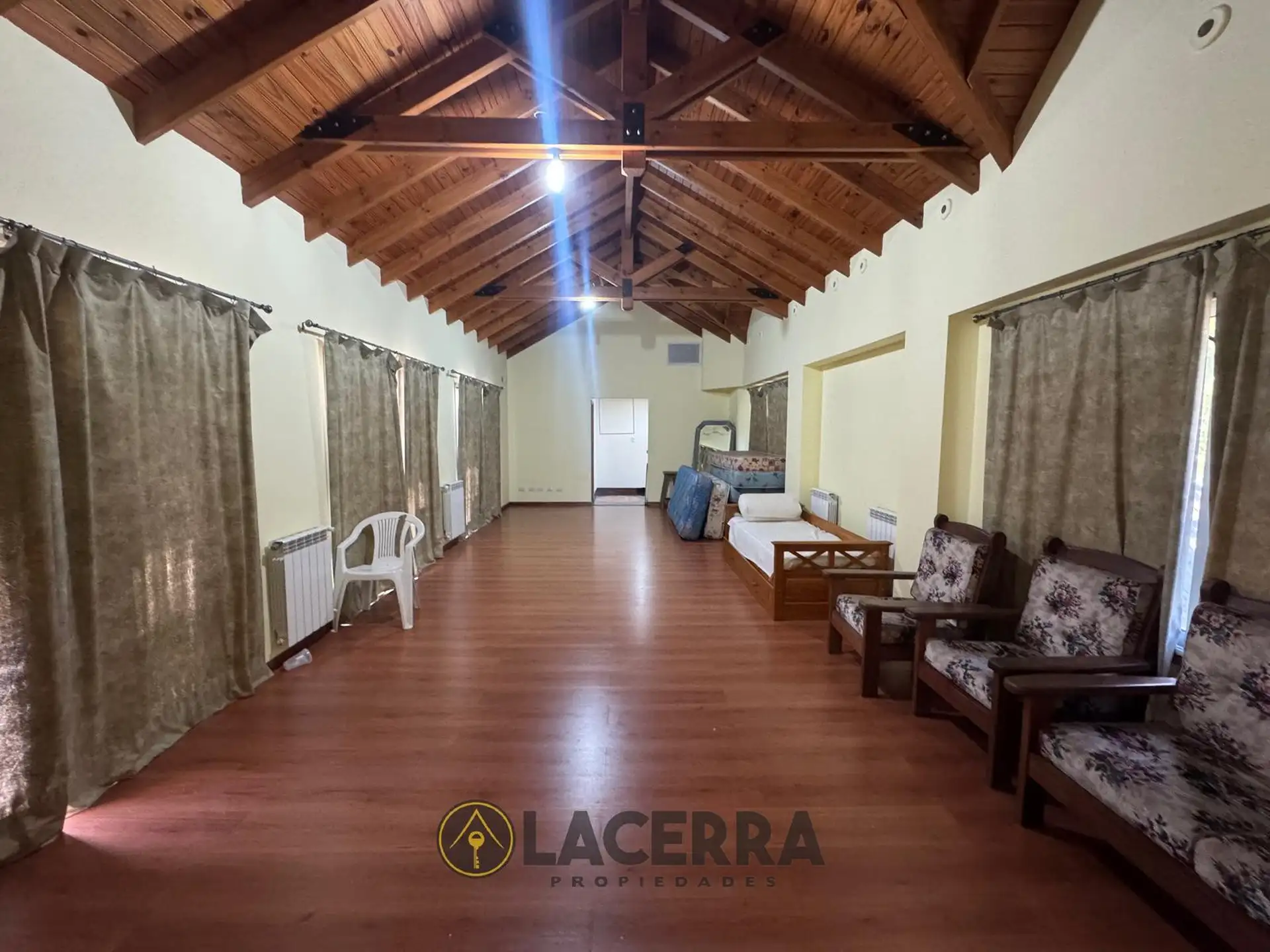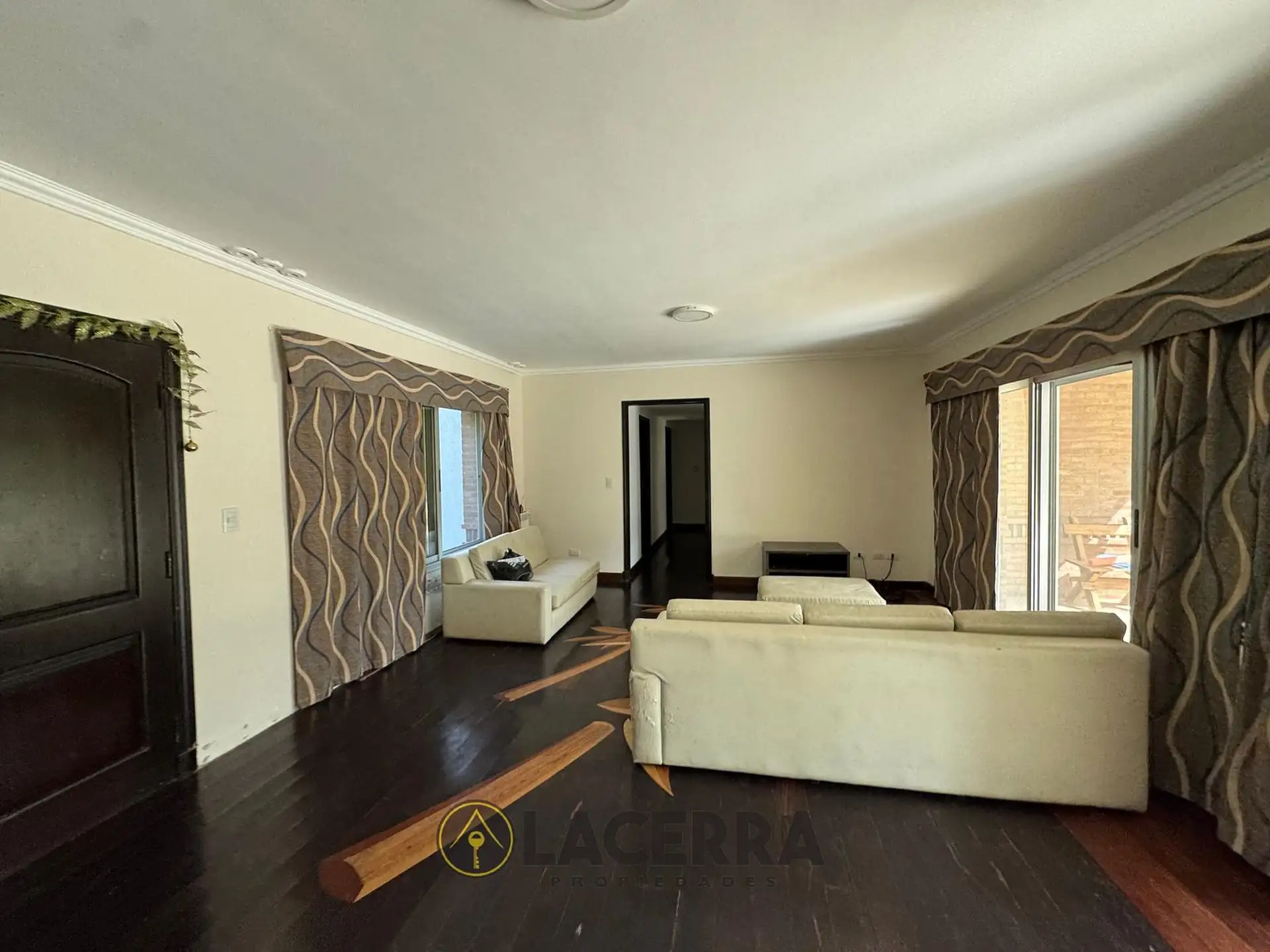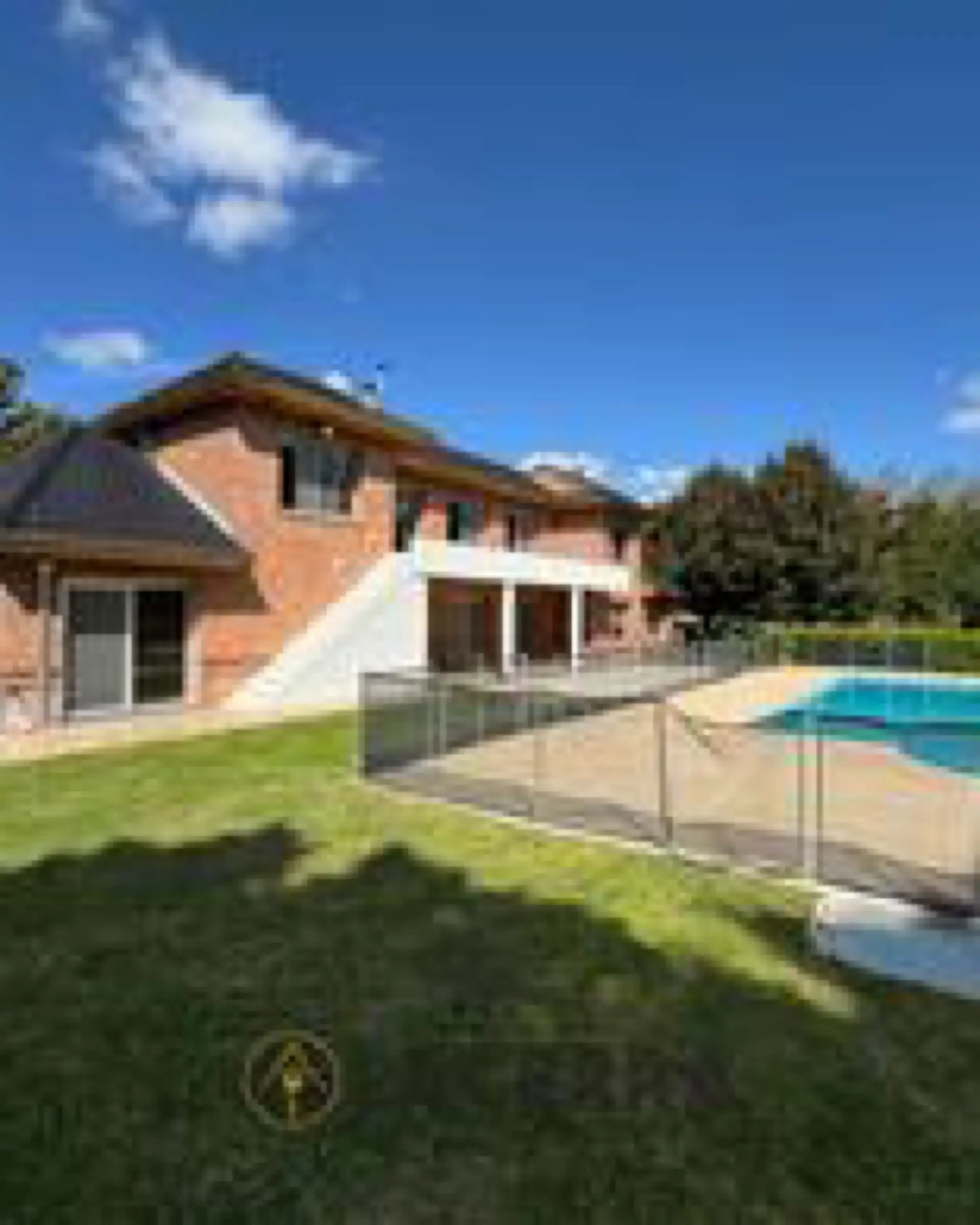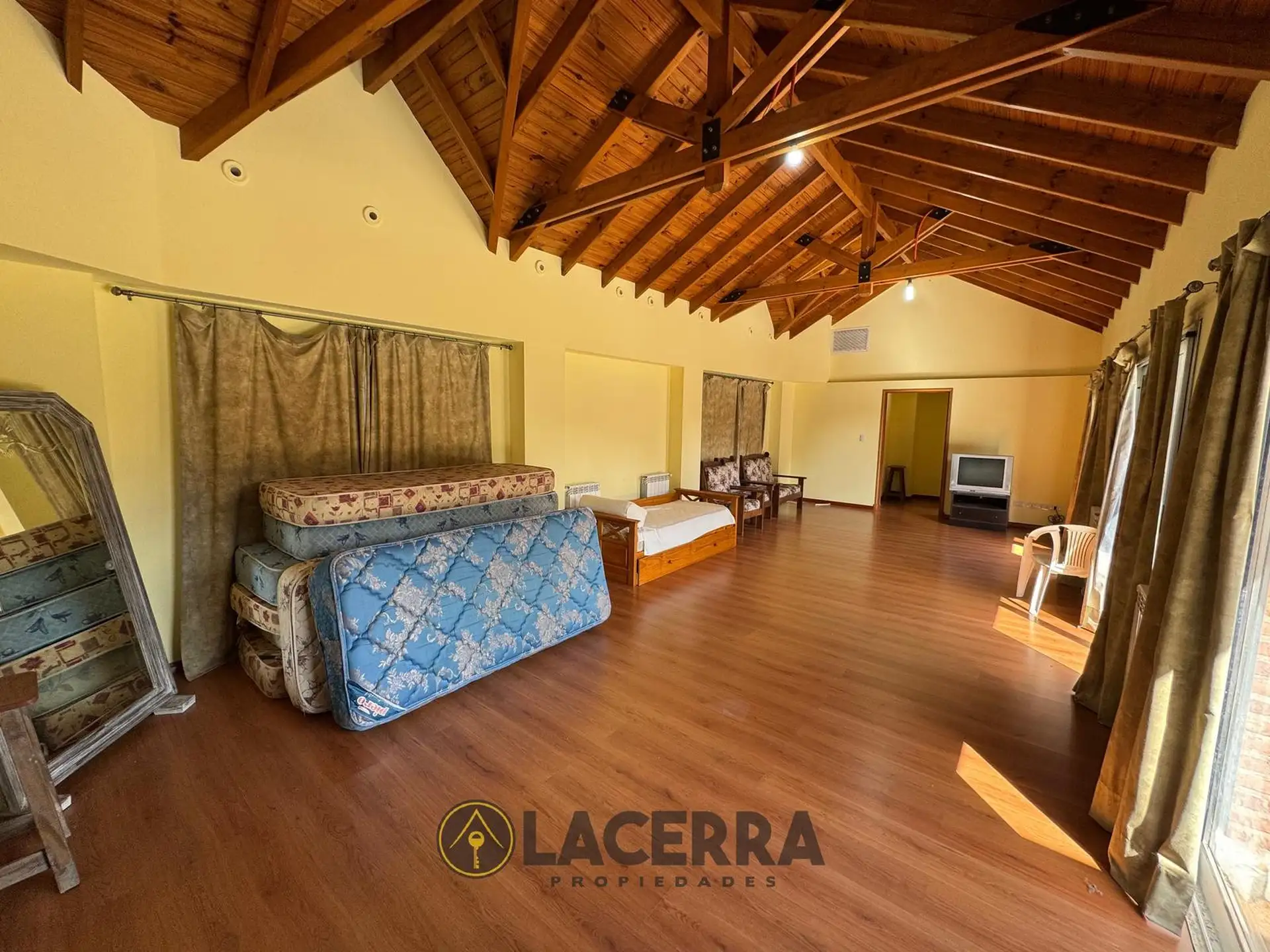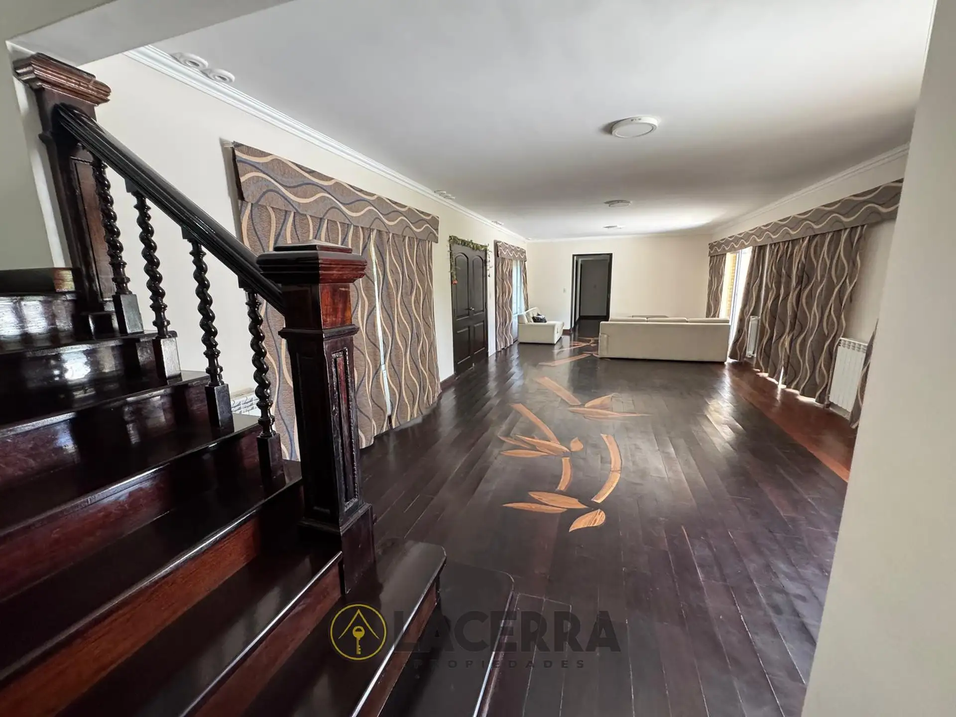 House for temporary rent in Las Chacras de Open Door, Luján, on a plot of over 3,700 m². The property includes an American-style kitchen with an island and access via windows to the pool and the quincho, plus 3 bedrooms on the ground floor (1 with an en-suite bathroom) and 2 additional bedrooms on the upper floor. There is a living-dining room with access to a gallery and the pool, a second living space on the upper floor with large windows and a large balcony, a full bathroom and a separate toi