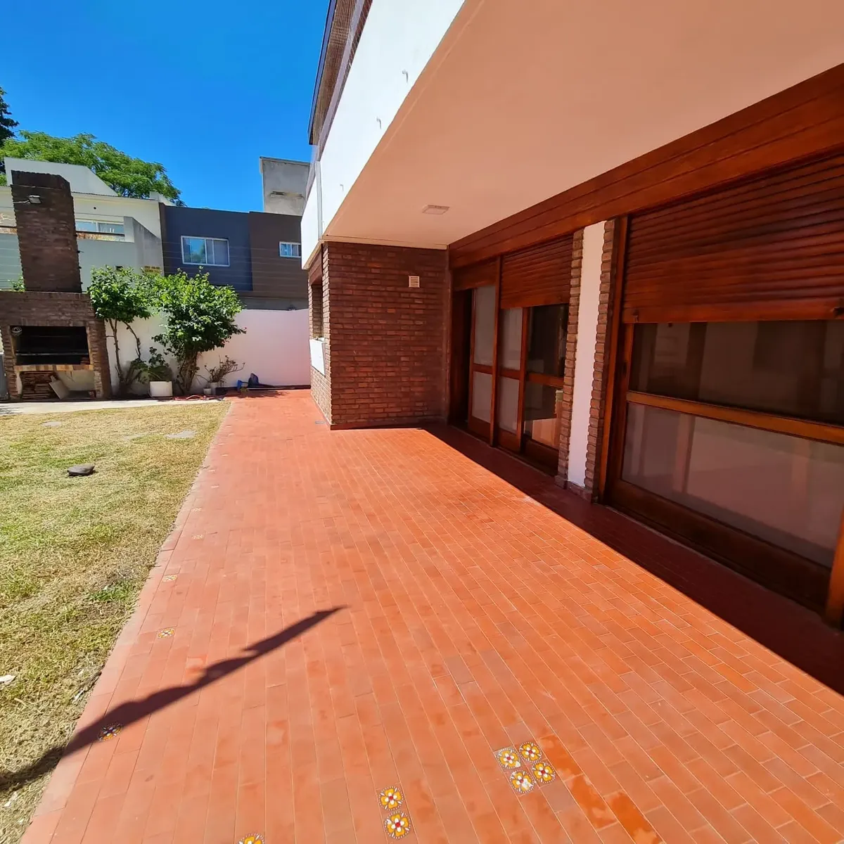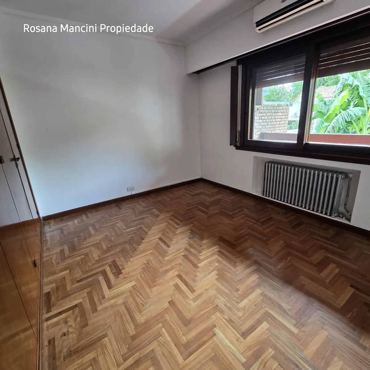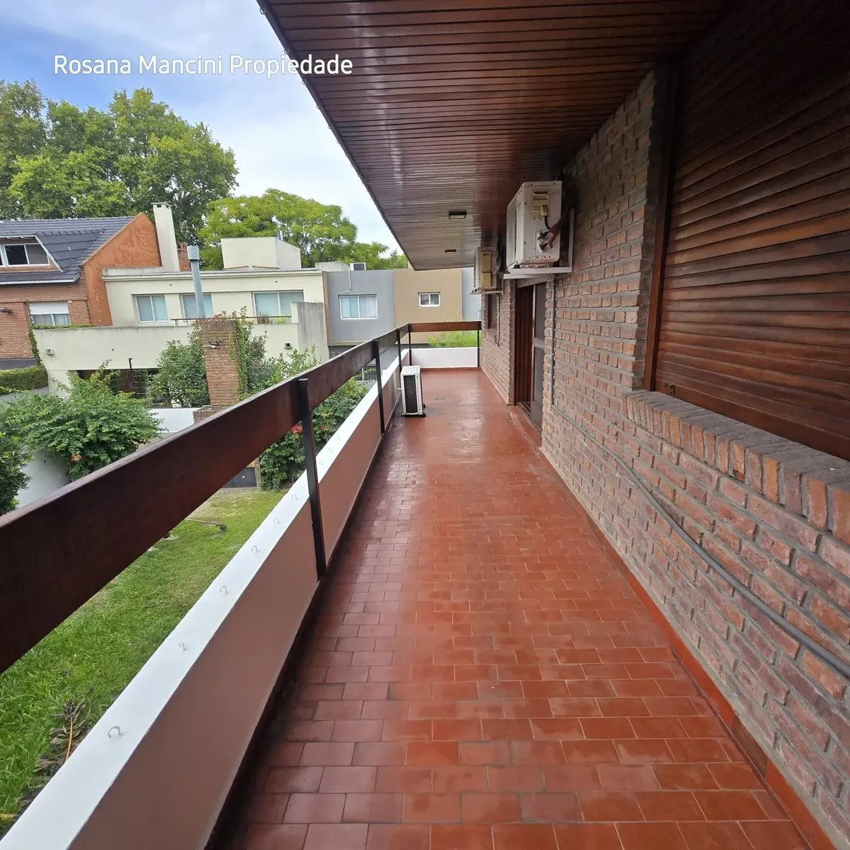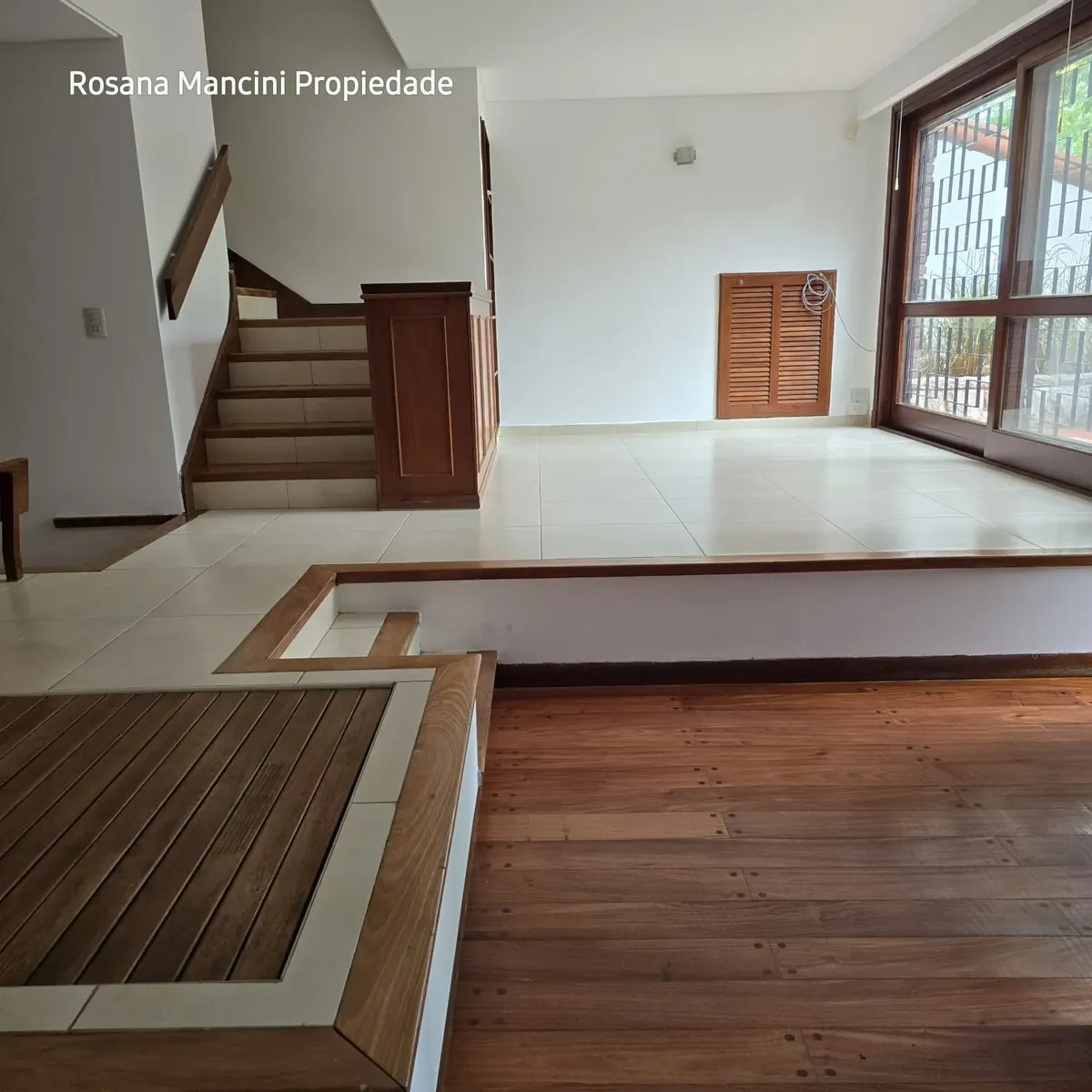 Two-storey apartment in Martínez with 5 bedrooms and a playroom. The ground floor has a large living-dining room with access to the garden, a separate study/intimate sitting area, a reception toilet, and a dining area with direct access to an east-facing garden with a BBQ area and service exit to the street. It includes an updated kitchen and daily dining area connected to the living-dining room, with service access to the upper floor, plus a garage and laundry. The upper floor has 4 main bedroo