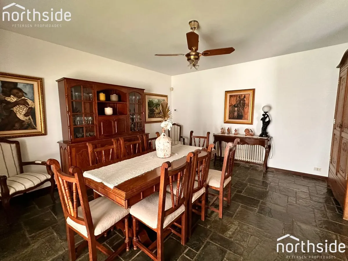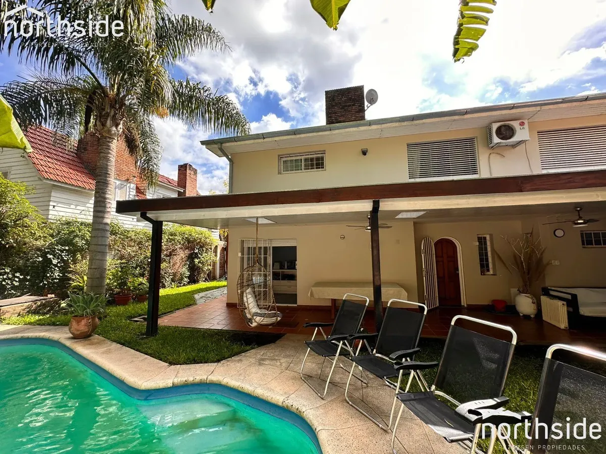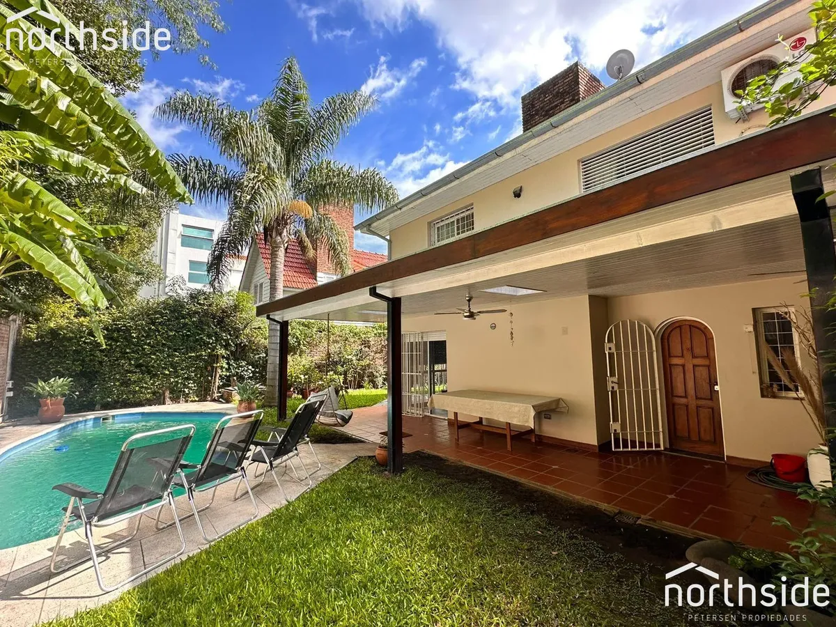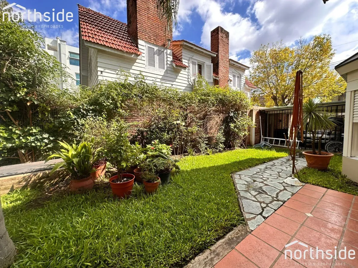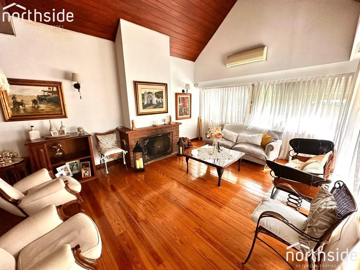 Classic house for rent in Martínez Libertador al Río, refurbished 15 years ago. Ground floor has a reception hall, a front living room with fireplace, a separate dining room, a kitchen with space for a breakfast area and direct access to the garden, an additional dining room or independent living room, a laundry area, and a service staff quarter with bathroom. Upper floor has four bedrooms, with the master suite including a dressing room and private bathroom, and three additional bedrooms sharin