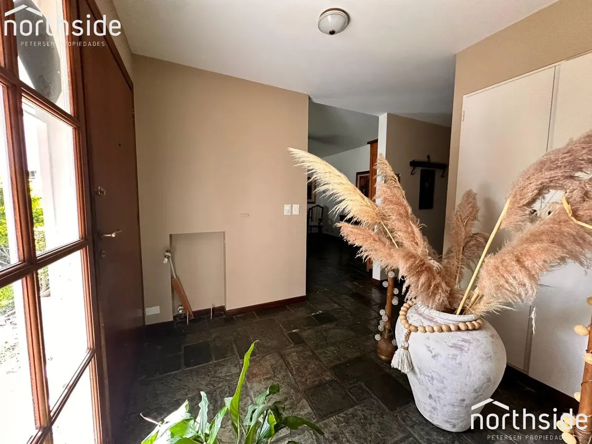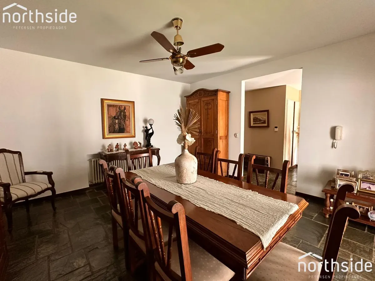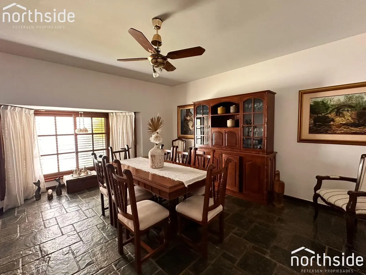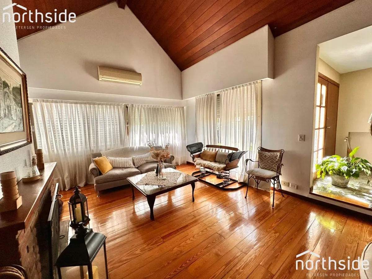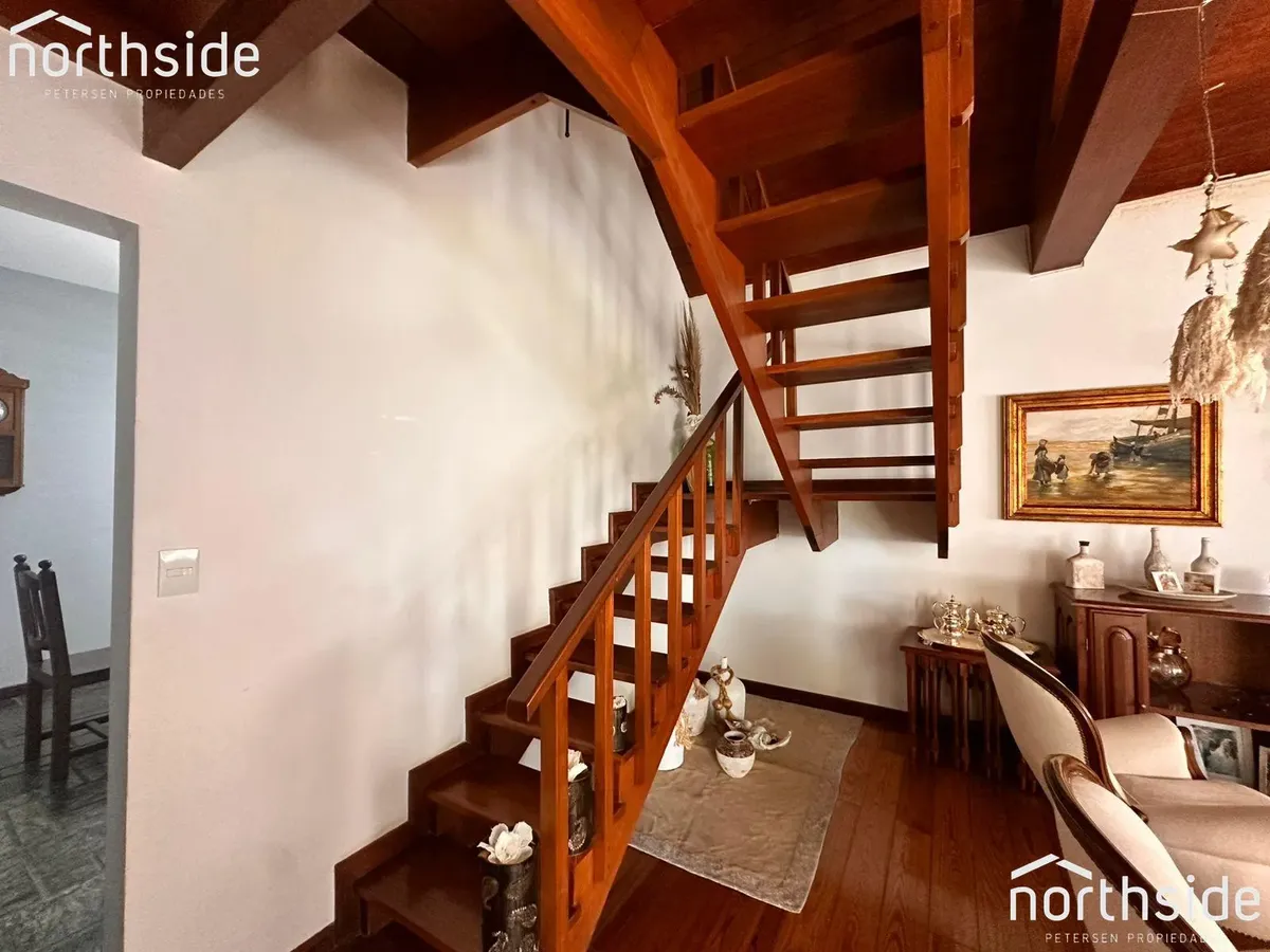 Classic house for rent in Martínez Libertador al Río, refurbished 15 years ago. Ground floor has a reception hall, a front living room with fireplace, a separate dining room, a kitchen with space for a breakfast area and direct access to the garden, an additional dining room or independent living room, a laundry area, and a service staff quarter with bathroom. Upper floor has four bedrooms, with the master suite including a dressing room and private bathroom, and three additional bedrooms sharin
