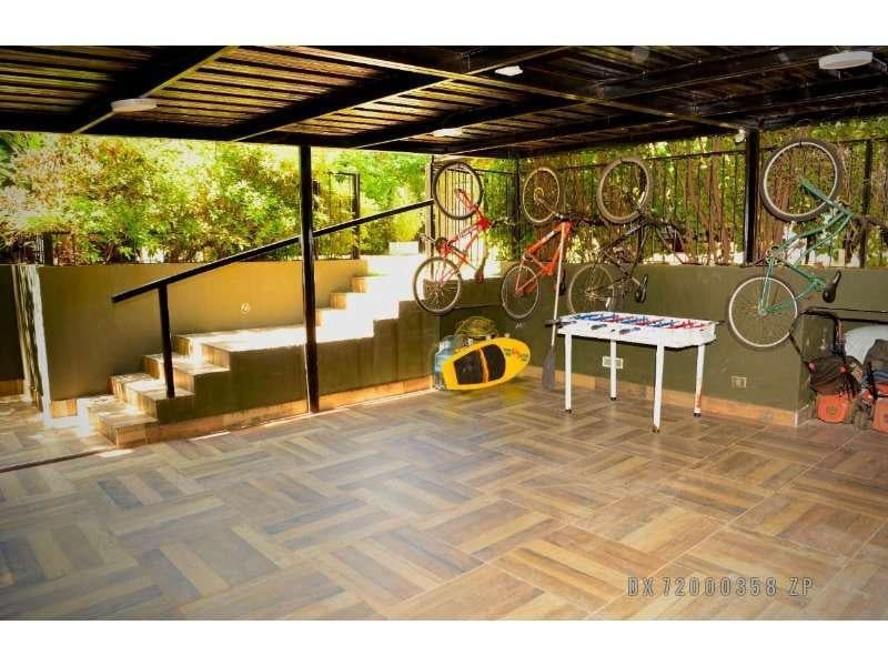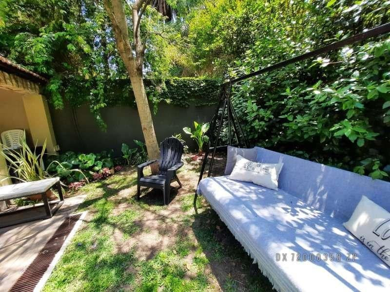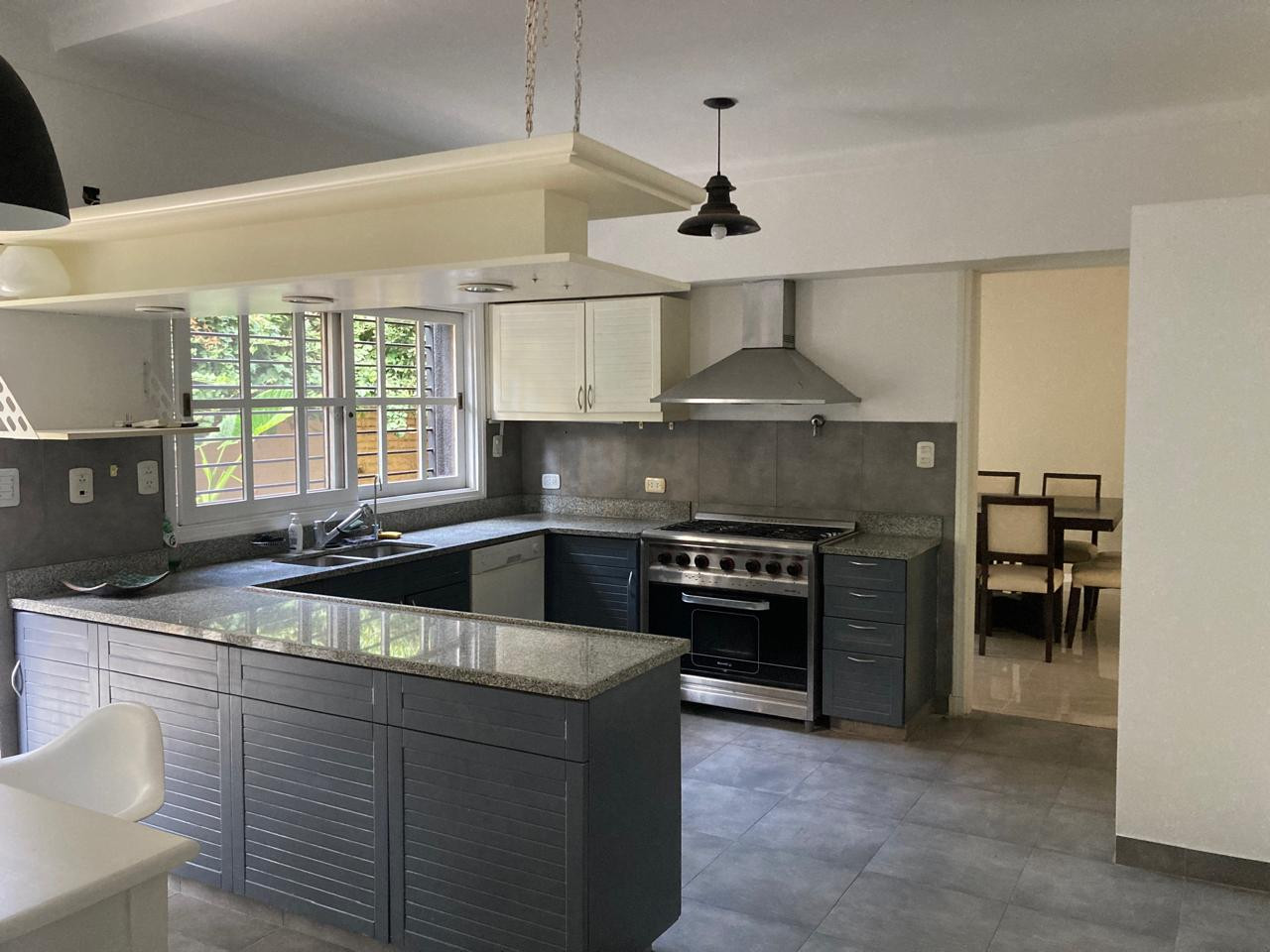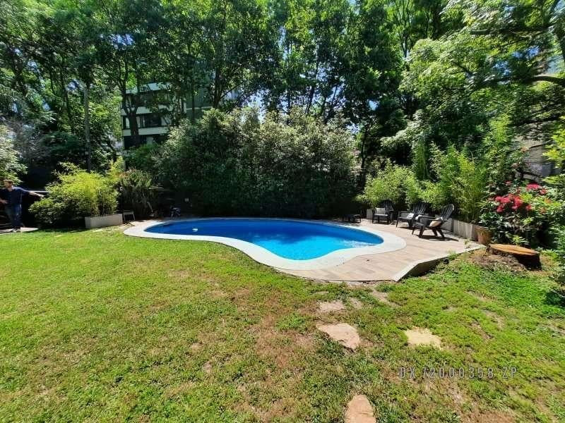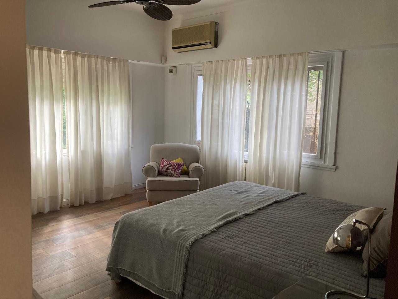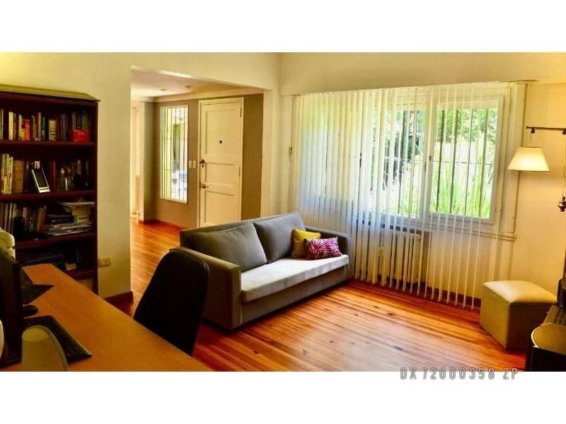 House in Olivos, Quinta Presidencial. North-facing property with a front garden and covered porch. The ground floor has an entry hall, a guest toilet, a living room with fireplace area and garden views, a dining room, a family room or lounge, and a well-equipped kitchen with storage; there is also a separate dining area with views of a private patio. From the breakfast/daily dining room, an additional large lounge/office/music room or guest suite with a new bathroom with shower and a kitchenette