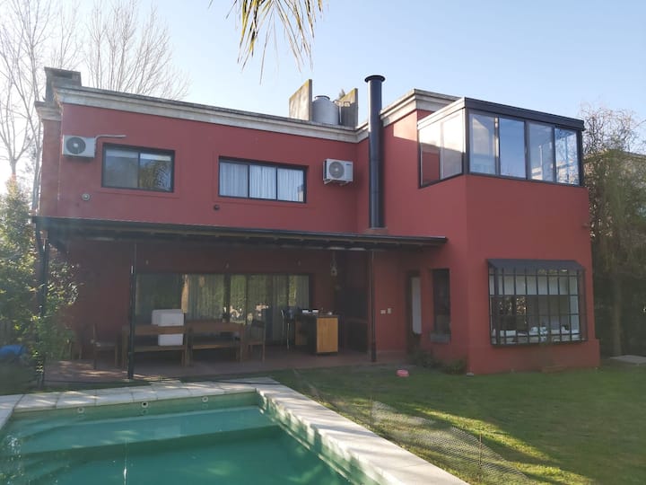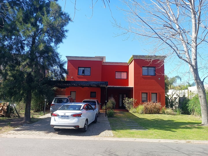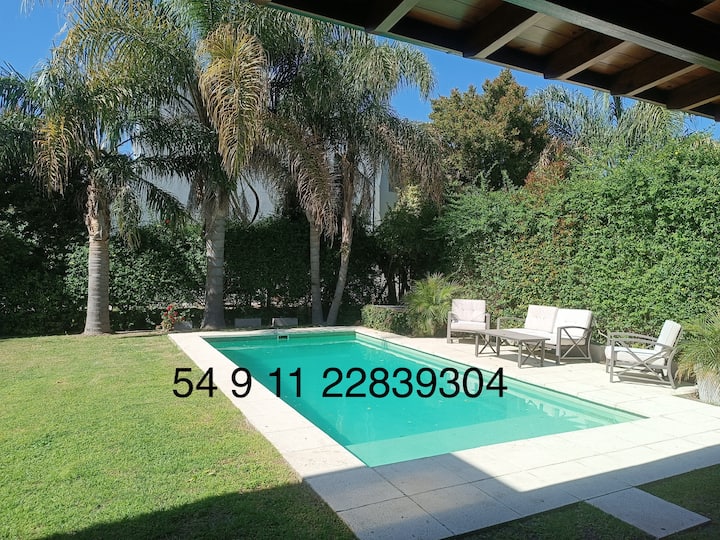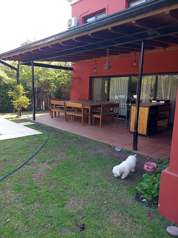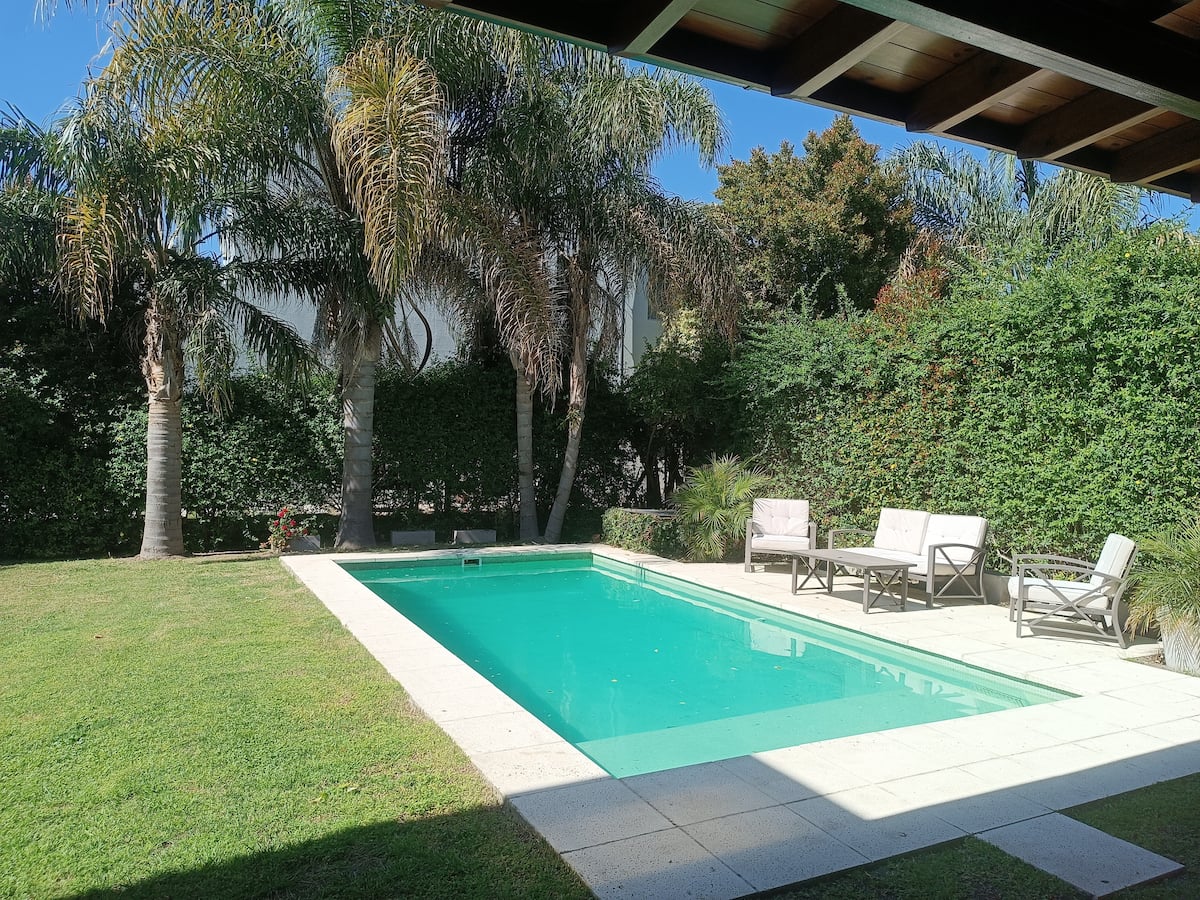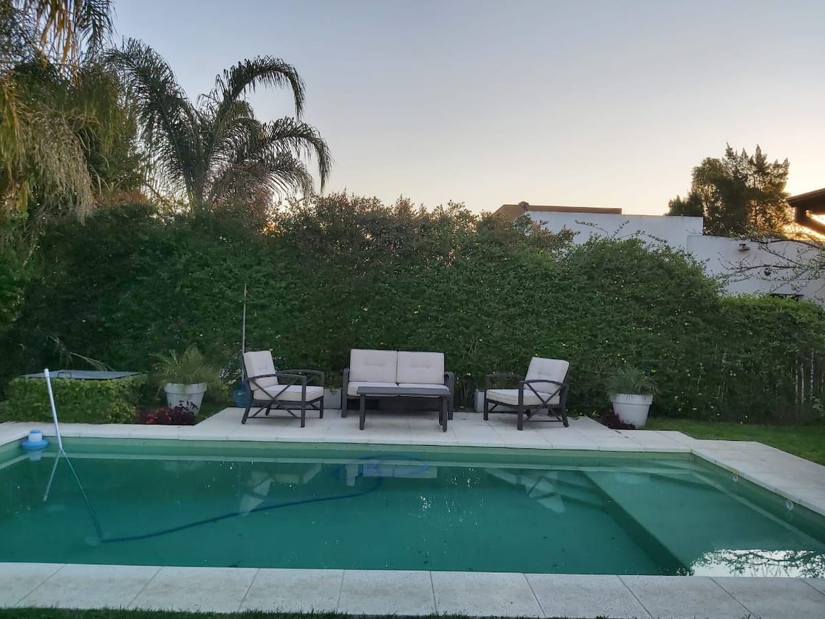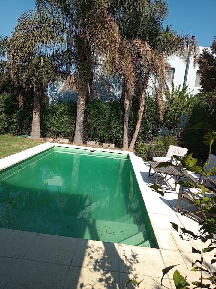 Apartment in San Fernando inside a gated community, about 30 minutes from CABA by highway. The property has 5 bedrooms, two en-suite bedrooms (one on the ground floor and one on the first floor), plus a pool, garden and a wood-burning oven. Smart TVs are listed for all bedrooms, the living room and the dining-kitchen. The complex includes a clubhouse with children’s games.