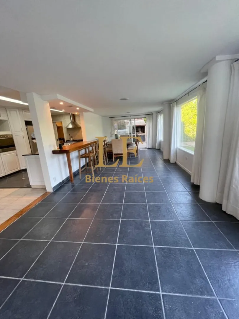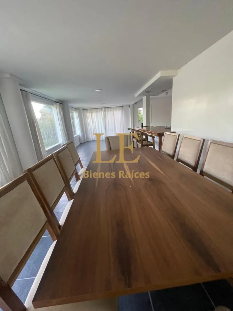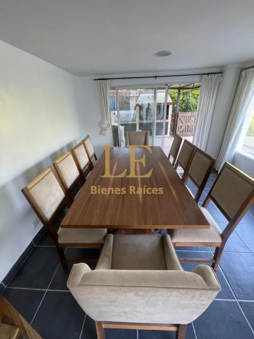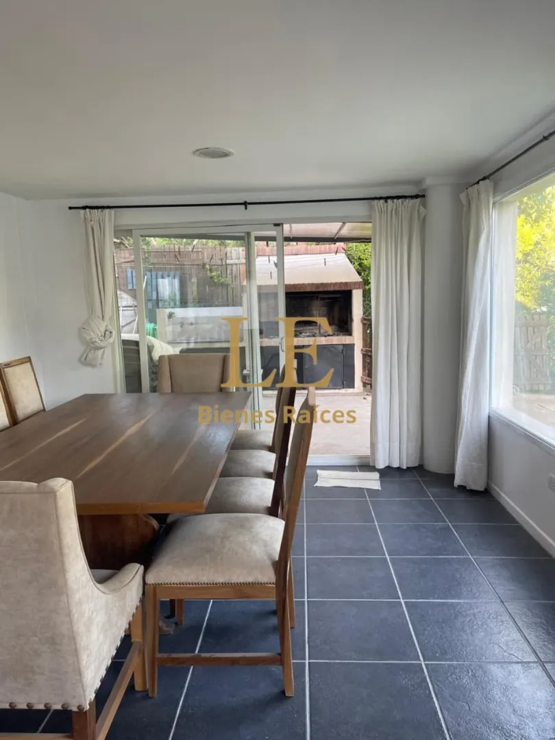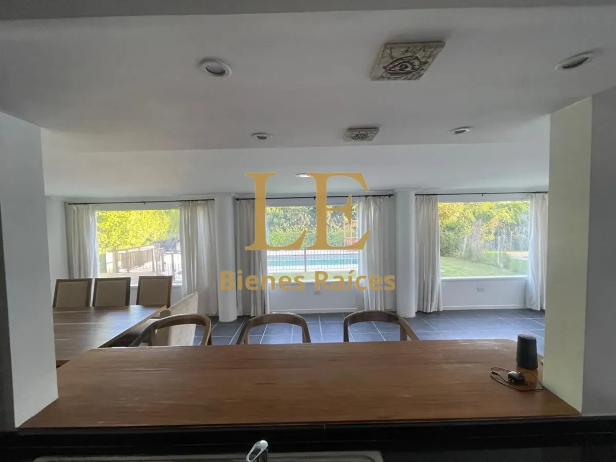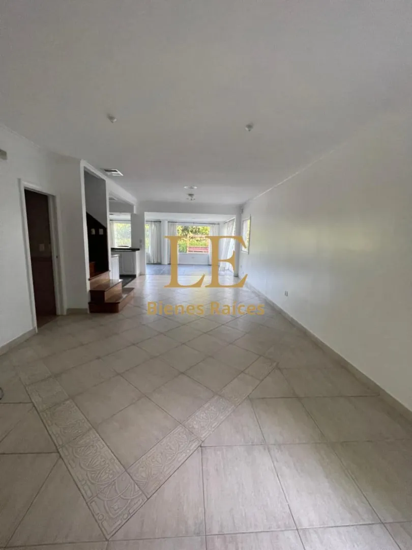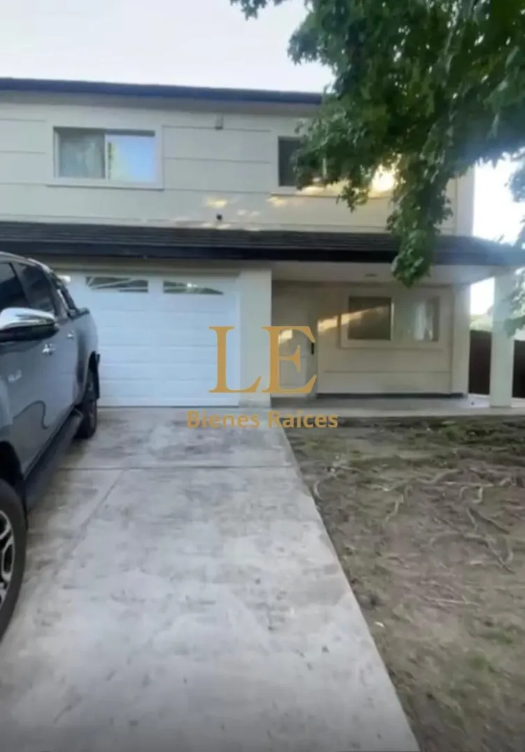 Two-storey house in Lomas de Benavídez private neighbourhood in Tigre, available from May. Ground floor includes a living-dining room with garden views, a kitchen with breakfast bar, built-in kitchen units and countertop, a covered gallery with a grill, a guest toilet and a service unit, plus a separate laundry area. Upper floor has 4 bedrooms, one en suite with a walk-in dressing room, and a full bathroom.