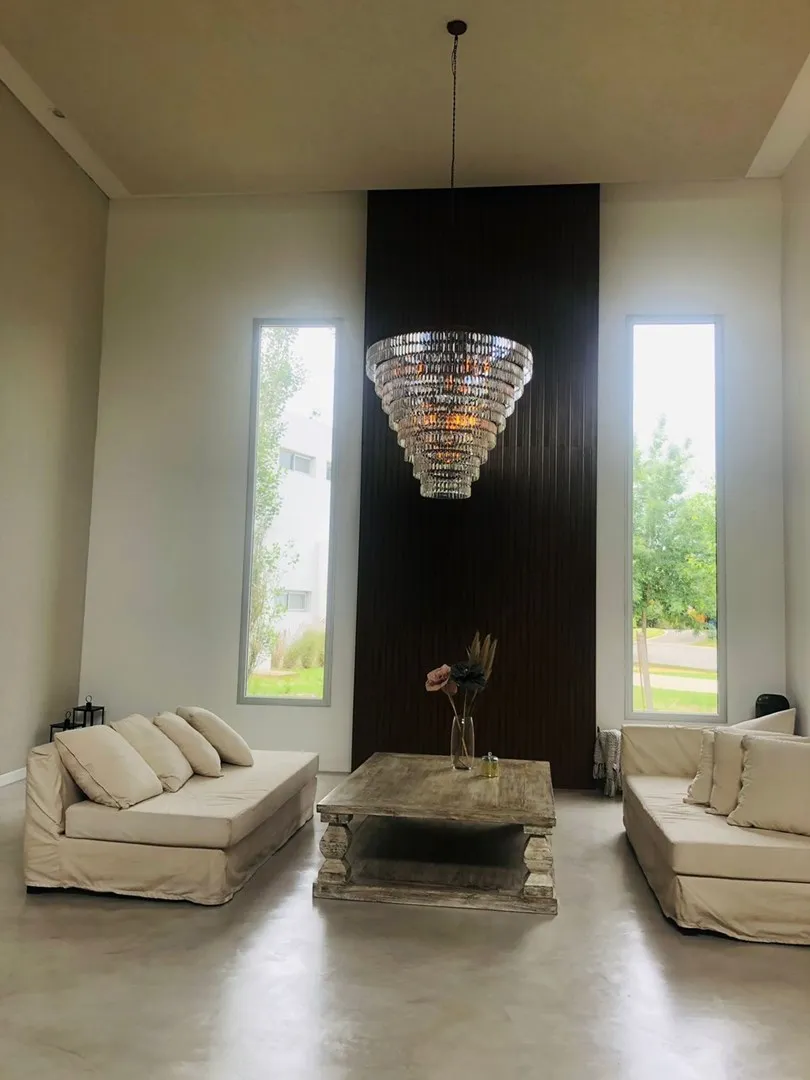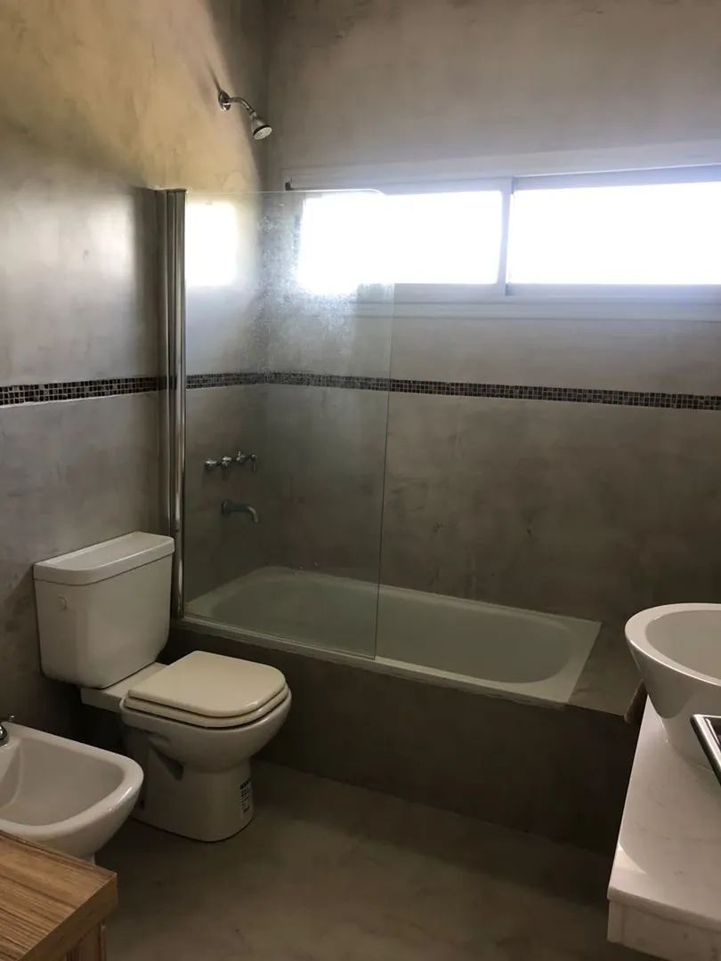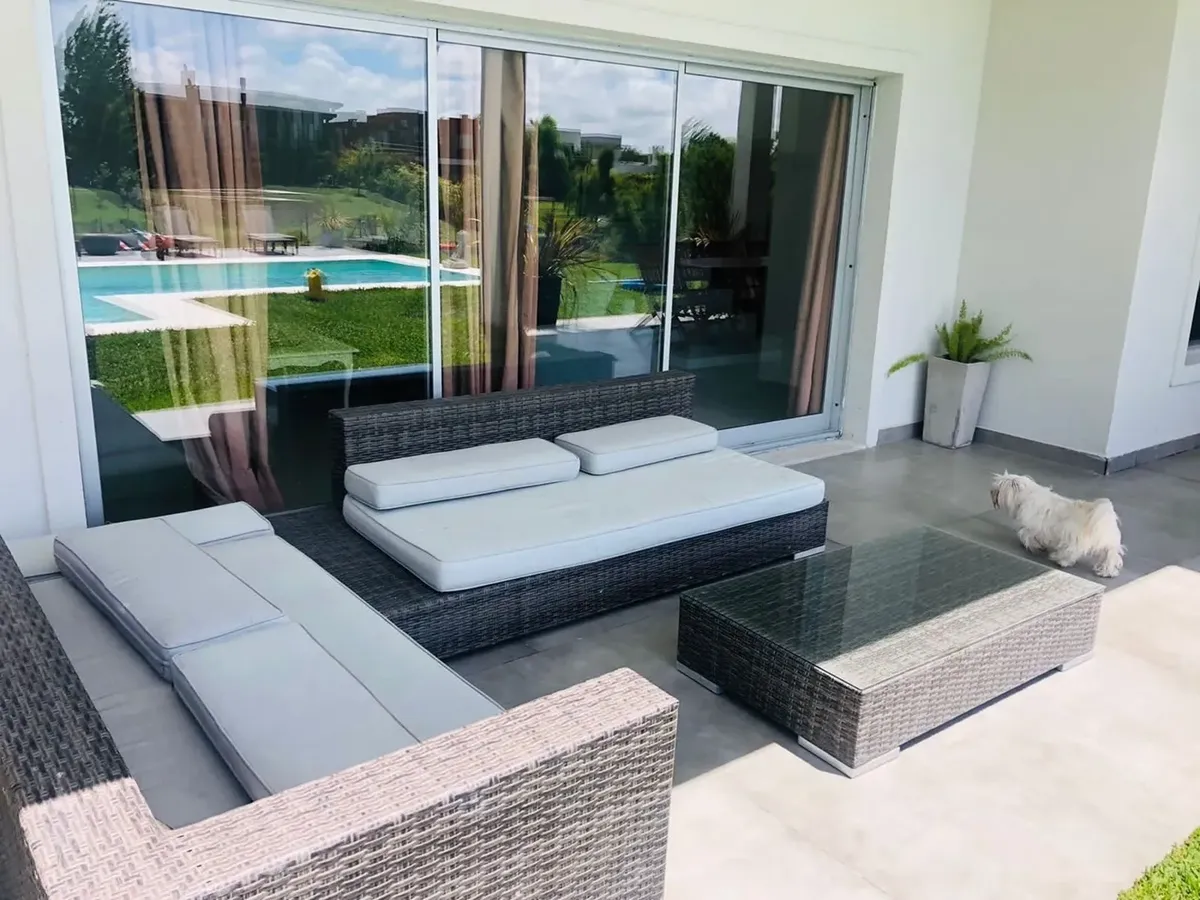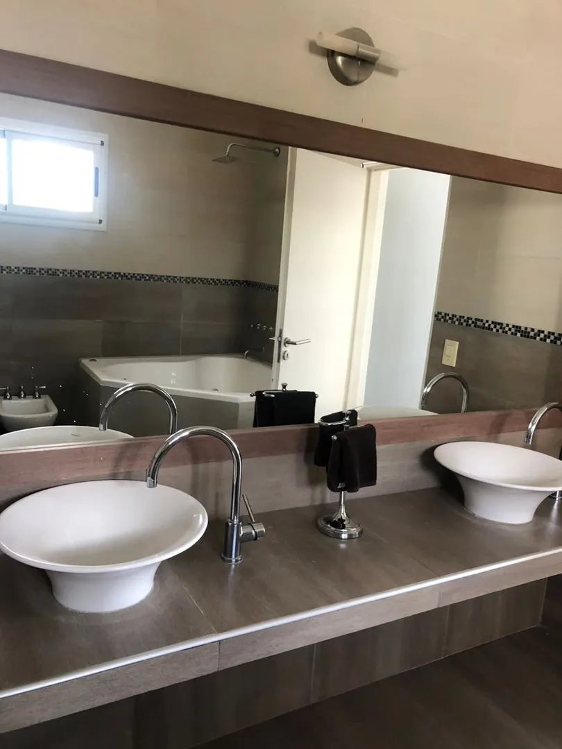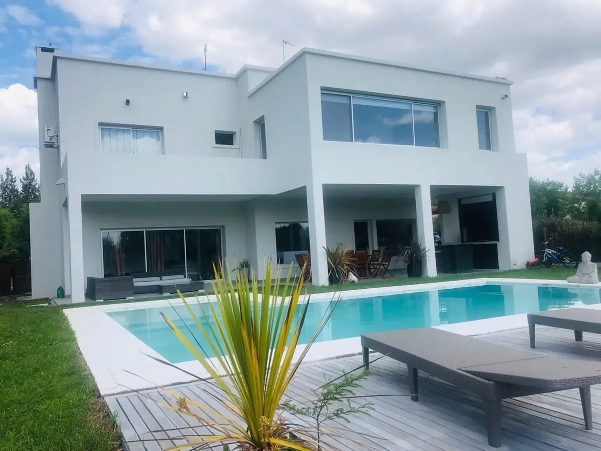 Minimalist-style house for rent in Santa Clara, Villanueva, Tigre, available from March 2026. It has 450 m² built on a 900 m² lot, with northeast orientation. The layout includes a double-height living room, dining room plus a second living-dining area, a kitchen with an island, five bedrooms (two en suite with walk-in closets), four full bathrooms and a guest toilet, and a study for home office use. There is a spa area with a sauna, a separate laundry area with independent access from the assig