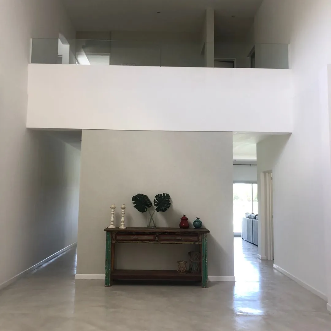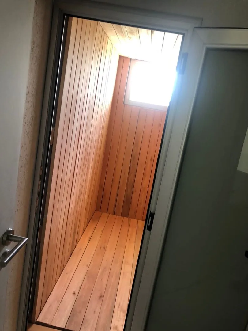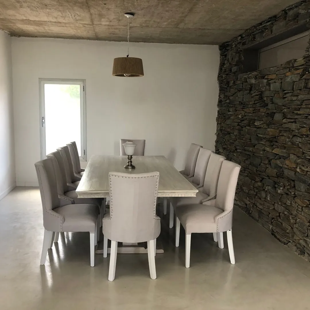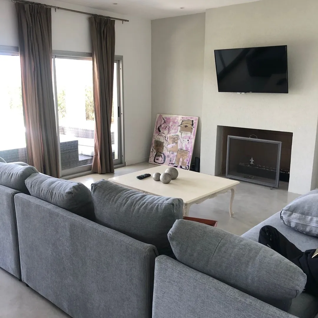 Minimalist-style house for rent in Santa Clara, Villanueva, Tigre, available from March 2026. It has 450 m² built on a 900 m² lot, with northeast orientation. The layout includes a double-height living room, dining room plus a second living-dining area, a kitchen with an island, five bedrooms (two en suite with walk-in closets), four full bathrooms and a guest toilet, and a study for home office use. There is a spa area with a sauna, a separate laundry area with independent access from the assig