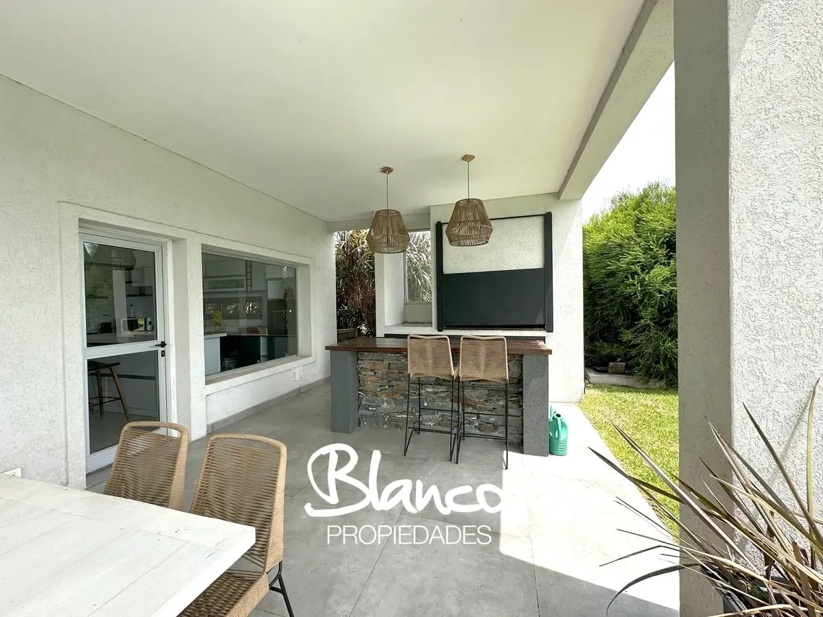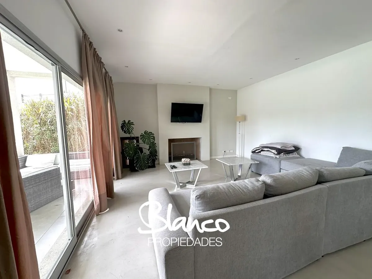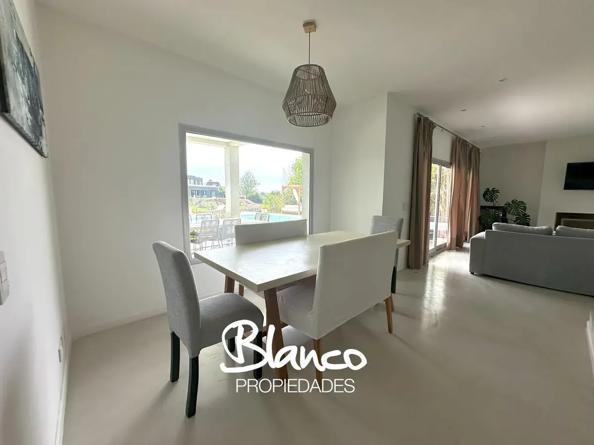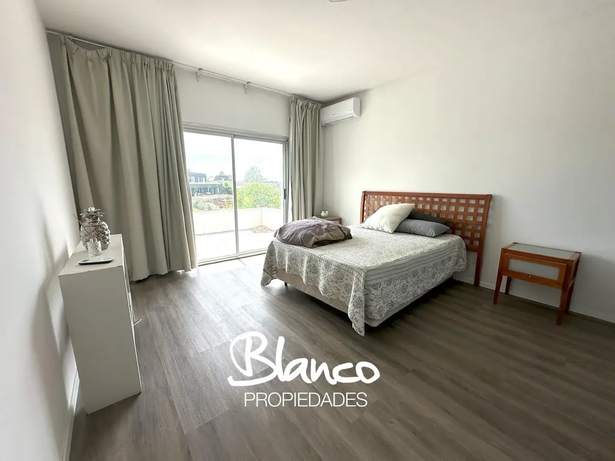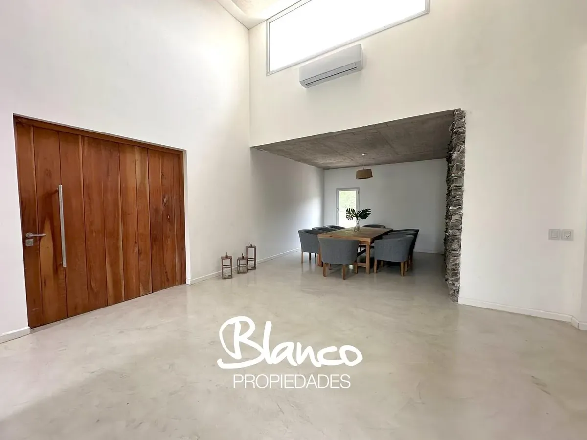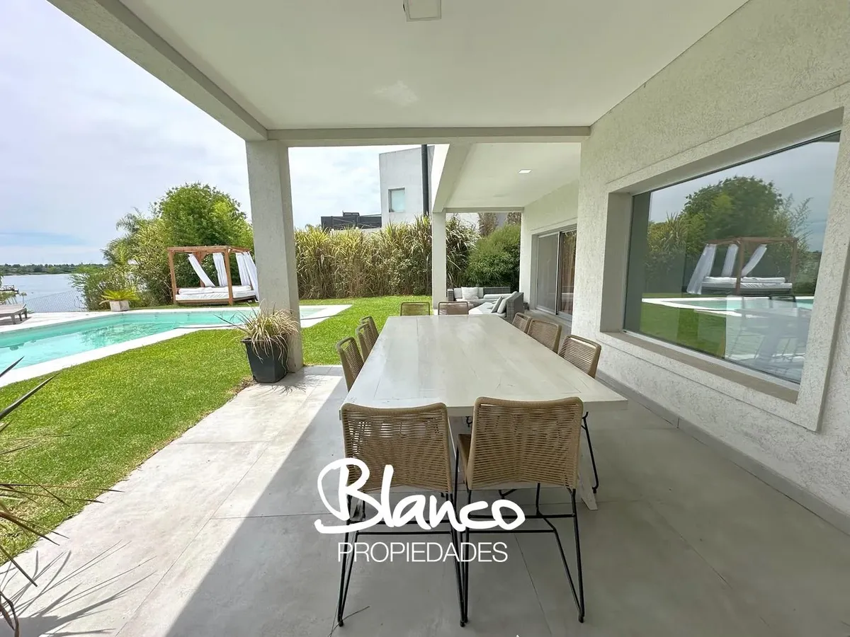 Furnished two-storey house in the Santa Clara - Villanueva gated neighbourhood in Tigre. The ground floor includes a double-height living room, dining room, kitchen with daily dining area and central island, a guest toilet, an office and a guest bedroom. The upper floor has a master suite with walk-in wardrobe, three additional bedrooms with built-in wardrobes and large windows, plus a 56 m² terrace balcony. Outdoors include a covered gallery with a table and outdoor lounge, a garden with a pool