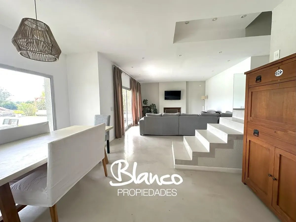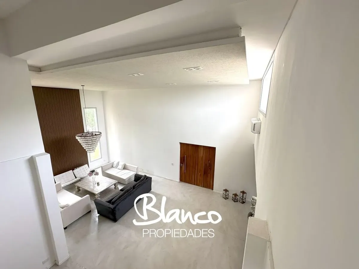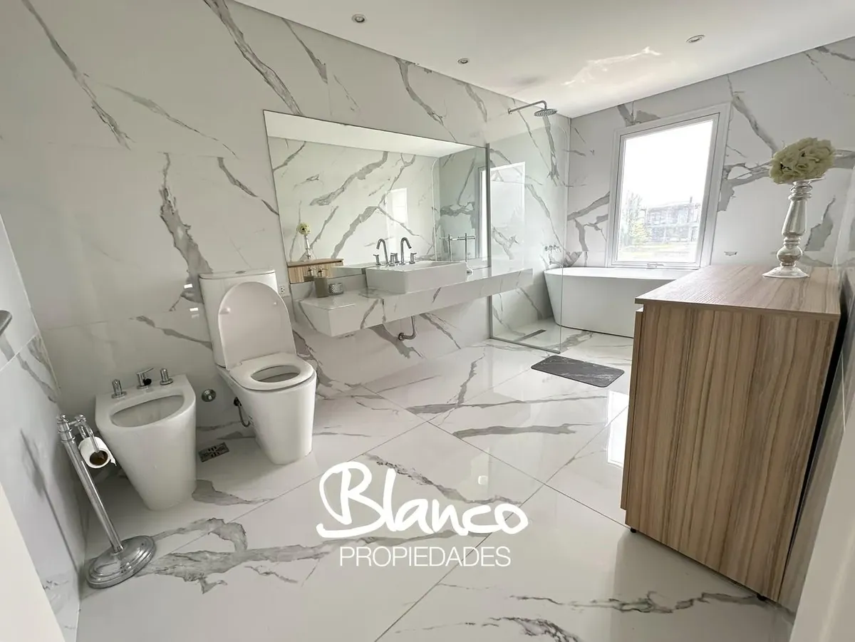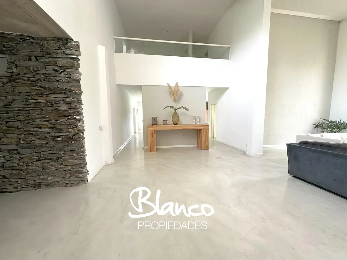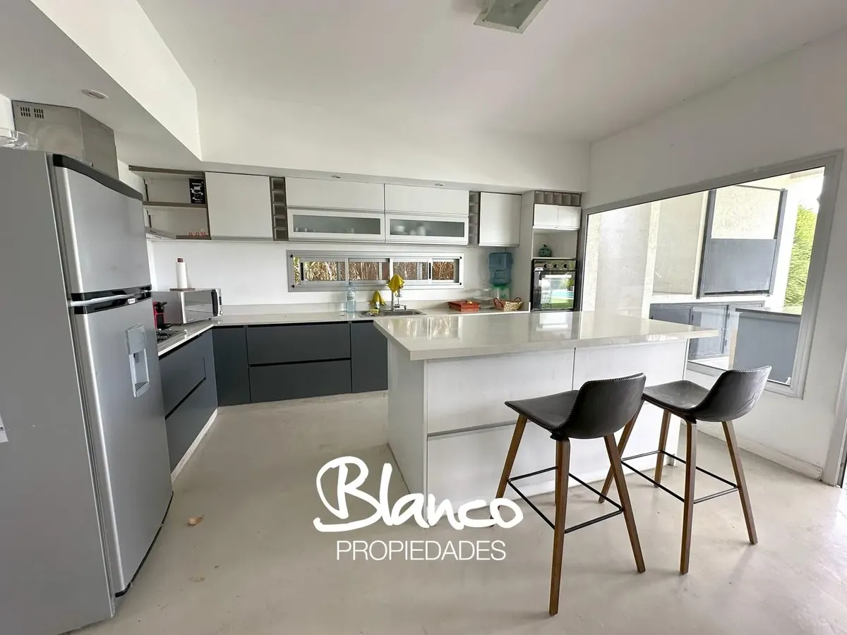 Furnished two-storey house in the Santa Clara - Villanueva gated neighbourhood in Tigre. The ground floor includes a double-height living room, dining room, kitchen with daily dining area and central island, a guest toilet, an office and a guest bedroom. The upper floor has a master suite with walk-in wardrobe, three additional bedrooms with built-in wardrobes and large windows, plus a 56 m² terrace balcony. Outdoors include a covered gallery with a table and outdoor lounge, a garden with a pool