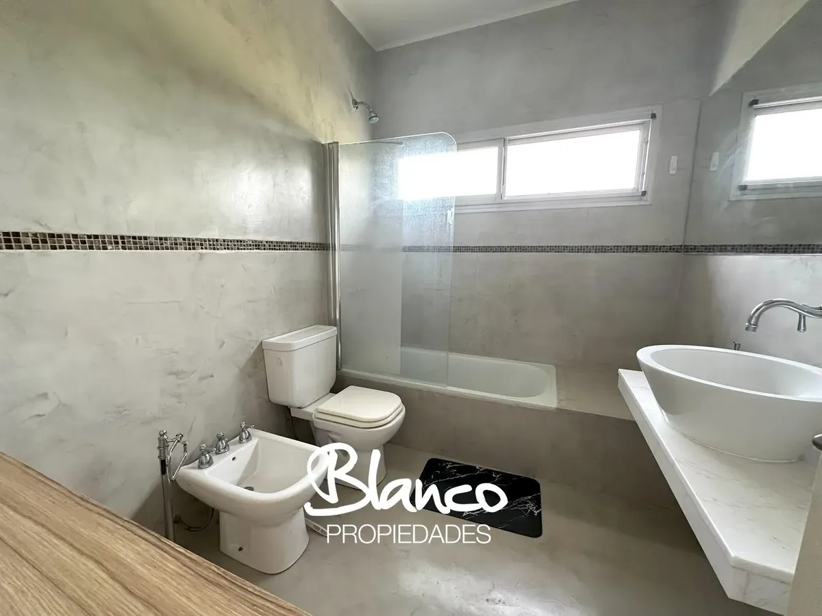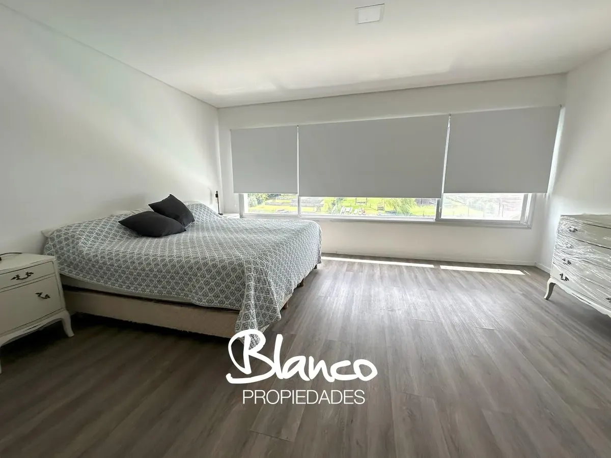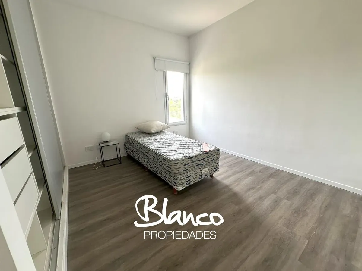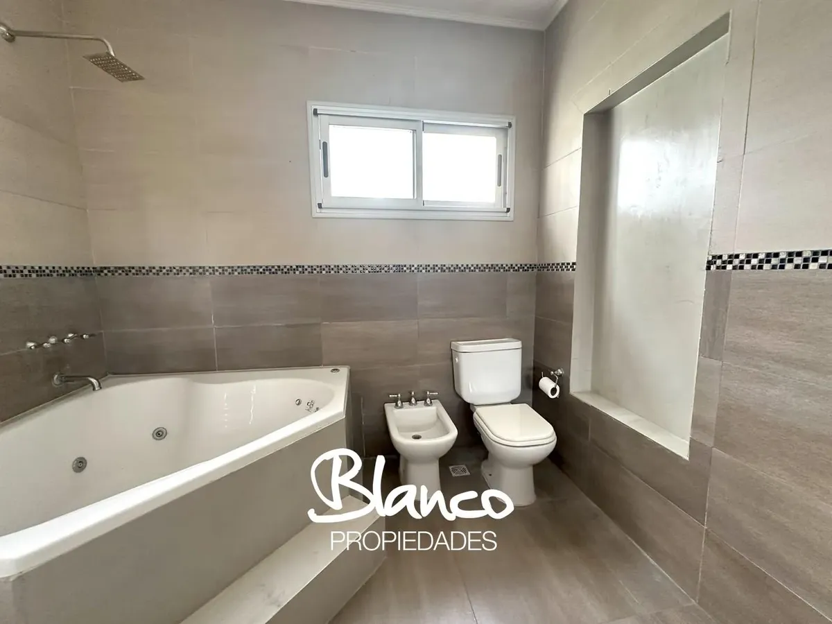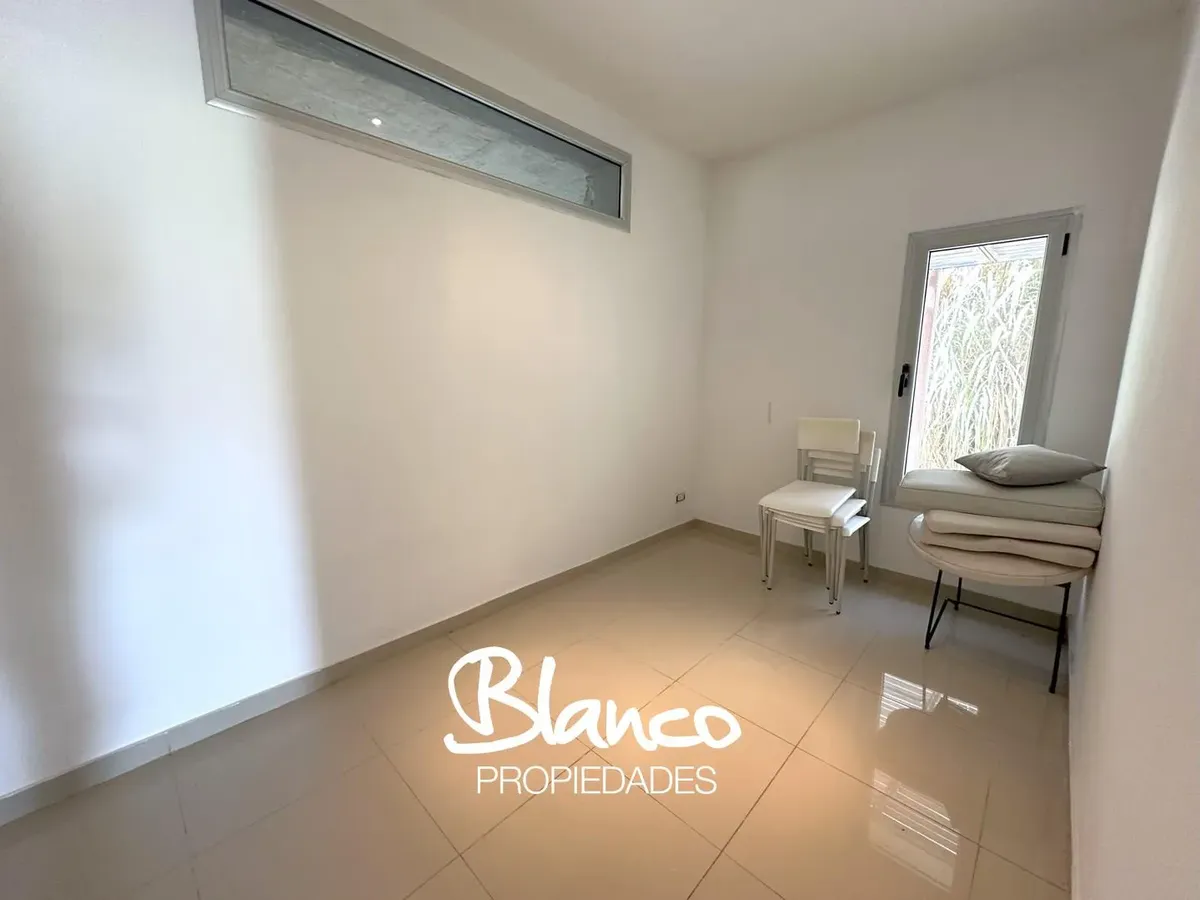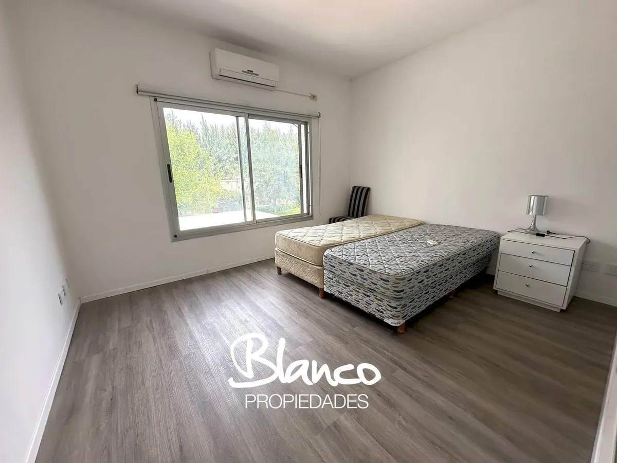 Furnished two-storey house in the Santa Clara - Villanueva gated neighbourhood in Tigre. The ground floor includes a double-height living room, dining room, kitchen with daily dining area and central island, a guest toilet, an office and a guest bedroom. The upper floor has a master suite with walk-in wardrobe, three additional bedrooms with built-in wardrobes and large windows, plus a 56 m² terrace balcony. Outdoors include a covered gallery with a table and outdoor lounge, a garden with a pool