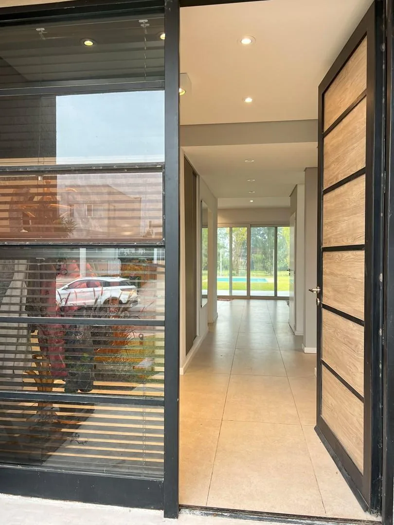 Two-storey house for rent in Barrio Los Castaños, Nordelta, available from June 2026. The ground floor has a living-dining area with an integrated kitchen, a reception toilet with shower, a TV/playroom or 5th bedroom, a service dependency with a full bathroom, and a separate laundry area. The upper floor includes a primary bedroom en suite with a dressing area and access to a large terrace, two bedrooms in semi-suite, a junior suite, and a second living/playroom or study. Exterior features inclu