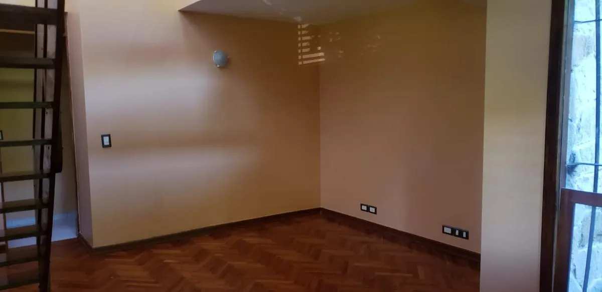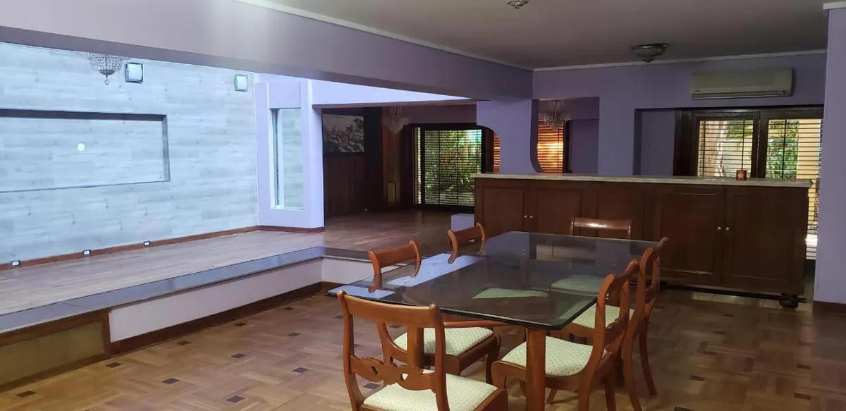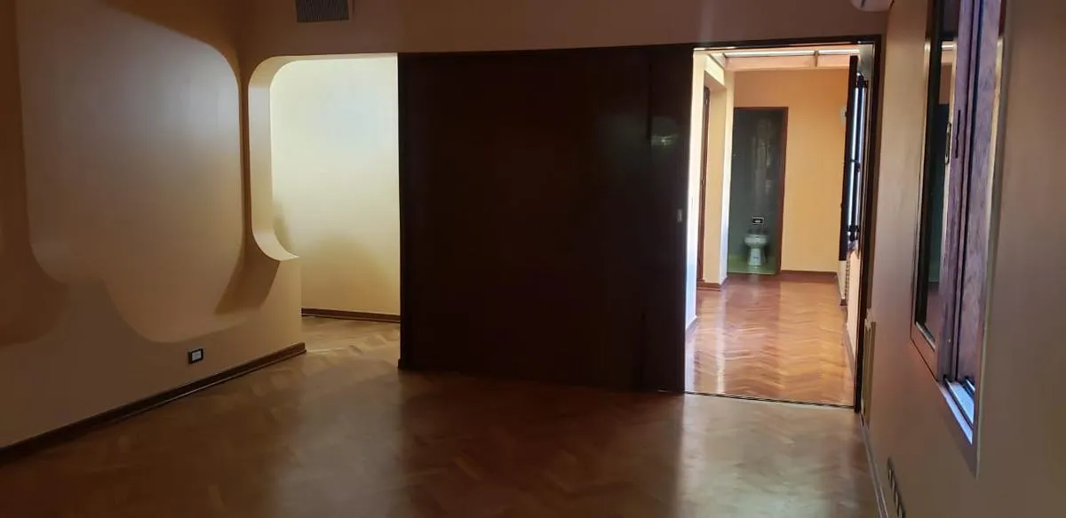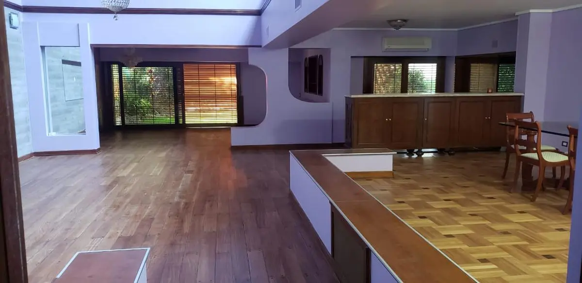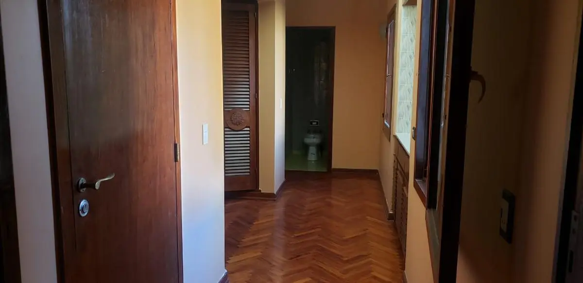 House for rent in Martínez with 7 rooms. Ground floor includes a reception hall, cloakroom with anteroom, a living room measuring 7.5 x 9 m with parquet floors, a split-level dining room (7.5 x 4.5 m), an integrated playroom (4.5 x 7 m) with windows to the garden, a 4 x 4 m study, and an eat-in kitchen with an independent entrance. A covered garage for 2 cars, separate laundry, and a service bedroom with a bathroom are included. Upstairs has a front en-suite bedroom with mezzanine, a main en-sui