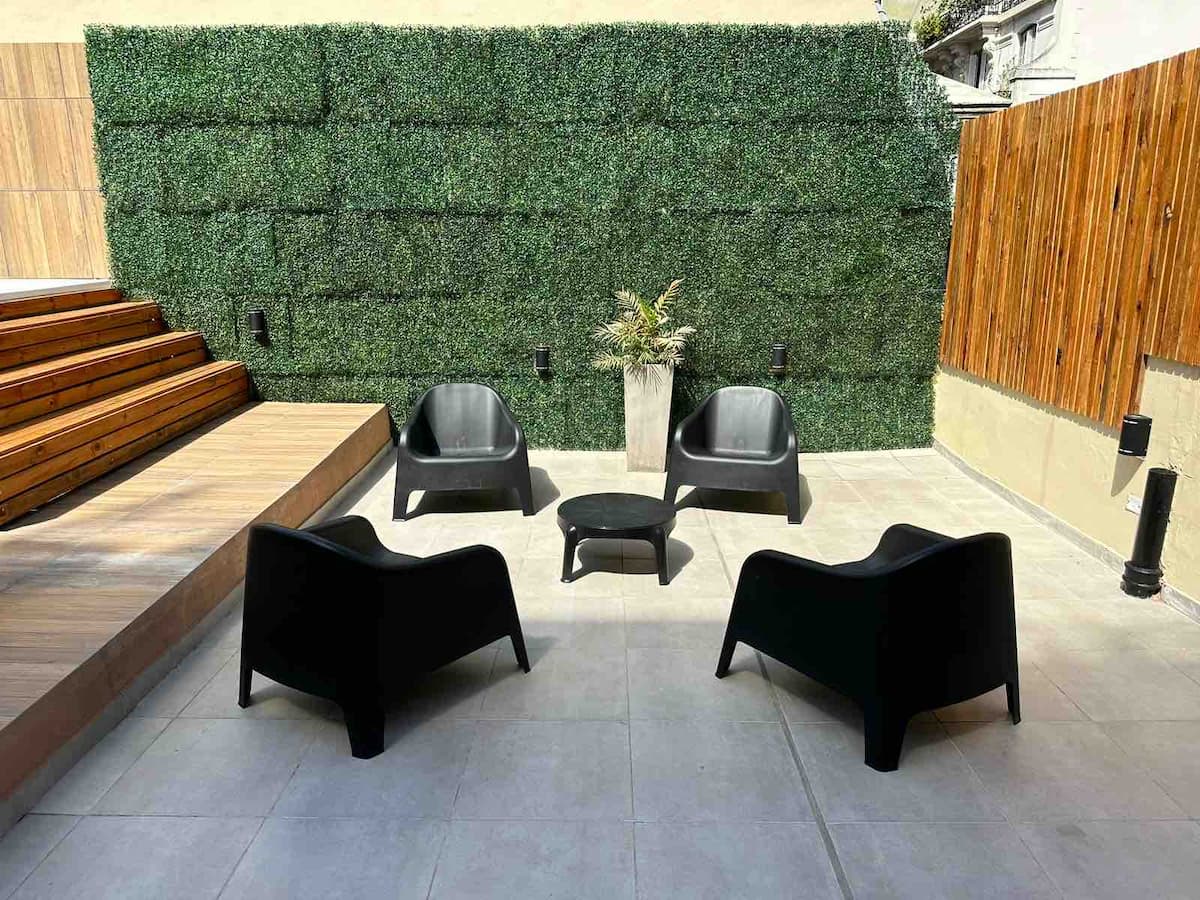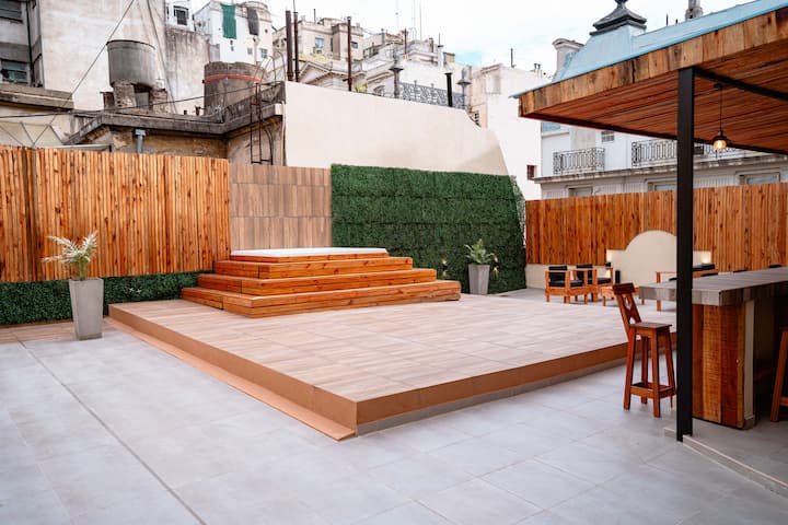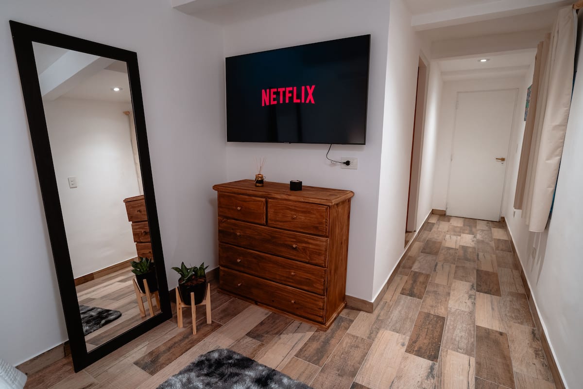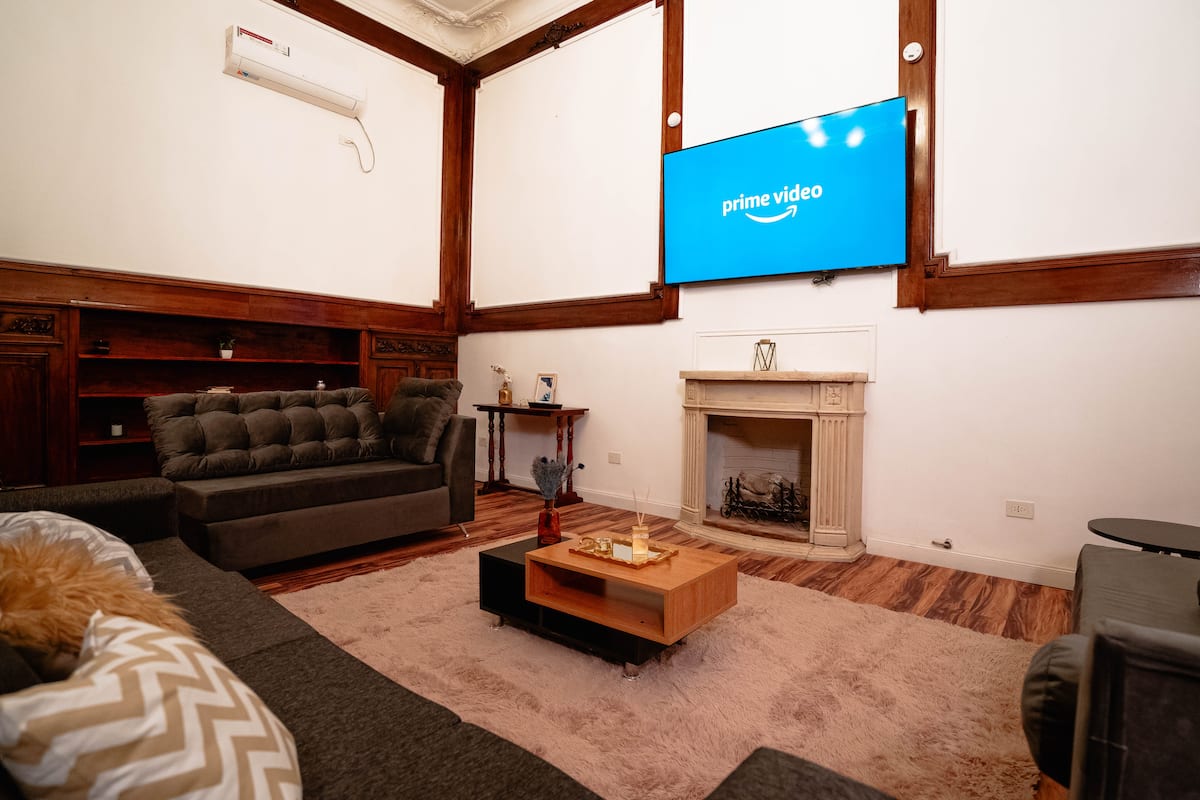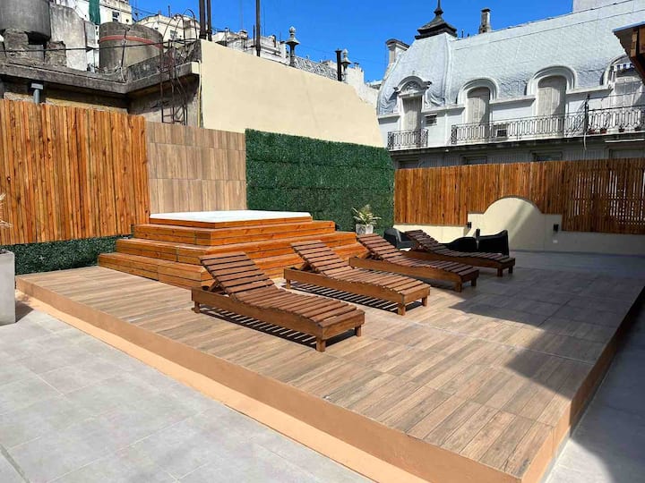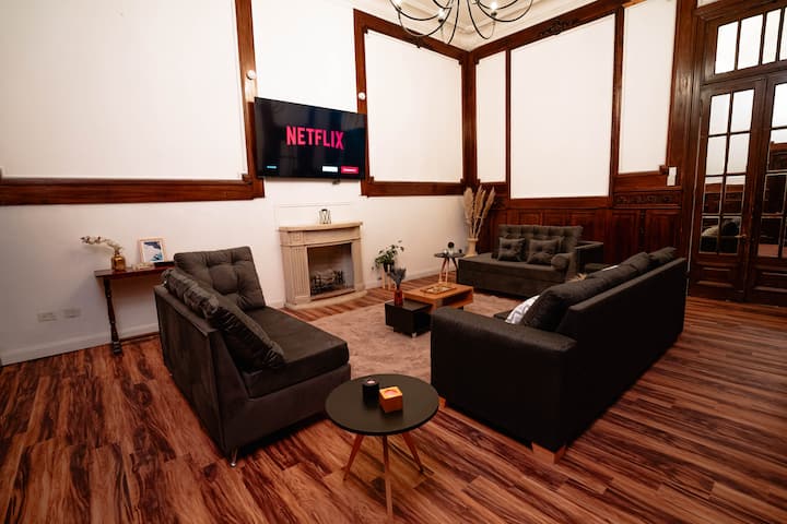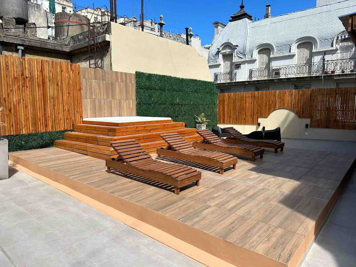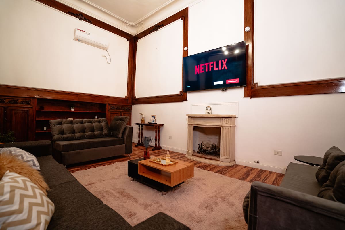 Renovated apartment with 700 m², configured as a six-bedroom mansion in Retiro. Each of the 6 bedrooms has an en-suite bathroom, with sleeping capacity for up to 19 people. Entertainment and connectivity include LED TVs with Netflix and Amazon in each bedroom, 75" Samsung TVs in the living room and on the rooftop terrace, and high-speed internet with a router on each floor. The rooftop terrace has a jacuzzi, outdoor shower, grill, covered bar area and a half bathroom.