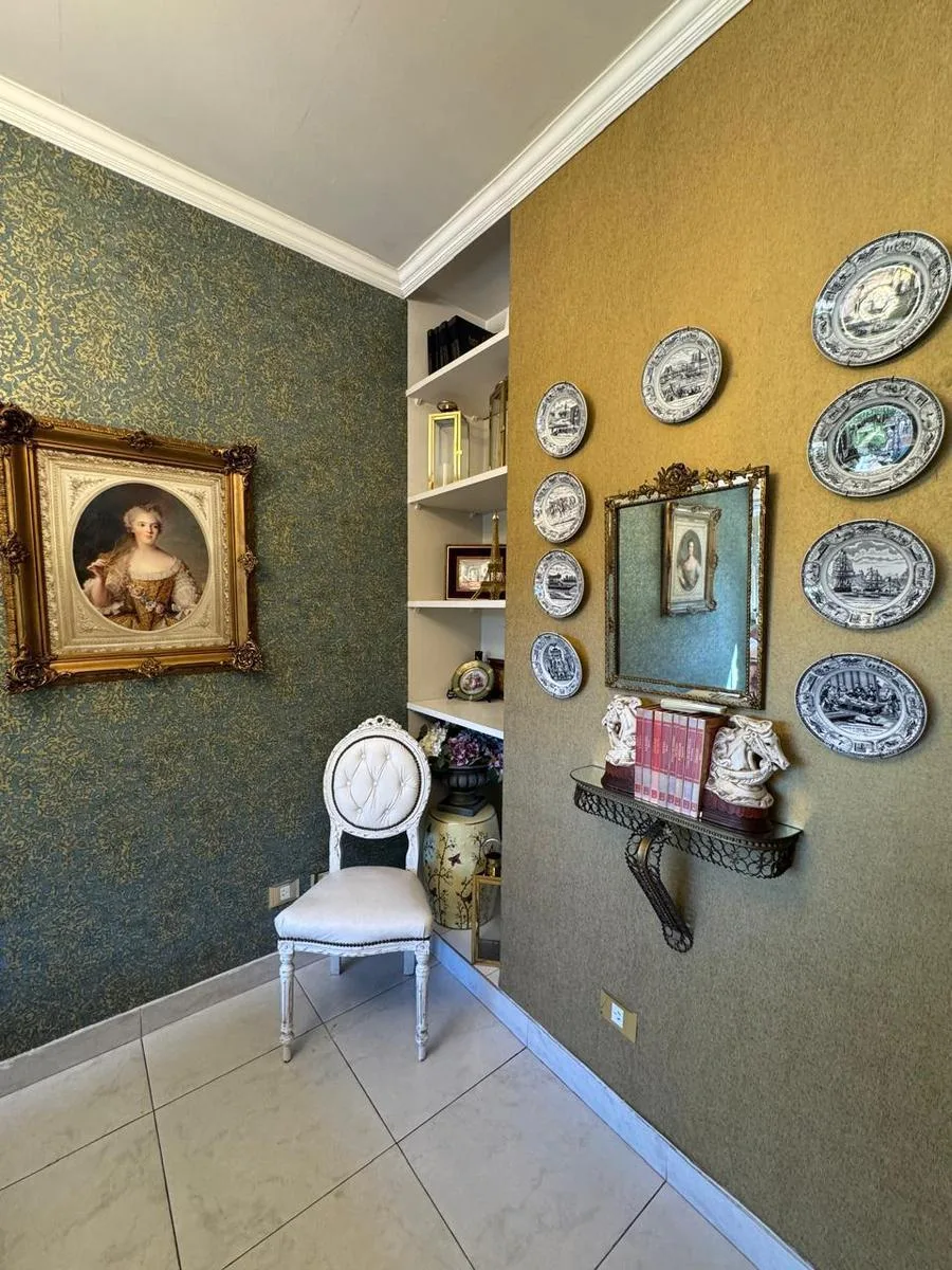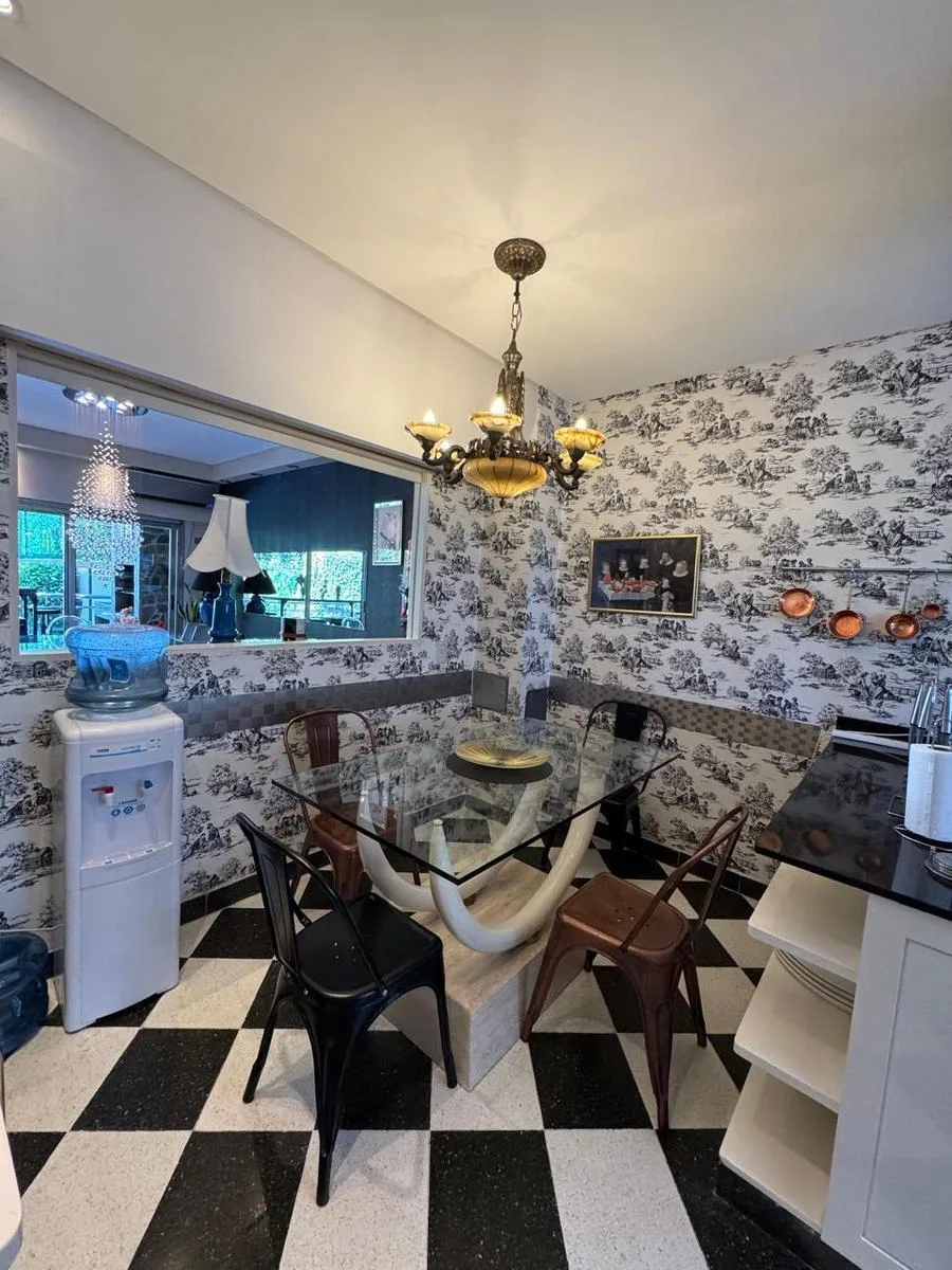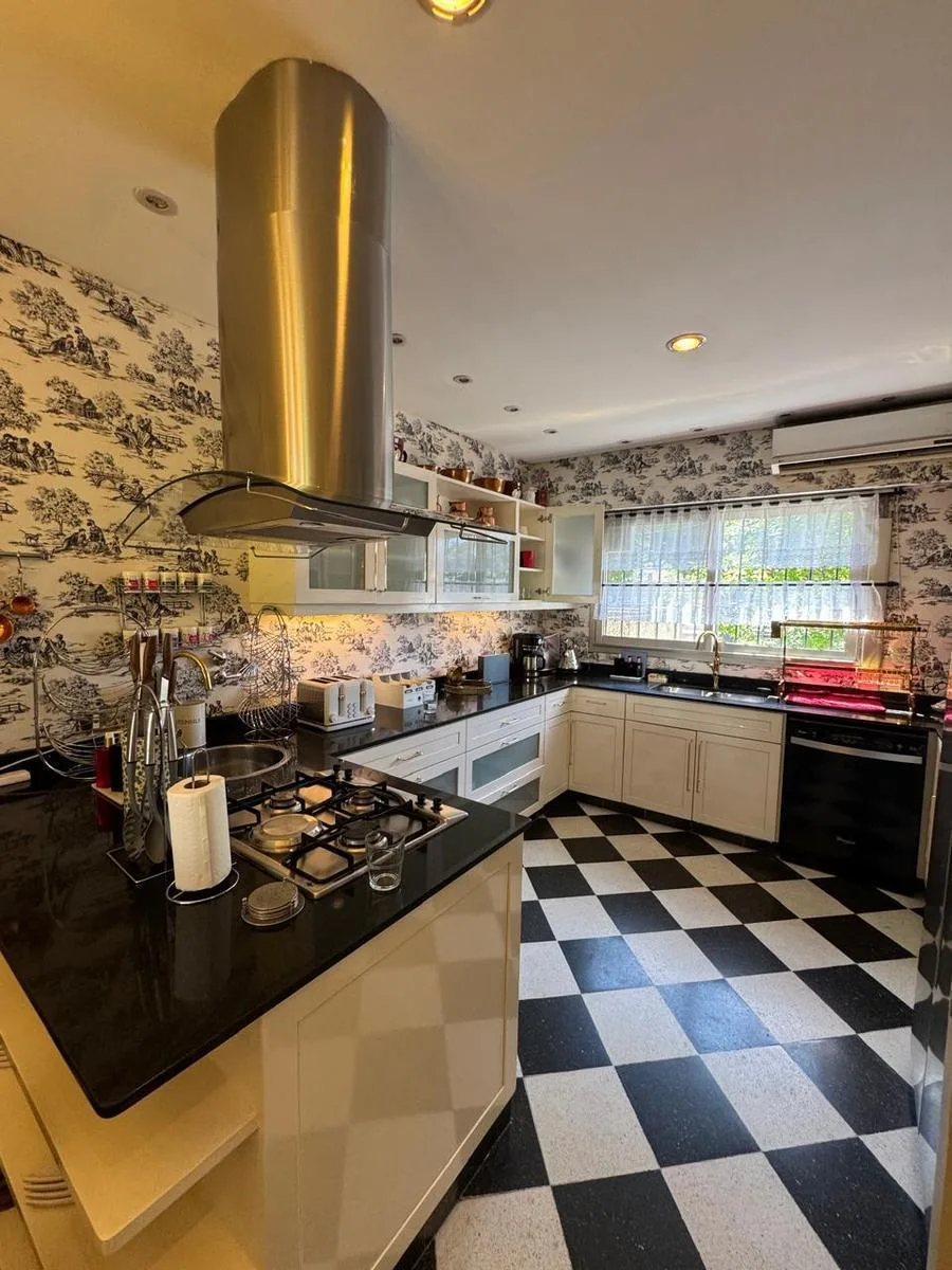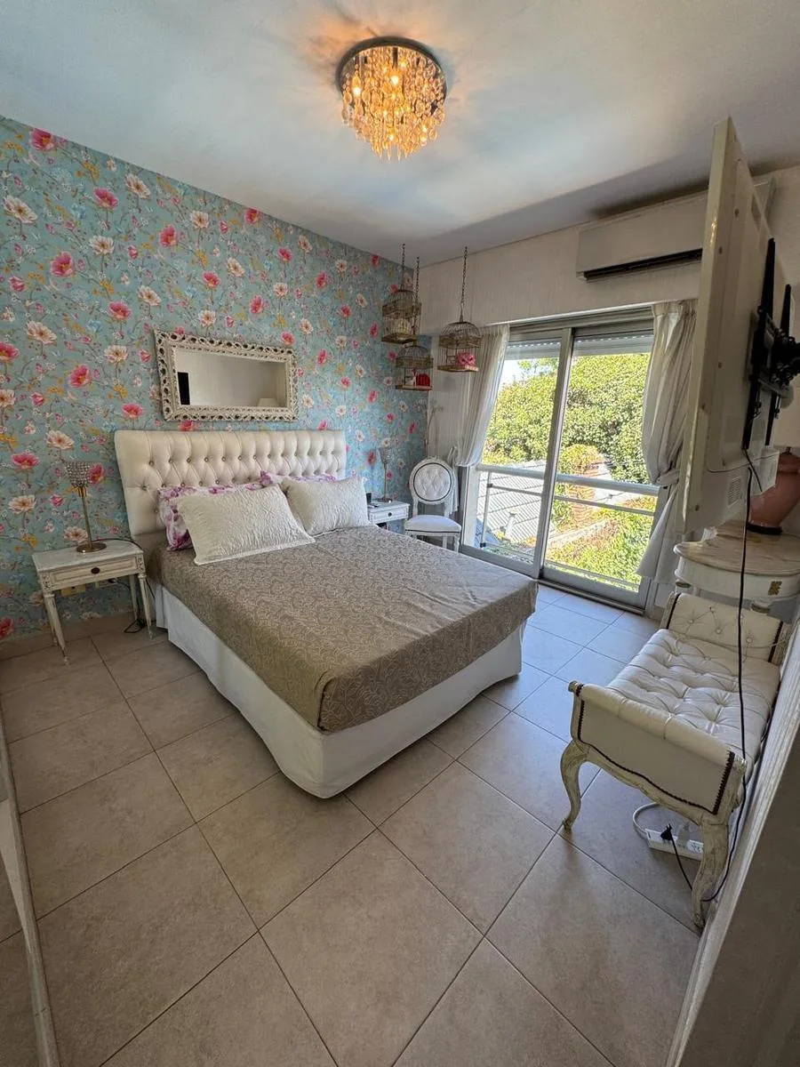 Furnished six-bedroom house with a landscaped park and a pool in Saavedra. The ground floor has a hall, a large living-dining room with pass-through windows to a gallery with a grill, a spacious fully equipped kitchen with a daily dining area, and a guest toilet. On the first floor there is a master suite with a dressing room, a large bathroom with double vanity and hand-painted finishes and bronze fixtures, plus a jacuzzi; the suite opens to a balcony overlooking the park. Two additional bedroo