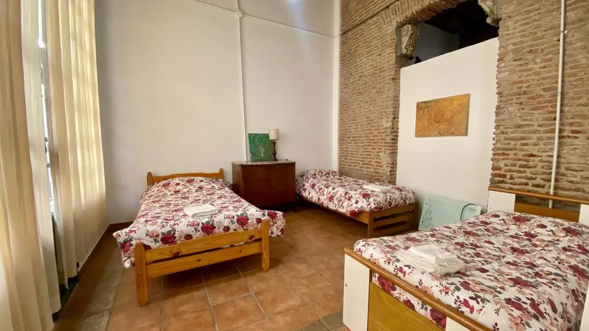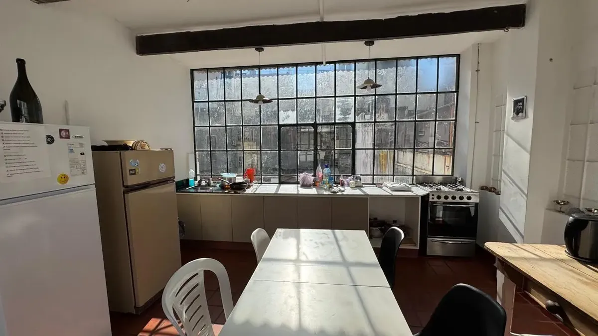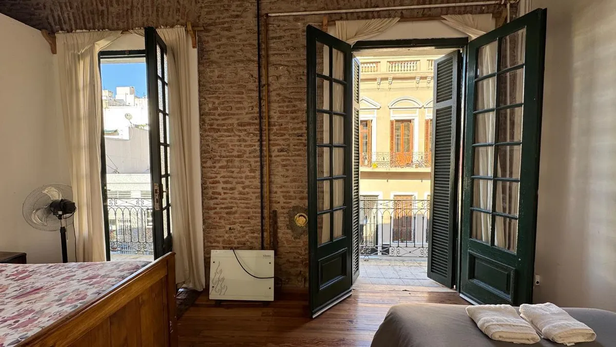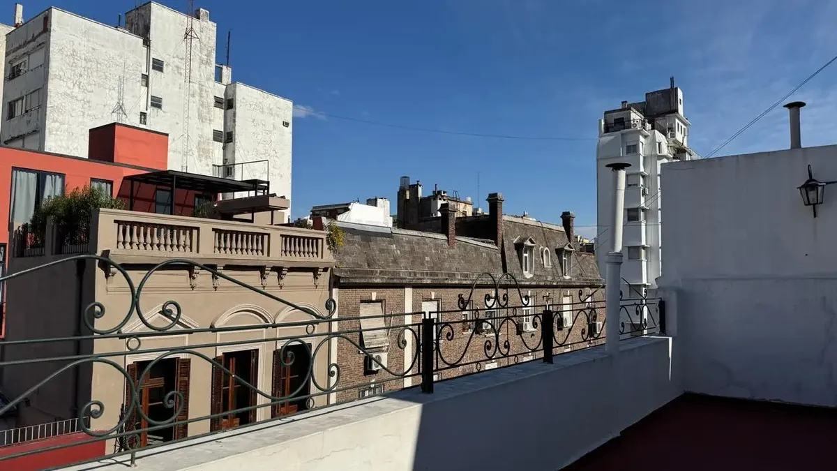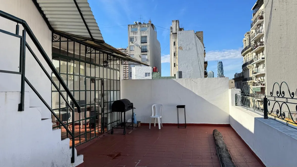 Daily rental house in San Telmo with capacity for 20 guests. The property has 8 private rooms and 4 bathrooms, with 3 rooms and 1 bathroom on the ground floor. The layout includes a patio area with stairs to a fourth room with a private bathroom, 3 additional rooms with a bathroom on the upper floor, and one further room with a bathroom on the top floor. Beds include double and single options; the kitchen and terrace include a grill (parrilla) and a gas oven. Wi-Fi covers the entire house, and t