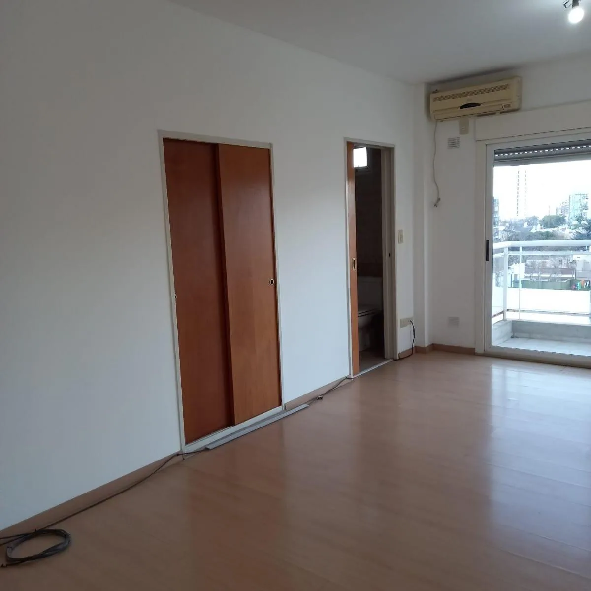 Studio apartment with fitted wardrobe, full bathroom, integrated kitchen with oven and water heater (termotanque), and a balcony. Courtyard-facing view towards an interior block courtyard (pulmón de manzana). Covered parking is available as an option for an additional ARS 530,000. Building has a laundry room and elevator.