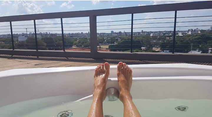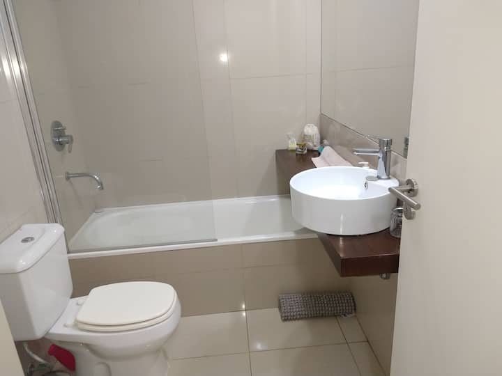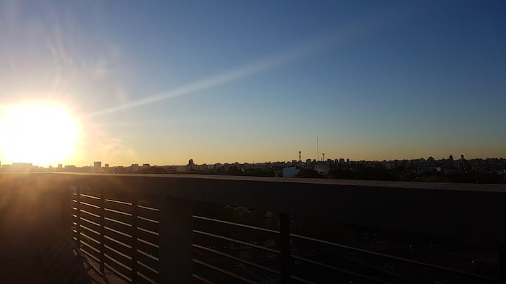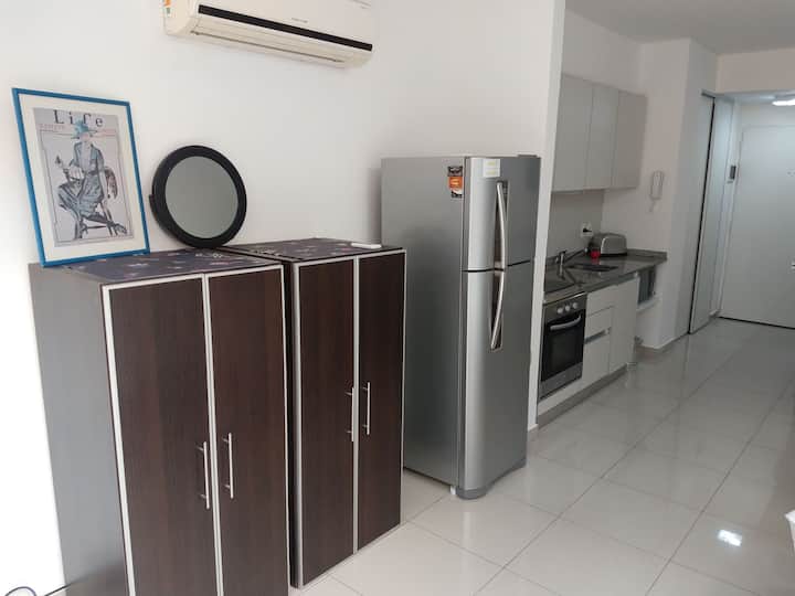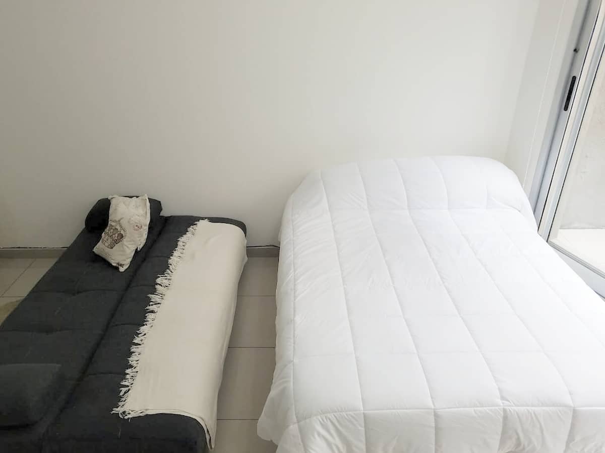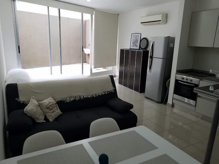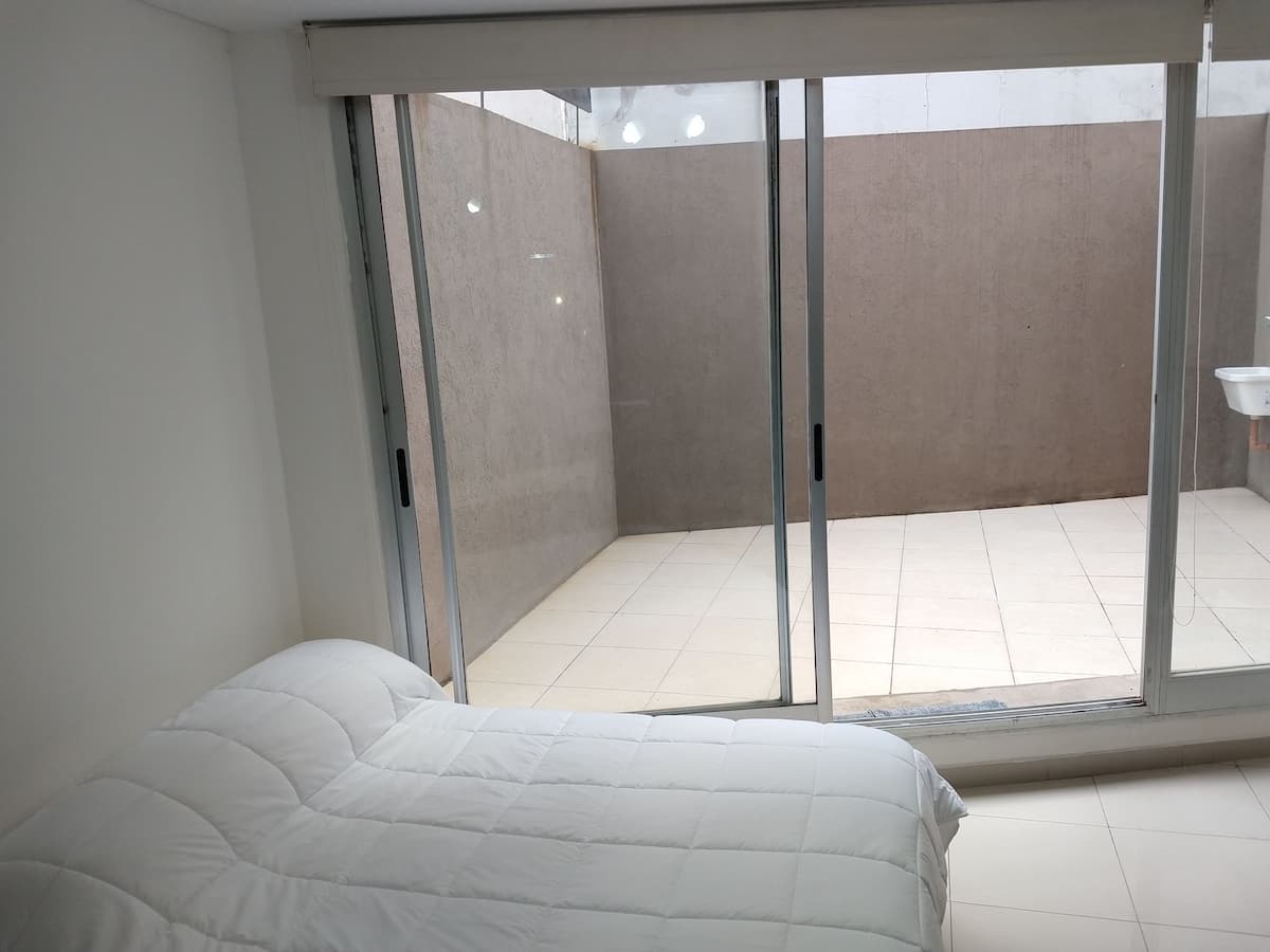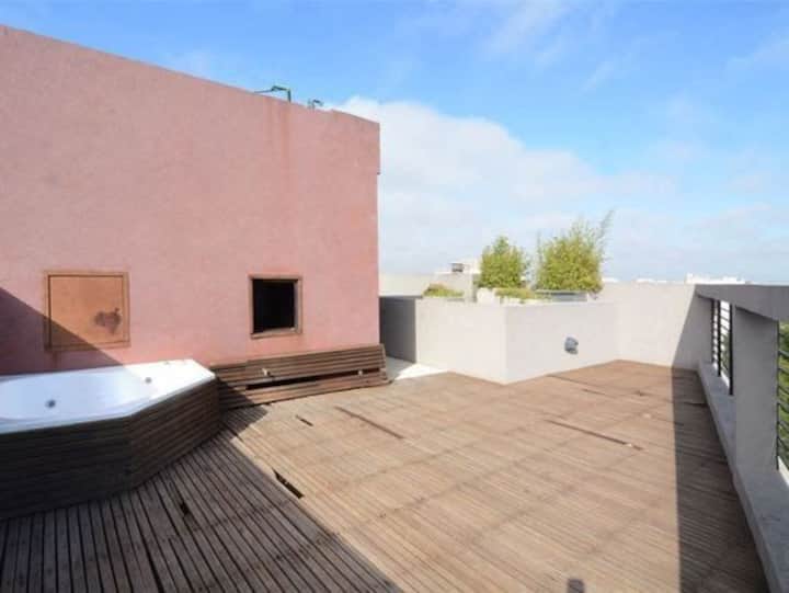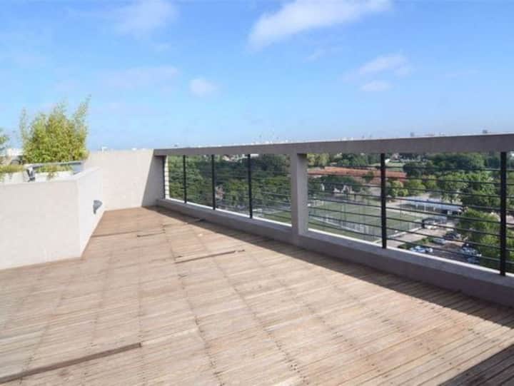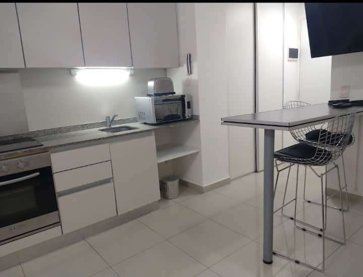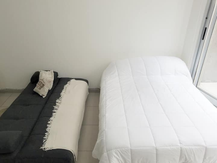 Studio apartment in Villa del Parque in a new, quiet building. It has 1 room with a double bed plus a sofa bed and a large patio that provides light and a private outdoor space. The building includes a gym, an outdoor jacuzzi, a grill area, a green recreation space, and a panoramic terrace on the 10th floor, as well as a laundry and a communal room (SUM) for meetings with an elevator.