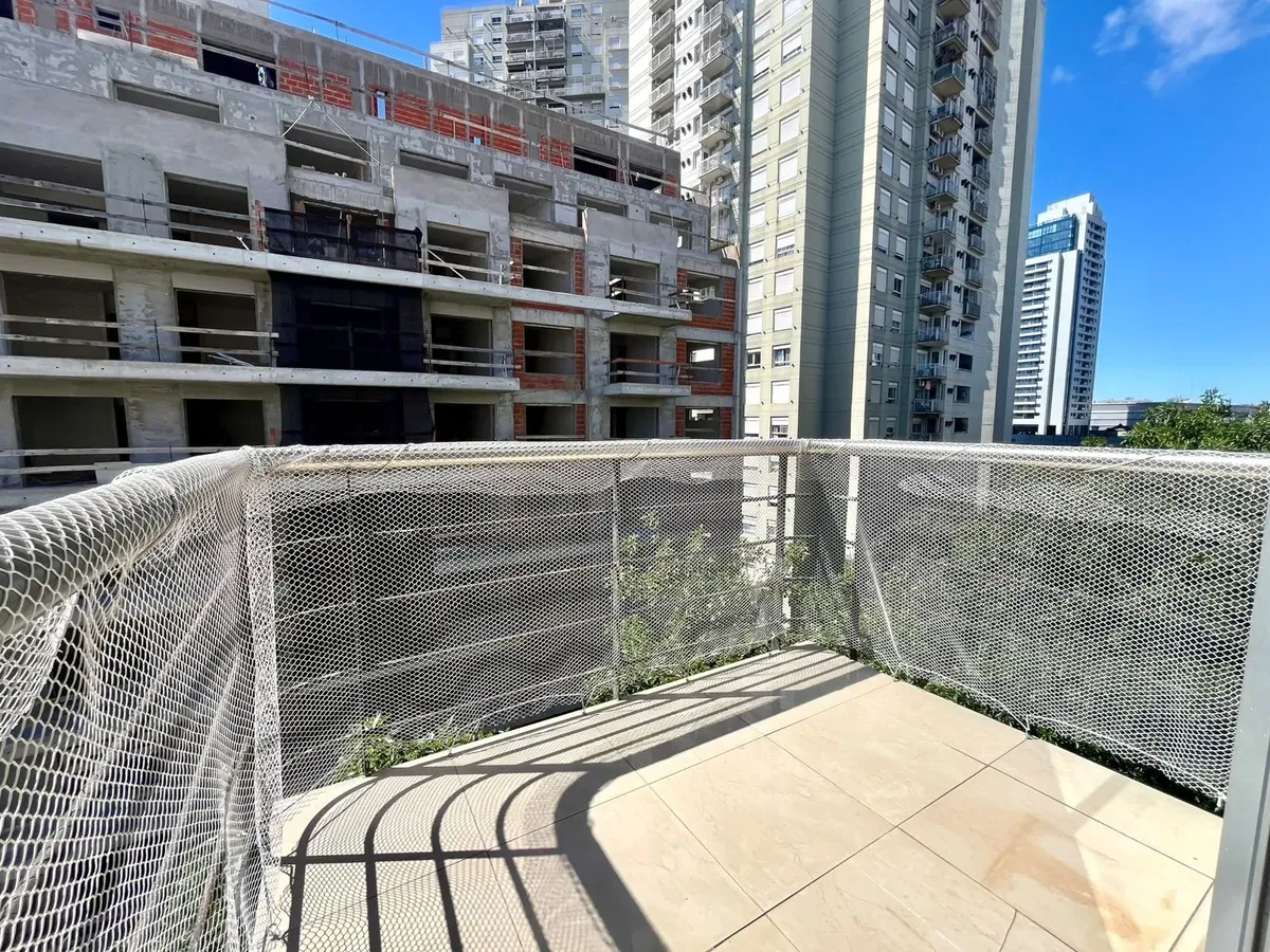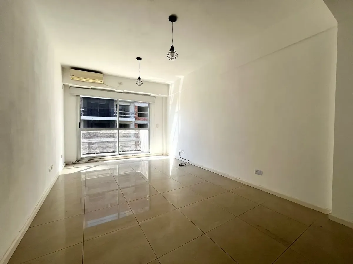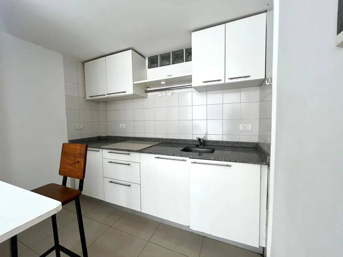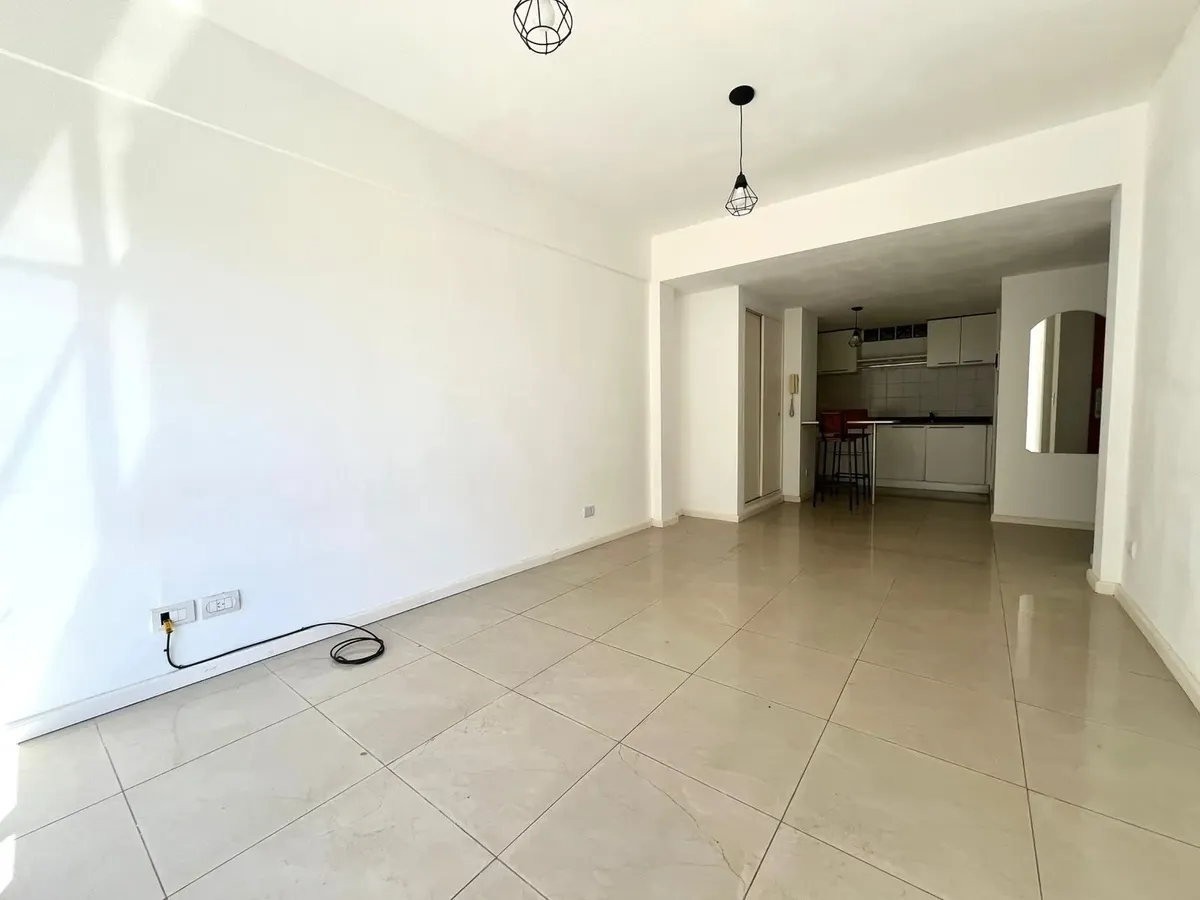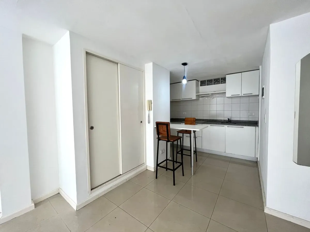 Studio apartment with a front-facing balcony. Semi-integrated kitchen, full bathroom with bathtub, built-in wardrobe, and heating and cooling with air conditioning (cold/heat) plus hot water via a boiler. Location is on Sánchez de Bustamante at 600, in Almagro.