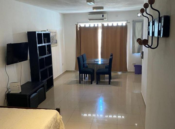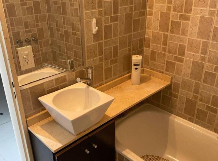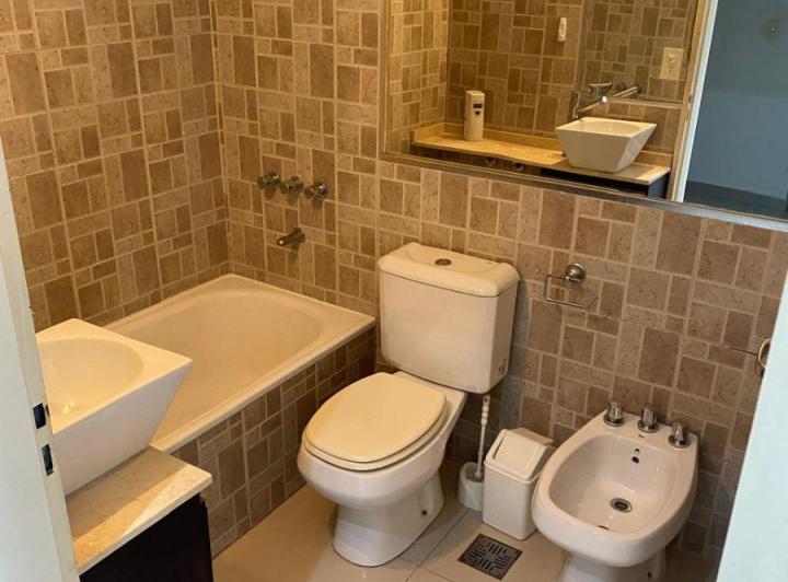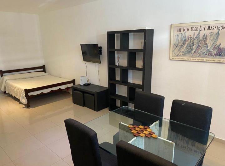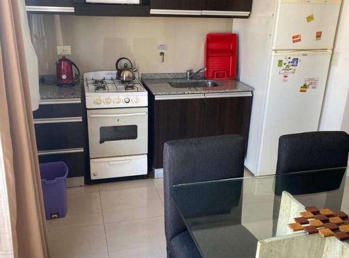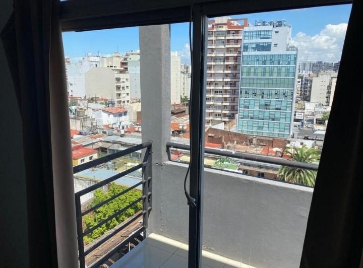 Studio apartment in Almagro with a balcony. It is furnished and equipped with a double sommier, wardrobe, table and chairs, cable TV, WiFi internet, and air conditioning. The kitchenette has a gas cooktop and oven, microwave, and a refrigerator with freezer, plus tableware and utensils. There is a full bathroom with a bathtub. Parking is optional for an additional fee. Building fees and other utilities are not specified; electricity is paid by the tenant. Located about 3 blocks from Av. Corrient