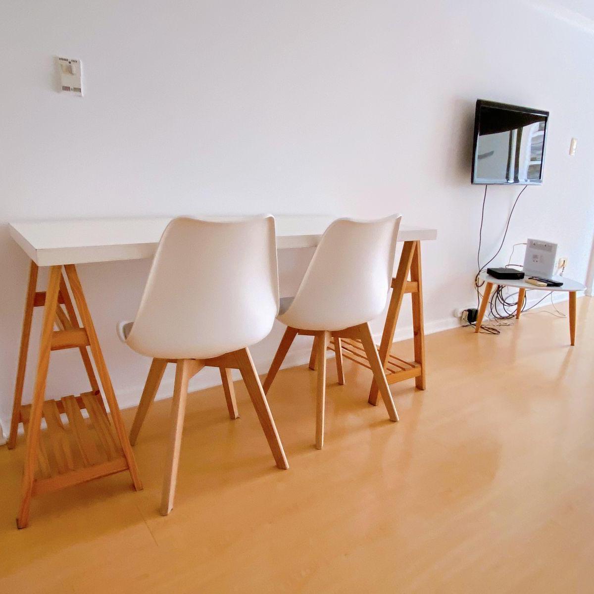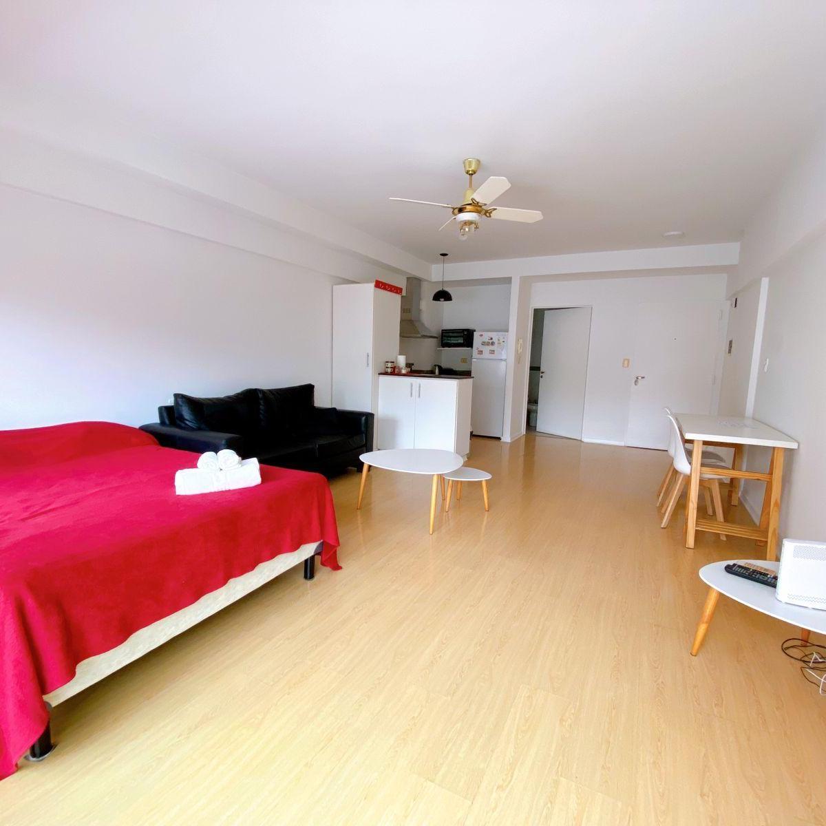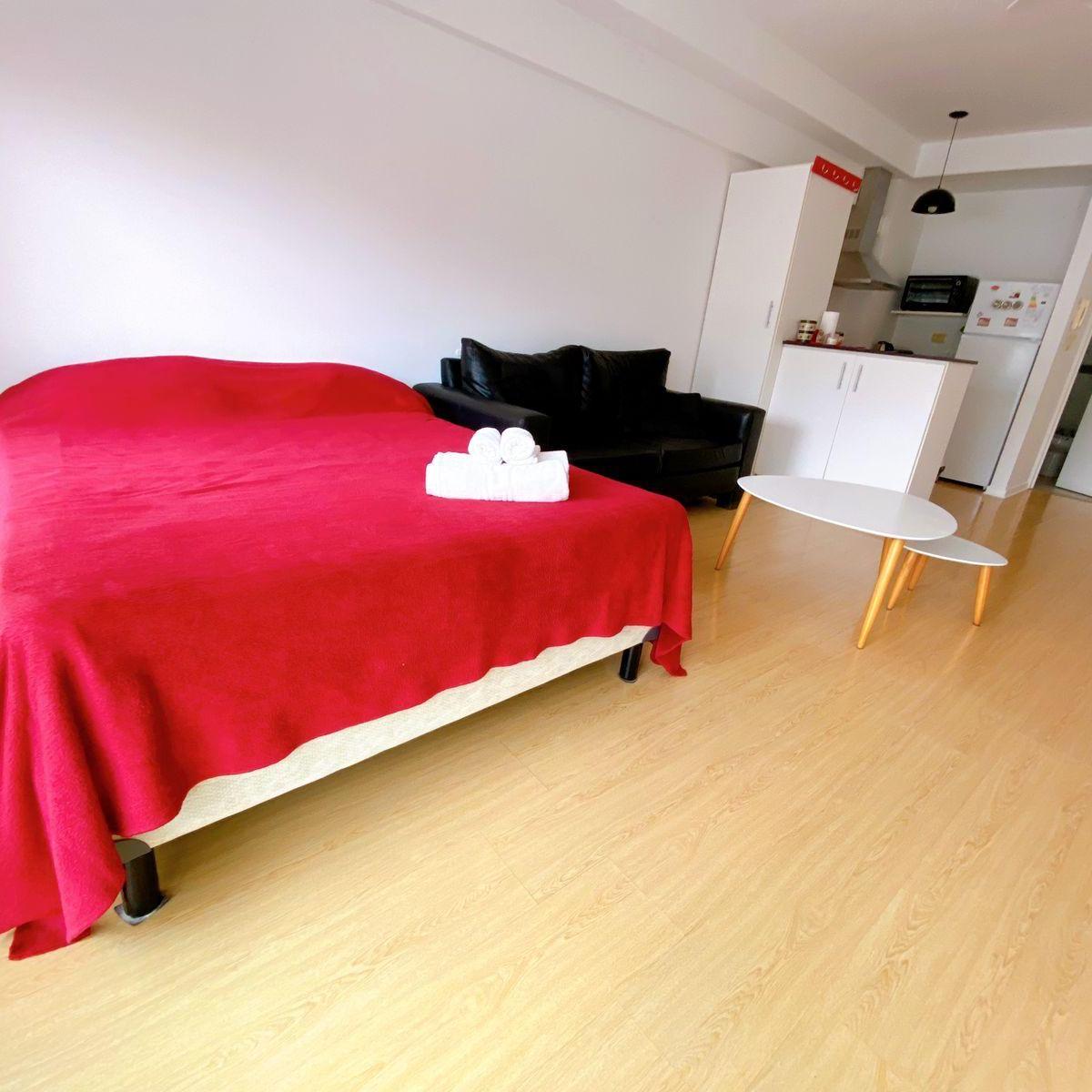 Studio apartment in Almagro of 35 m² for up to 4 people. The unit is furnished with a double bed, a sofa, a table and chairs, and includes a full bathroom with bath and bidet, and a kitchen with electric cooktop, electric oven, electric kettle, toaster and refrigerator. There is a TV, Wi‑Fi, air conditioning and heating, plus a balcony with deck chairs. Monthly rent is $420.000, with building fees and services paid by the tenant.