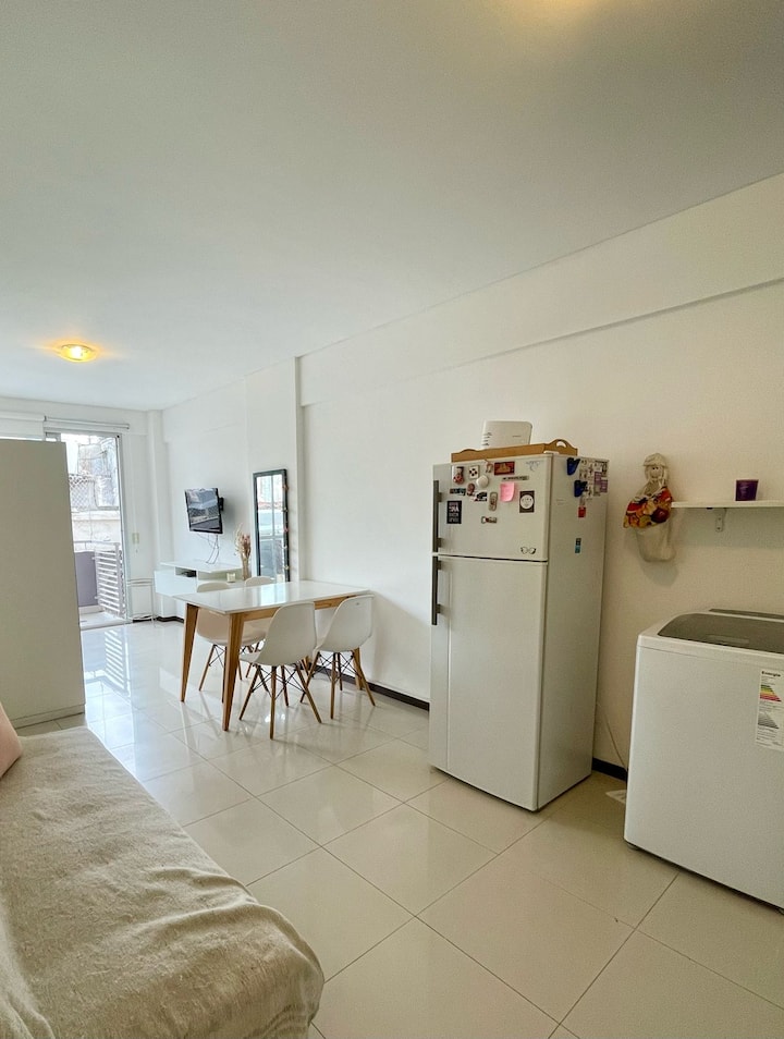 Studio apartment in Almagro with a balcony. Double-burner recently added. Curtains are installed, but they are not blackout curtains. Approximately 400 metres from Parque Centenario and 200 metres from Italian Hospital; Subte is about 5 blocks away.