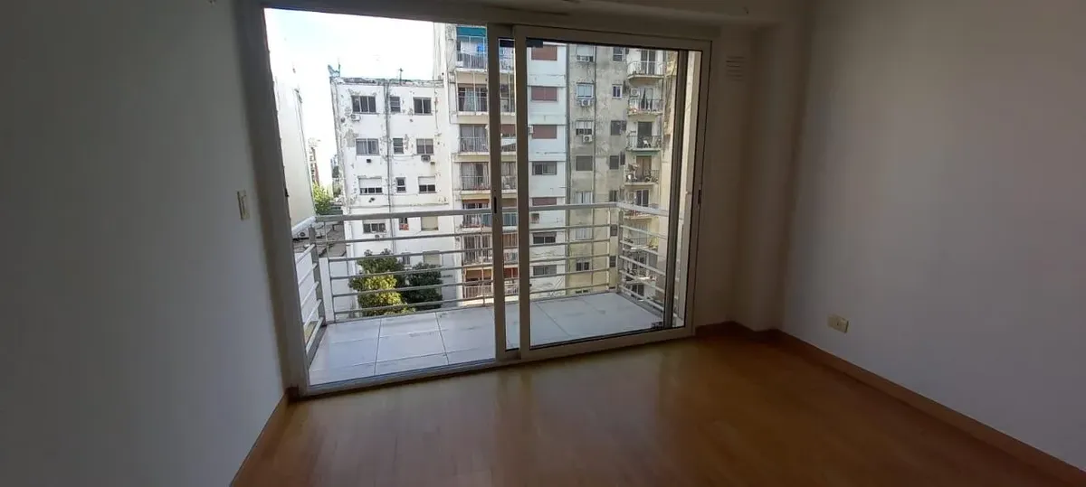 Studio apartment for rent in Almagro, ready to move in. The unit is on the 6th floor, courtyard-facing, with a balcony. The building is about 15 years old and includes a pool and laundry; it has a large moving elevator. The lease is for 2 years with quarterly rent increases based on IPC. No pets allowed; rental guarantee is through a rental guarantee bond (seguro de caucion).