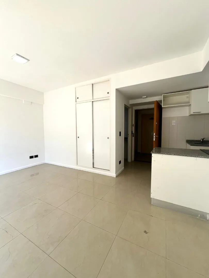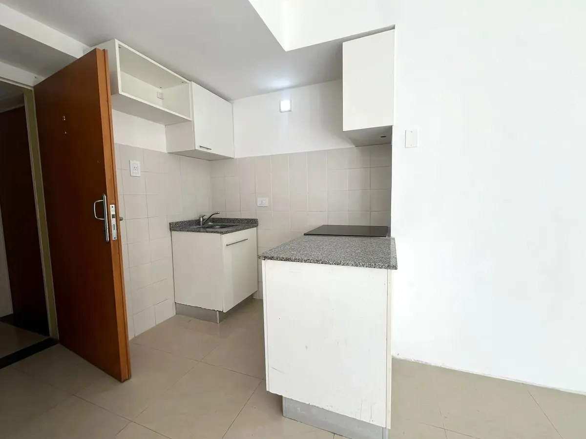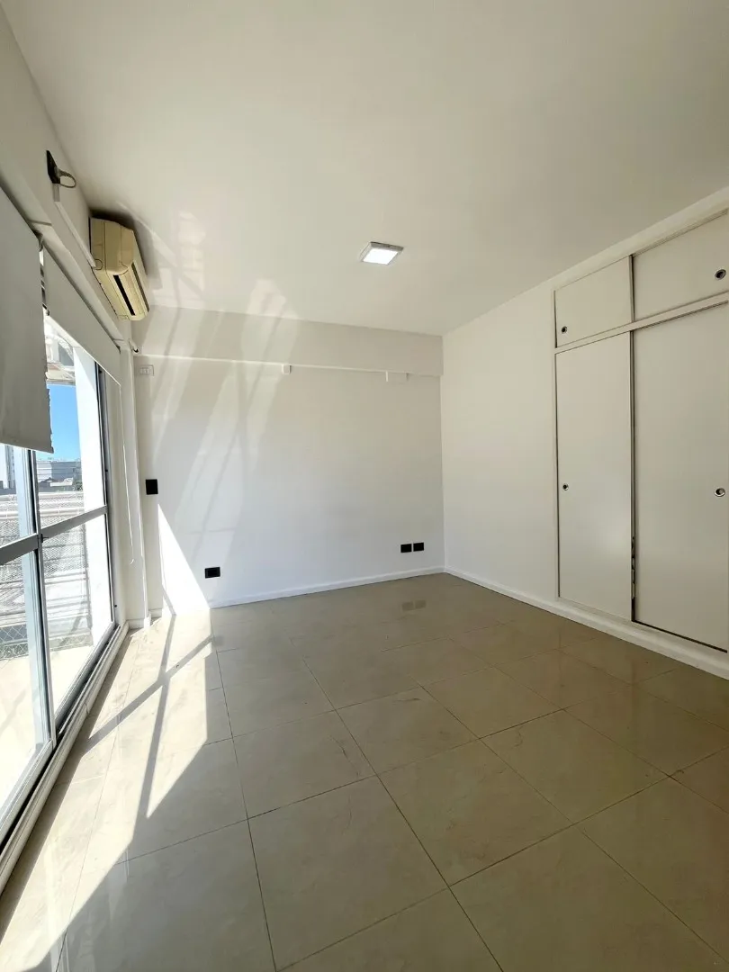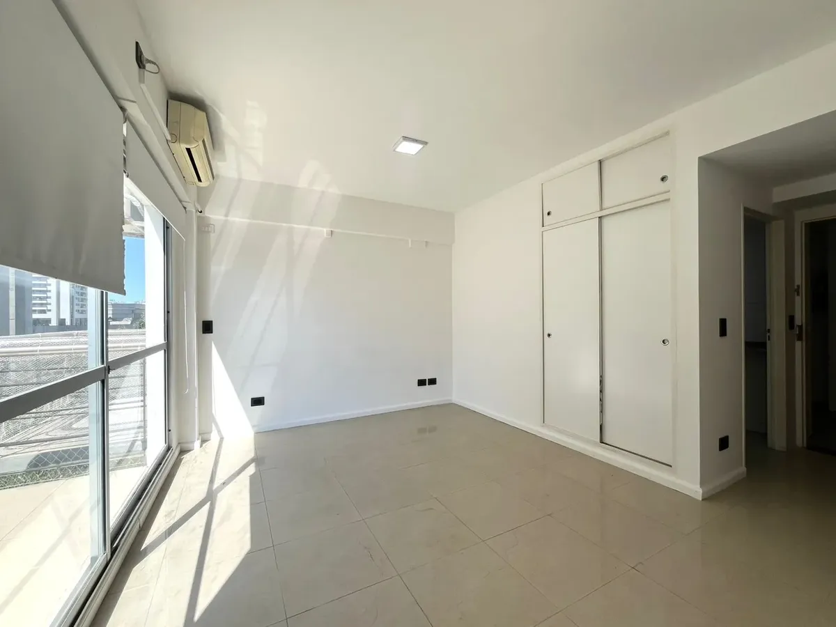 Studio apartment with a front balcony. It includes a semi-integrated kitchen, a full bathroom with a bathtub, built-in wardrobe space, and a split air-conditioning unit (hot and cold). Hot water is provided by a boiler. Located on Sánchez de Bustamante 600 in Almagro.