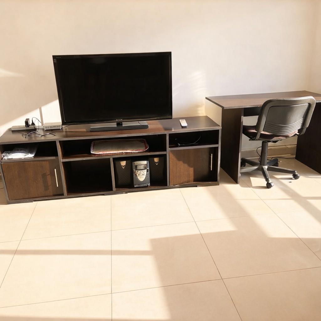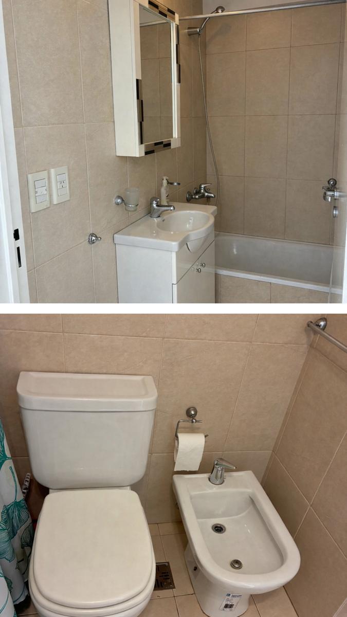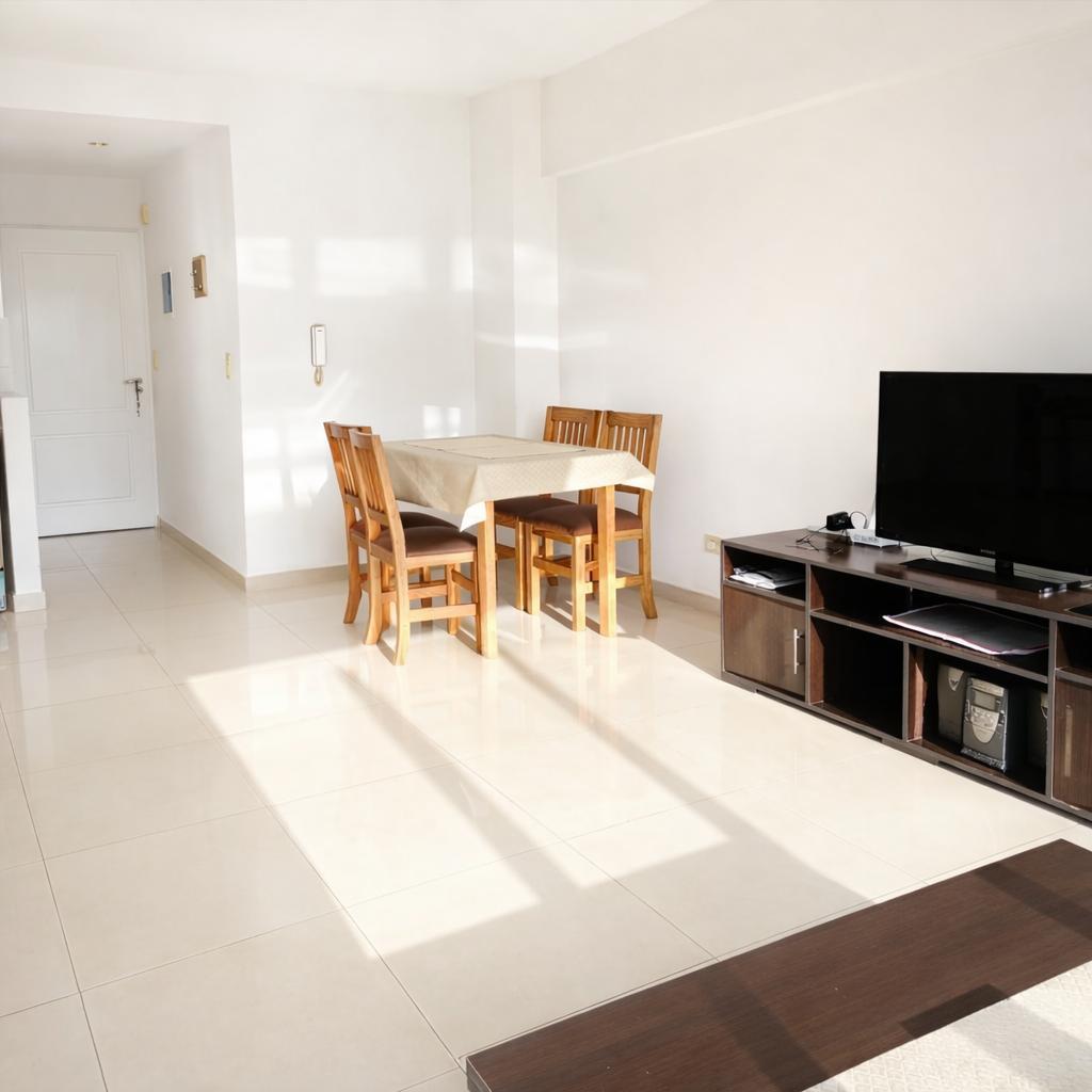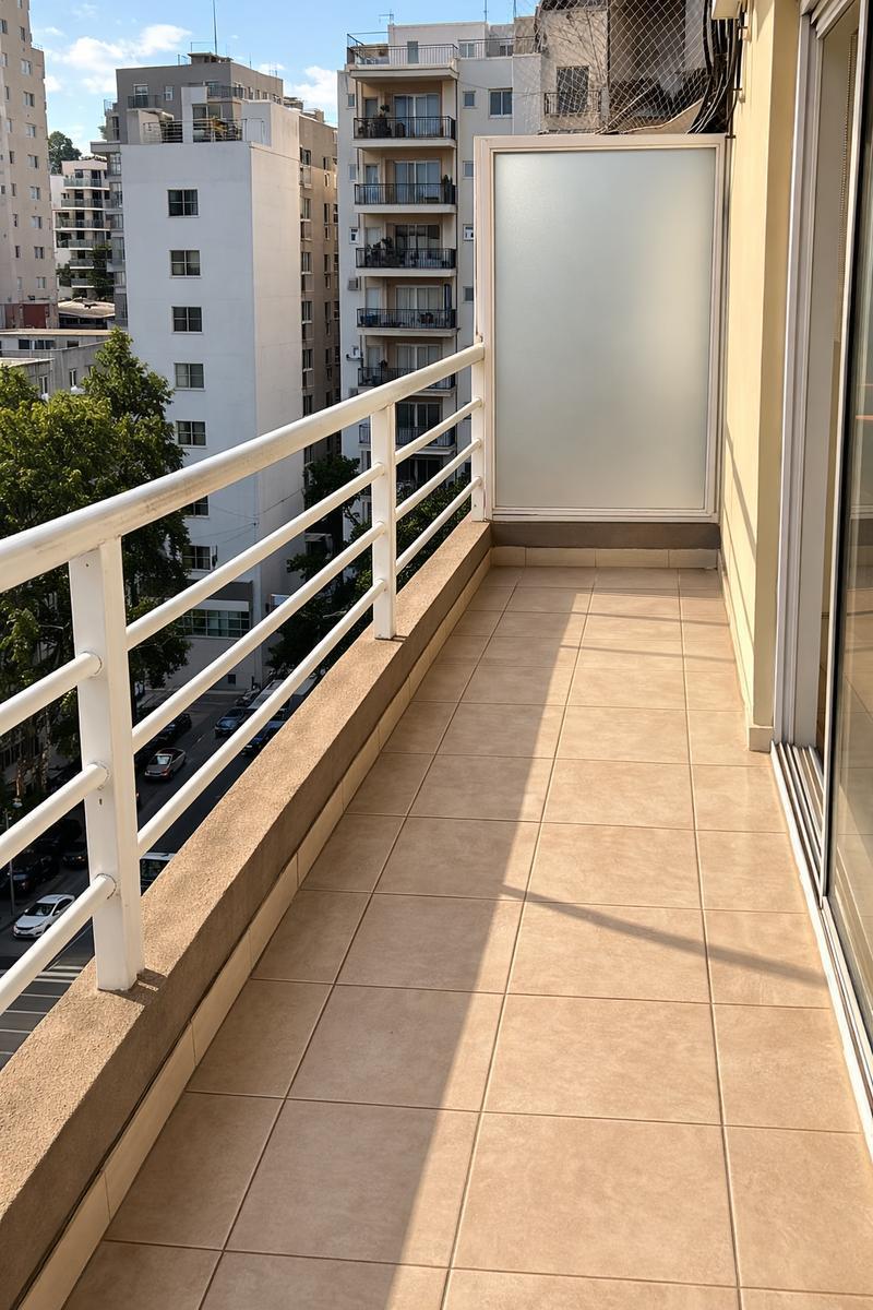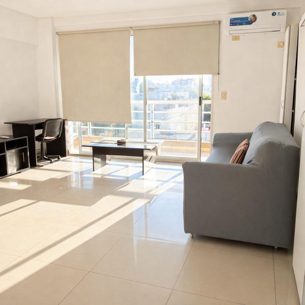 Furnished studio apartment in Almagro, courtyard-facing (contrafrente), with a long balcony. It includes air conditioning, a Smart TV, an electric kitchen with lower and upper cabinets, and a fold-out bed; the bathroom is full. The building has laundry facilities, a communal room (SUM) and a gym.