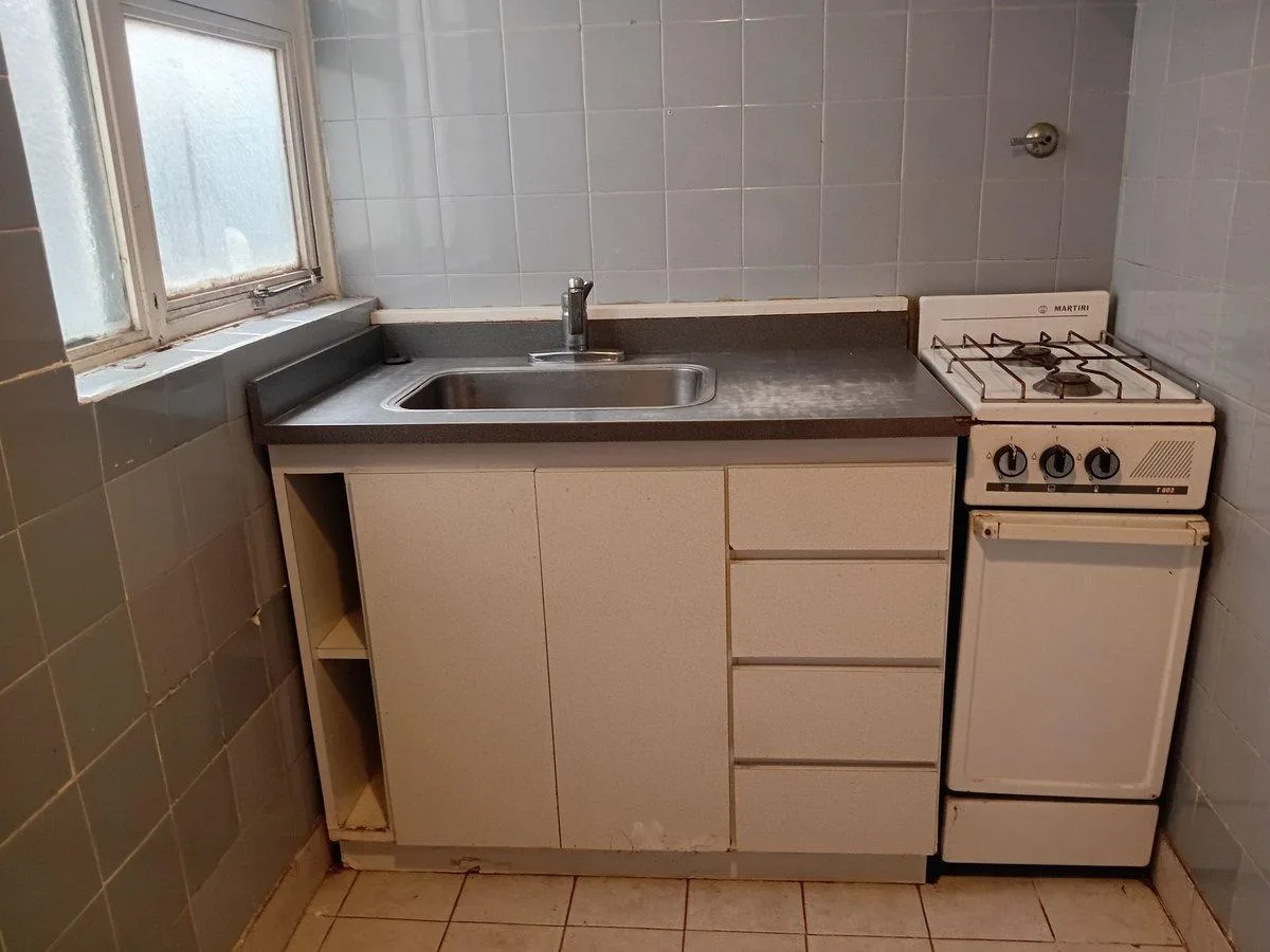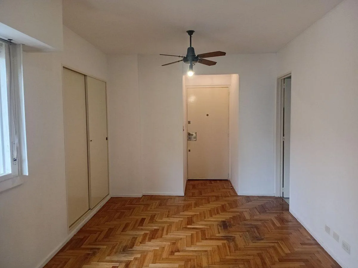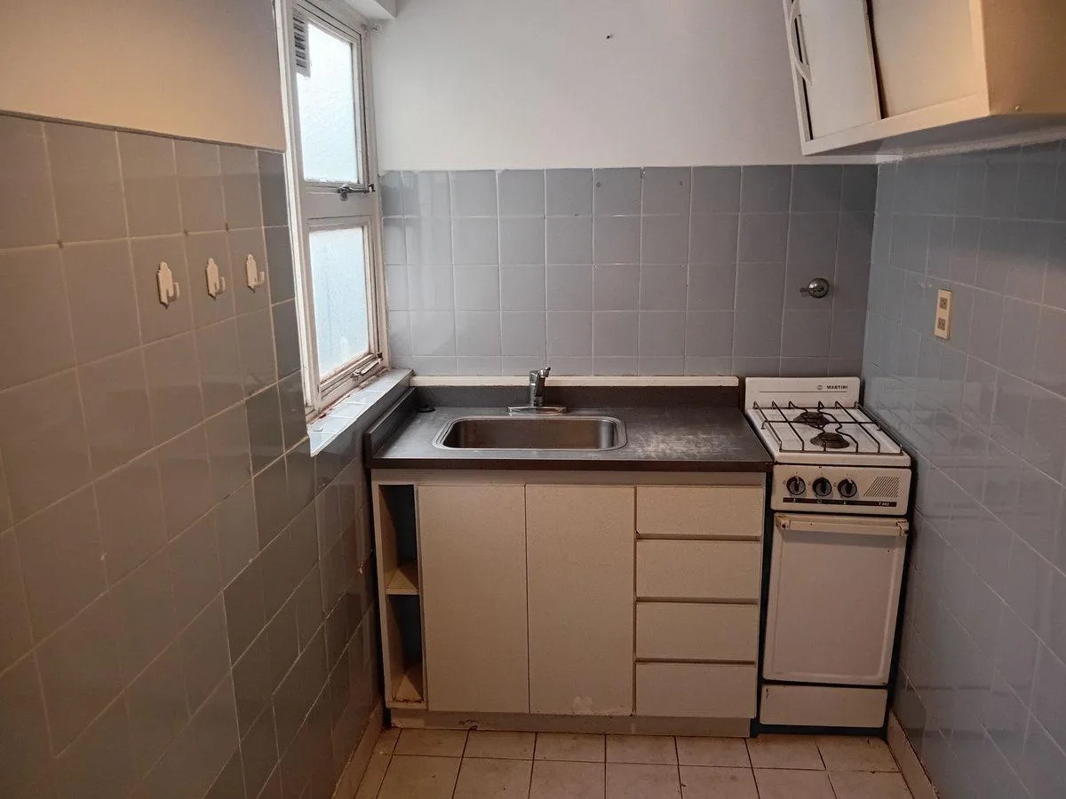 Studio apartment on the second floor with 27.7 m² total area in Almagro. The unit has a separate kitchen, a full bathroom with a bathtub, and parquet flooring in the main room. Gas water heater and a gas oven with two burners; fitted lower cabinet with drawers and a double sliding-door pantry, plus connections for a washing machine. Building fees (expensas) are stated as ARS 146,026 based on a March 2026 settlement. Rental terms: monthly rent USD 300, paid by transfer in US dollars, with one adv