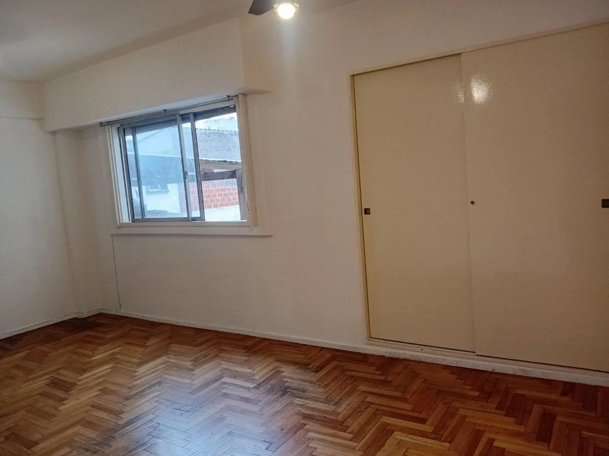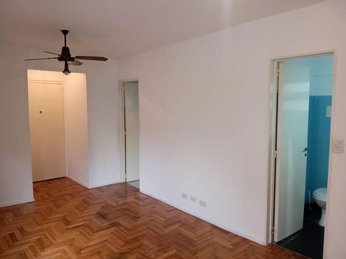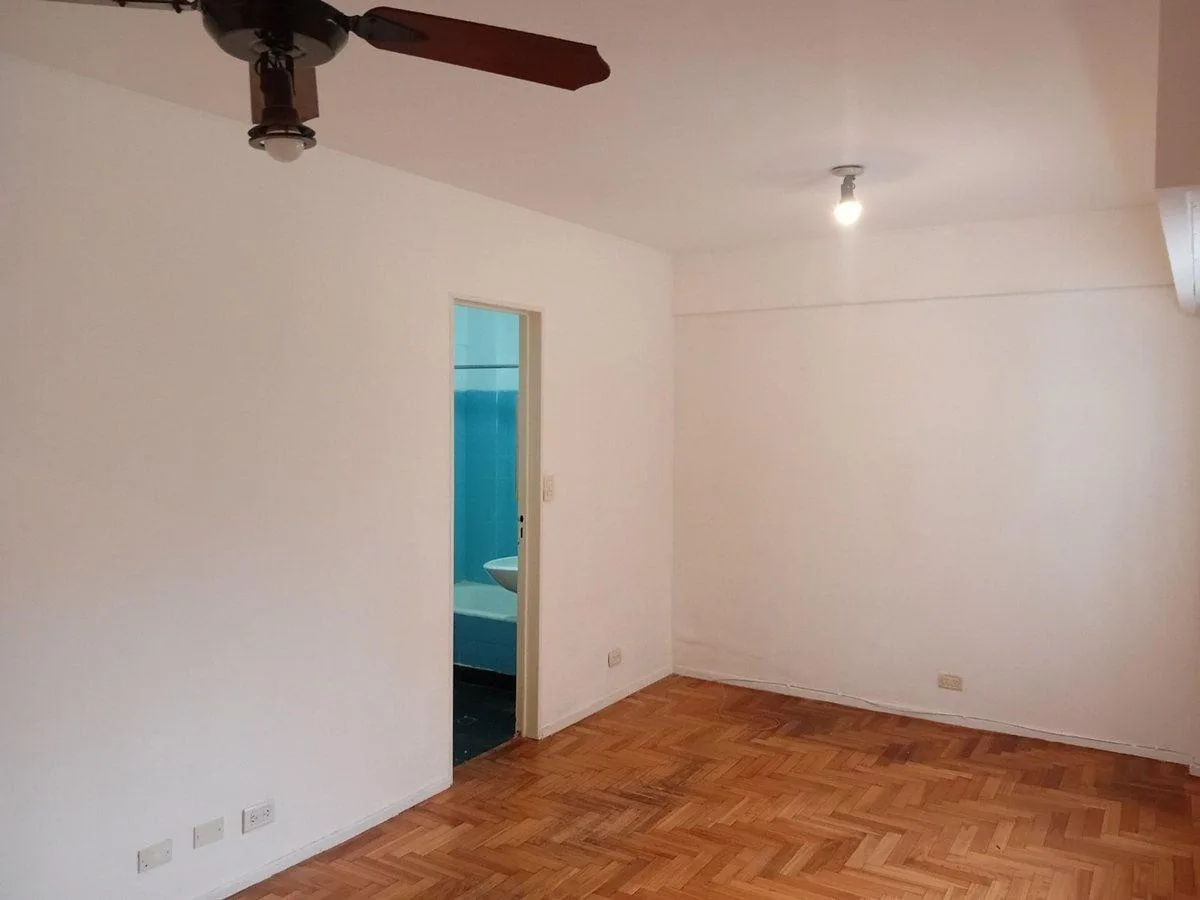 Studio apartment on the second floor with 27.7 m² total area in Almagro. The unit has a separate kitchen, a full bathroom with a bathtub, and parquet flooring in the main room. Gas water heater and a gas oven with two burners; fitted lower cabinet with drawers and a double sliding-door pantry, plus connections for a washing machine. Building fees (expensas) are stated as ARS 146,026 based on a March 2026 settlement. Rental terms: monthly rent USD 300, paid by transfer in US dollars, with one adv