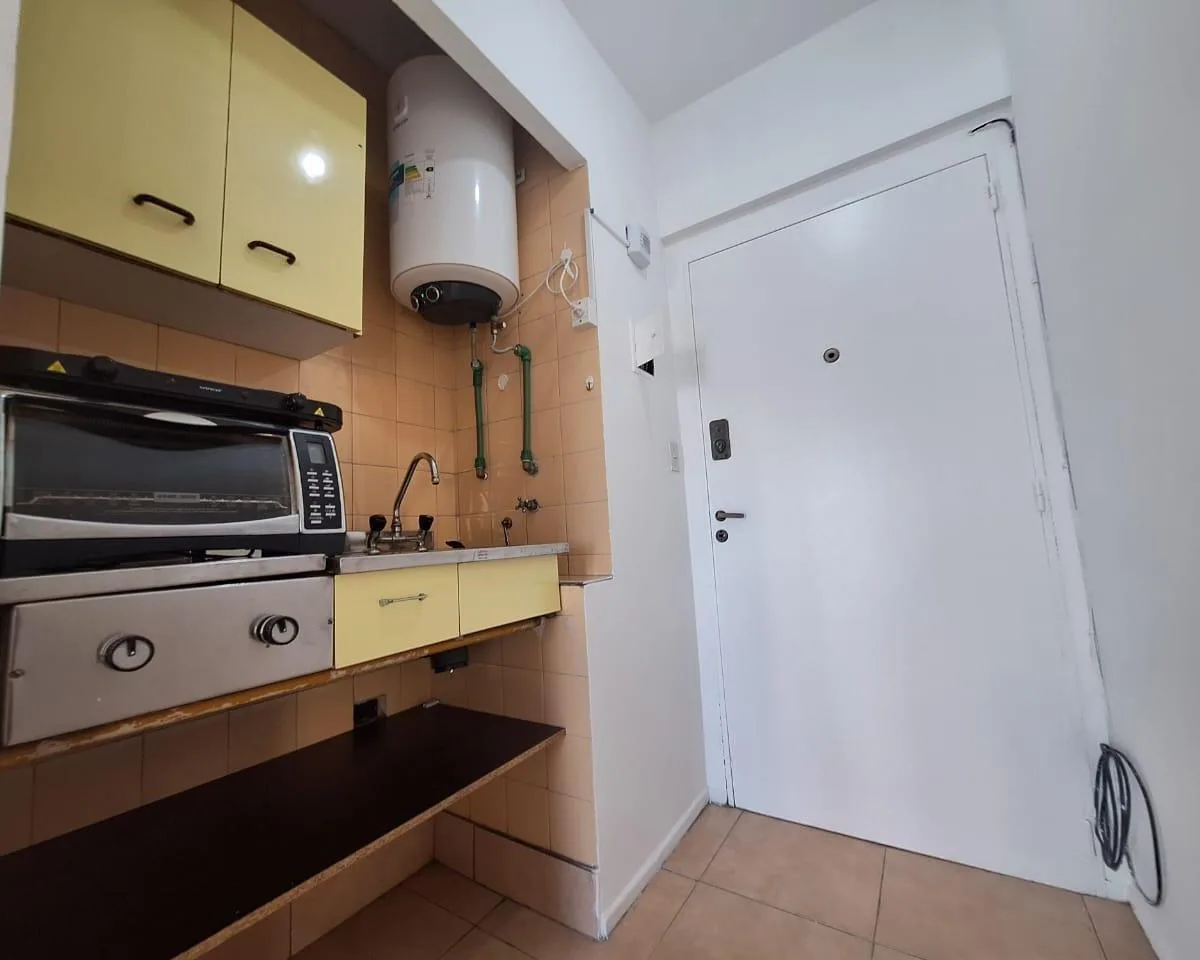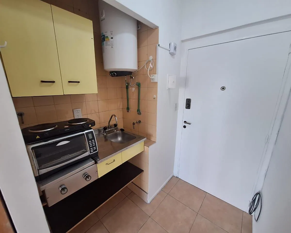 Studio apartment on the 8th floor in a tower building in Almagro, with a large balcony facing Av. Corrientes and an open view. The kitchen includes an electric hotplate/anafe and an electric oven. There is a complete bathroom, electric hot water from a tank/thermostat (no gas), air conditioning, and a storage wardrobe. Maximum occupancy stated for 1–2 people; rental term 2 years with quarterly updates based on IPC and a rental guarantee bond. Building fees, taxes, utilities and photos are descri