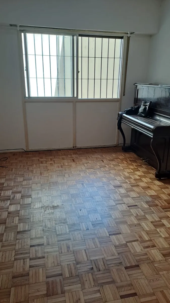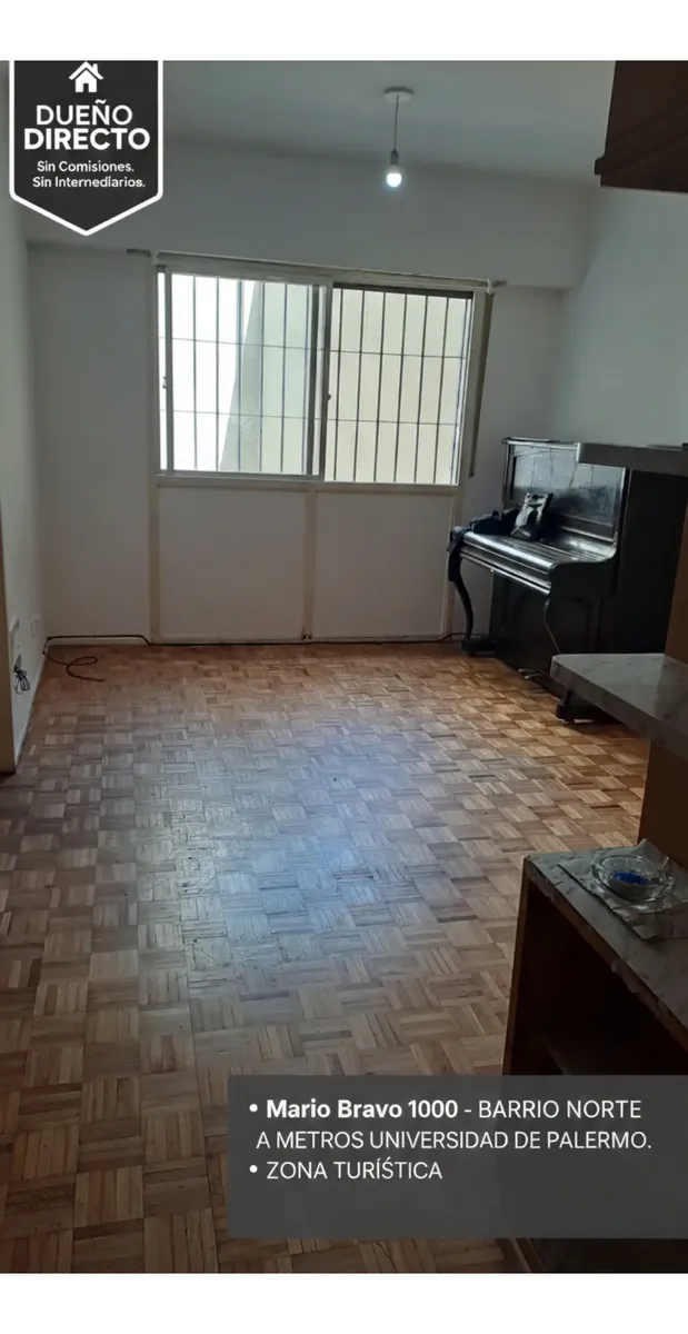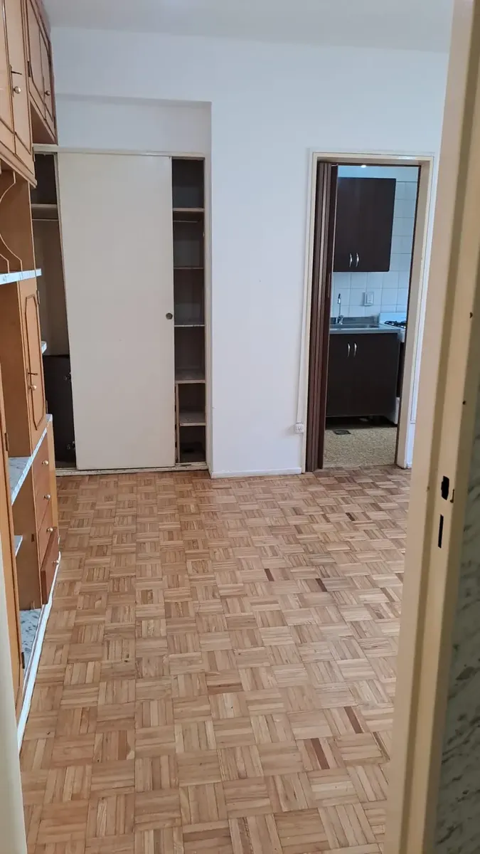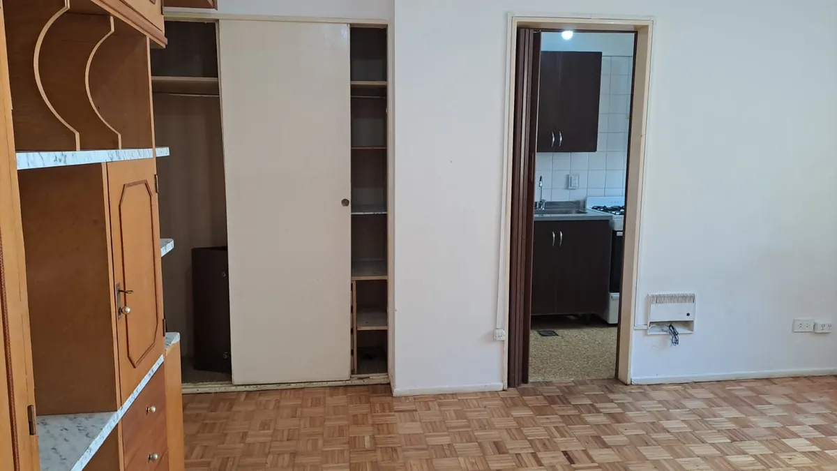 Studio apartment of 28 m² at Mario Bravo 1000 in Almagro. It has a large window for daylight, parquet laminate flooring, and two floor-to-ceiling wardrobes plus a wooden room divider with shelving. Separate equipped kitchen with gas cooker (Orbis), space for a washing machine (lavarropas), and a dedicated sink; full bathroom with bathtub. Monthly rent is ARS 480,000; building fees are approximately ARS 100,000. Utilities and municipal taxes are paid by the tenant (electricity, gas, AYSA and ABL)