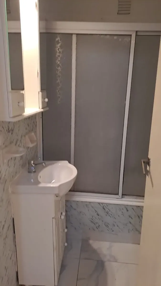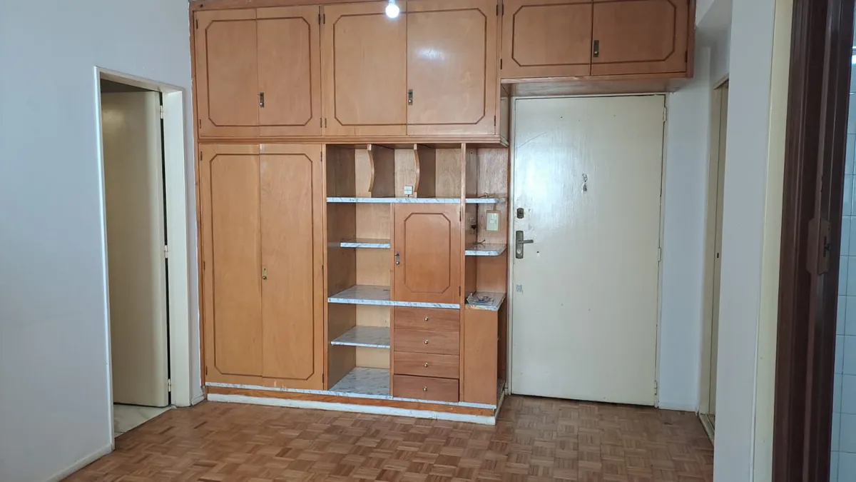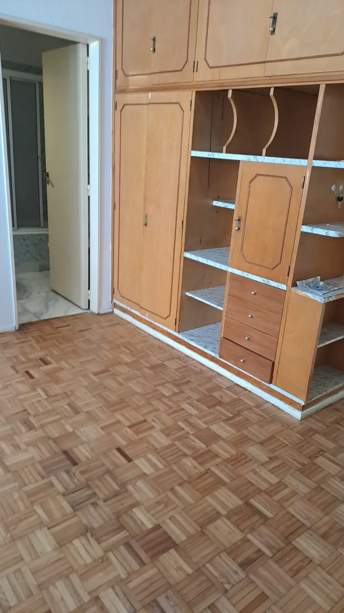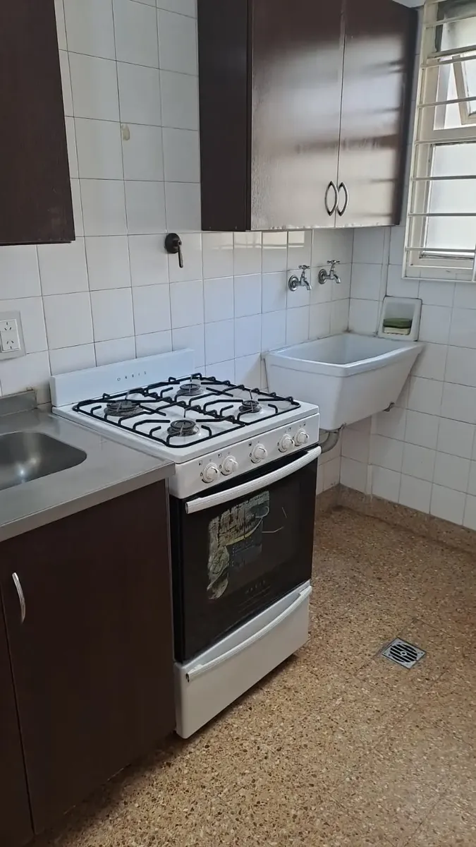 Studio apartment of 28 m² at Mario Bravo 1000 in Almagro. It has a large window for daylight, parquet laminate flooring, and two floor-to-ceiling wardrobes plus a wooden room divider with shelving. Separate equipped kitchen with gas cooker (Orbis), space for a washing machine (lavarropas), and a dedicated sink; full bathroom with bathtub. Monthly rent is ARS 480,000; building fees are approximately ARS 100,000. Utilities and municipal taxes are paid by the tenant (electricity, gas, AYSA and ABL)