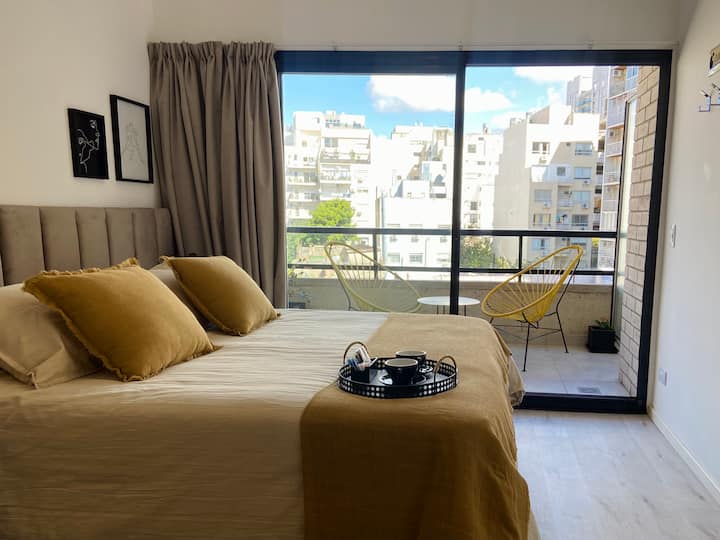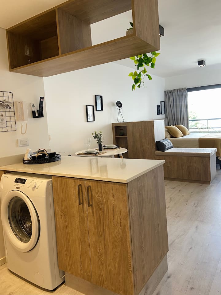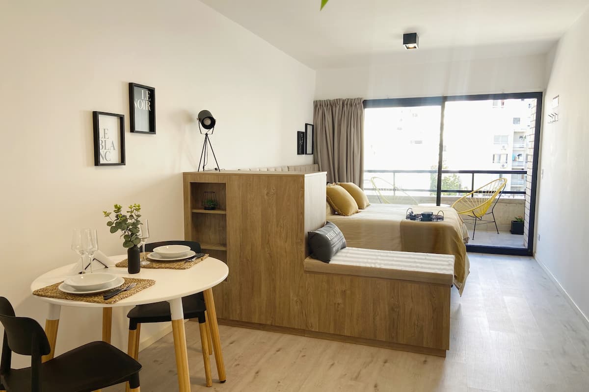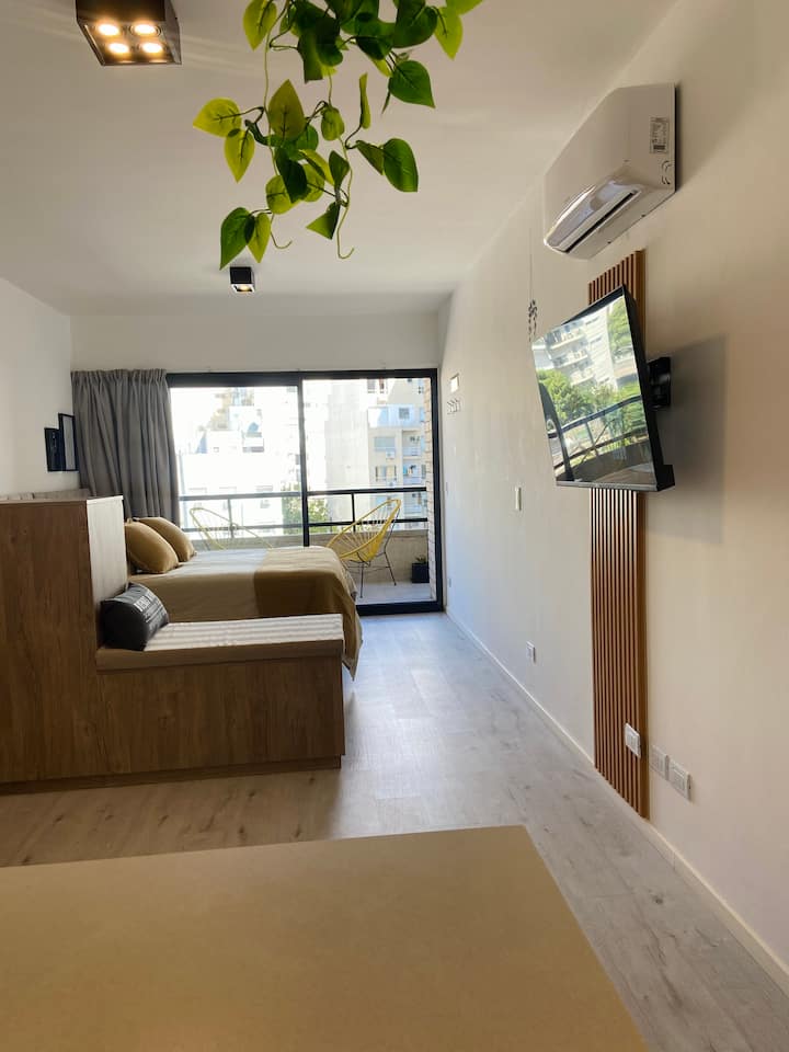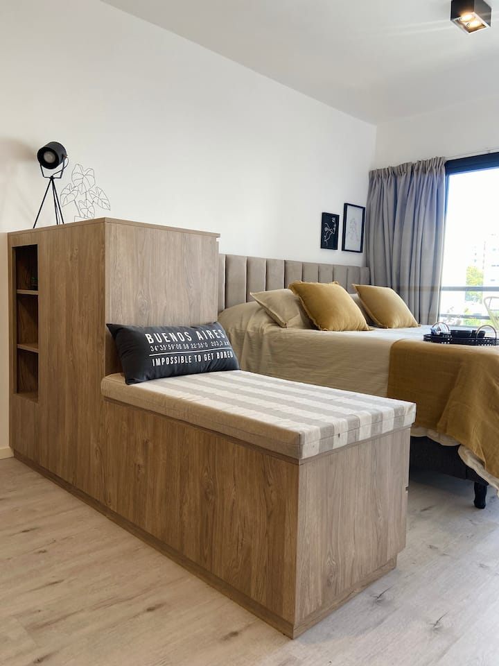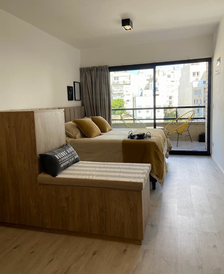 Modern studio apartment with full equipment. Description mentions a location in the “Palermo Queen” neighbourhood and availability of bars, theatres, shopping and tango dance halls nearby.