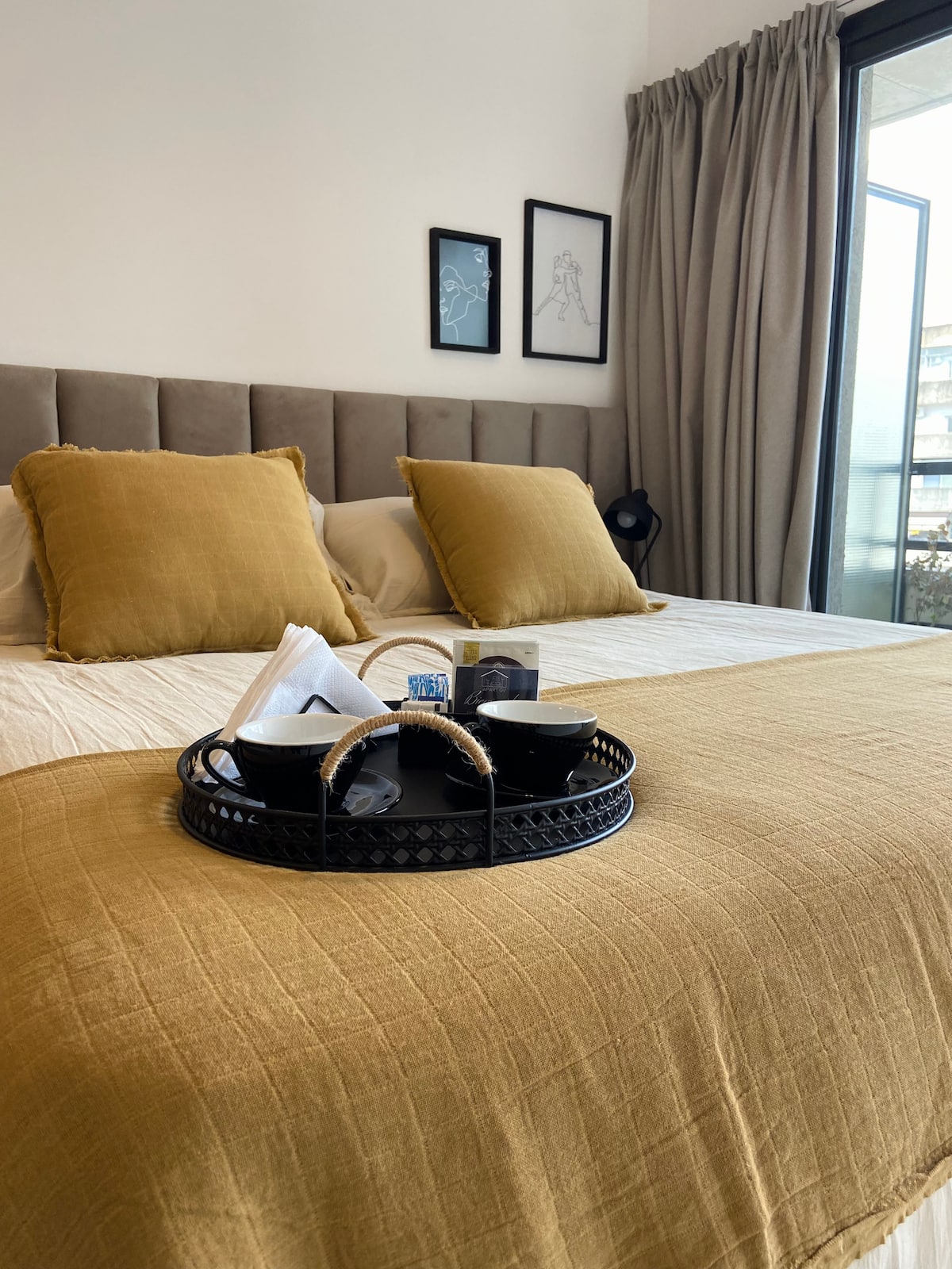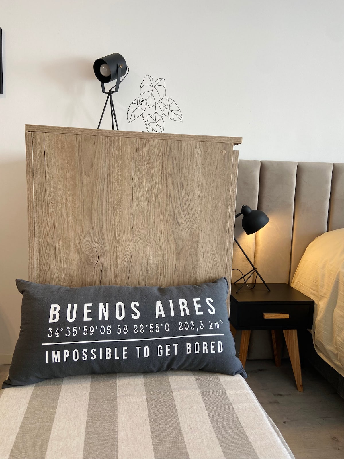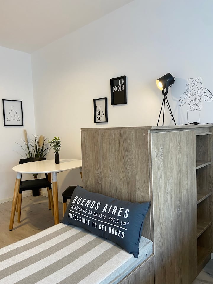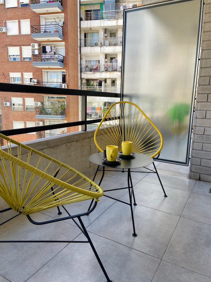 Modern studio apartment with full equipment. Description mentions a location in the “Palermo Queen” neighbourhood and availability of bars, theatres, shopping and tango dance halls nearby.